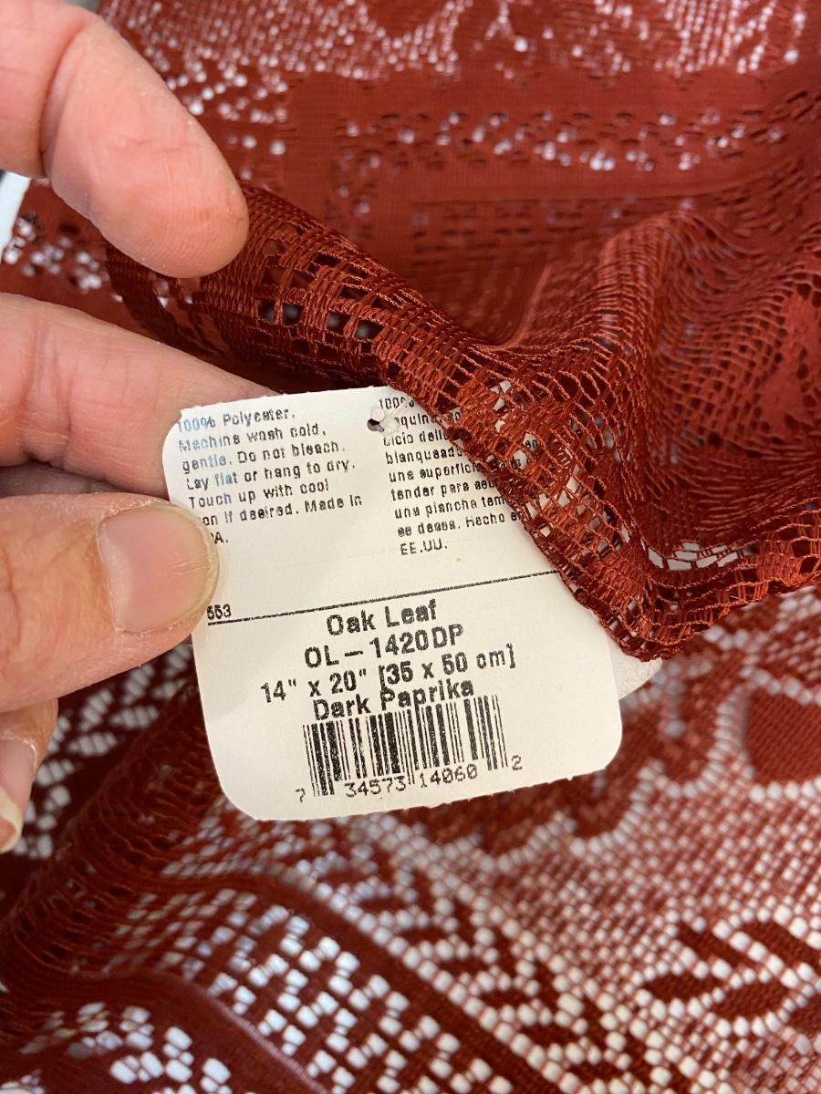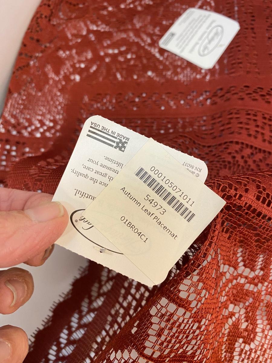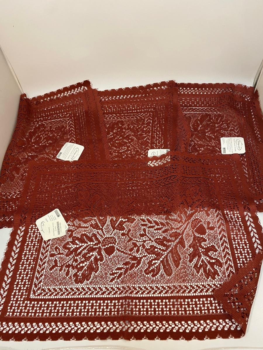 Set of 4 New with Tags Dark Red Oak Leaf Acorn Pattern Lace Placemats. Good condition, all 4 have the original tags attached.