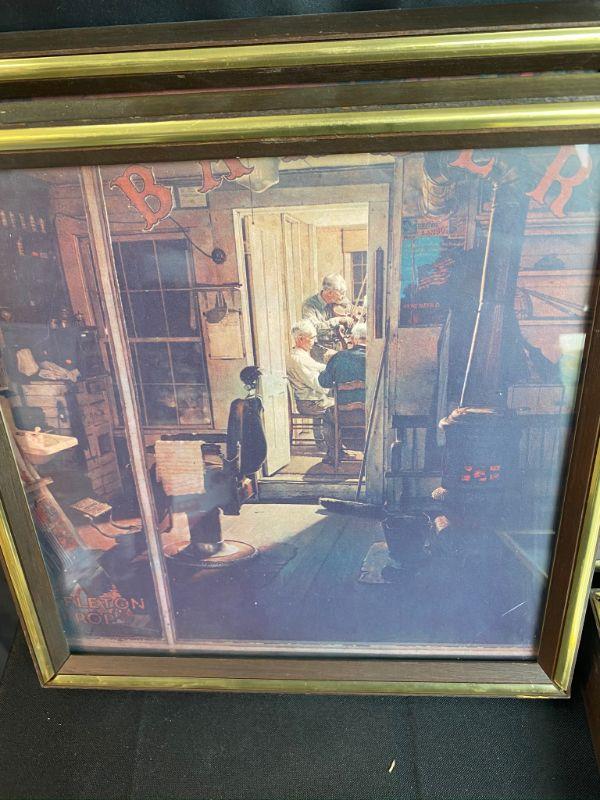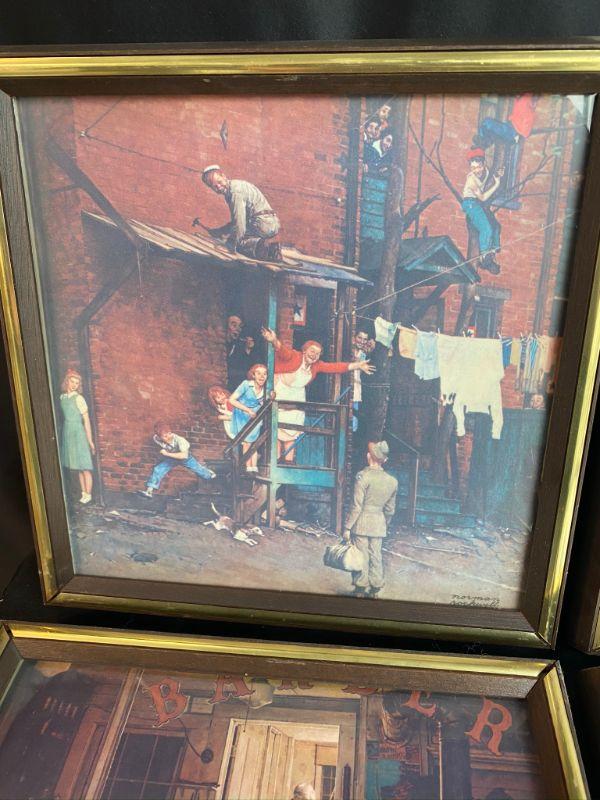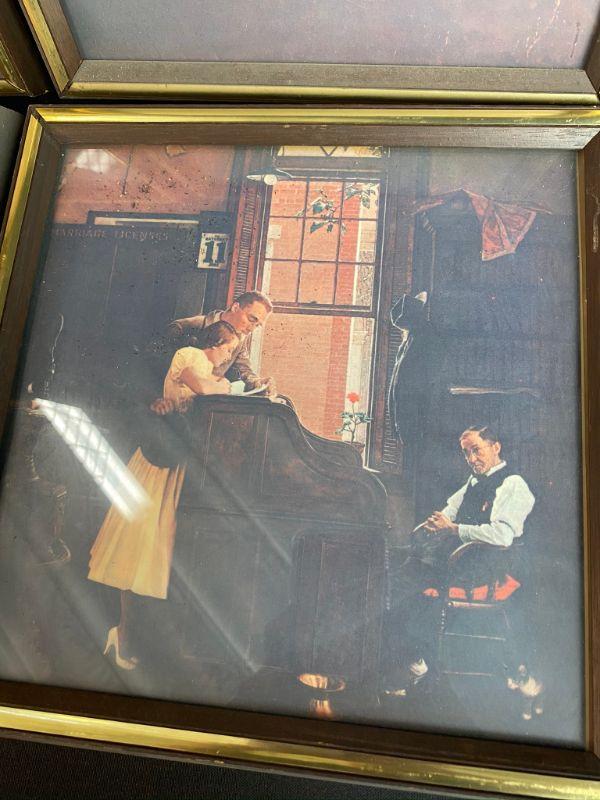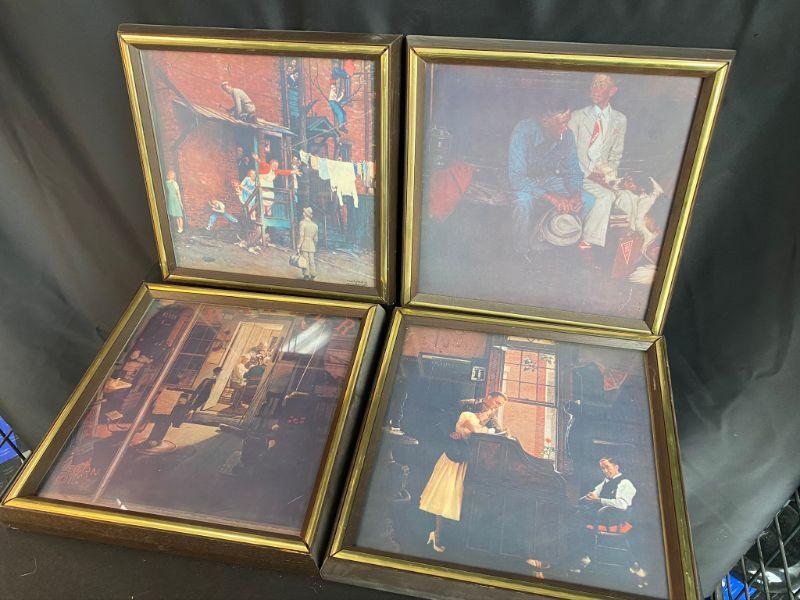 Set of 4 Norman Rockwell prints. About 12" square framed. Need to be cleaned up.