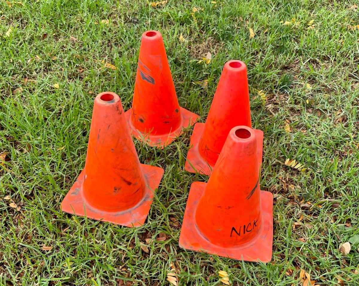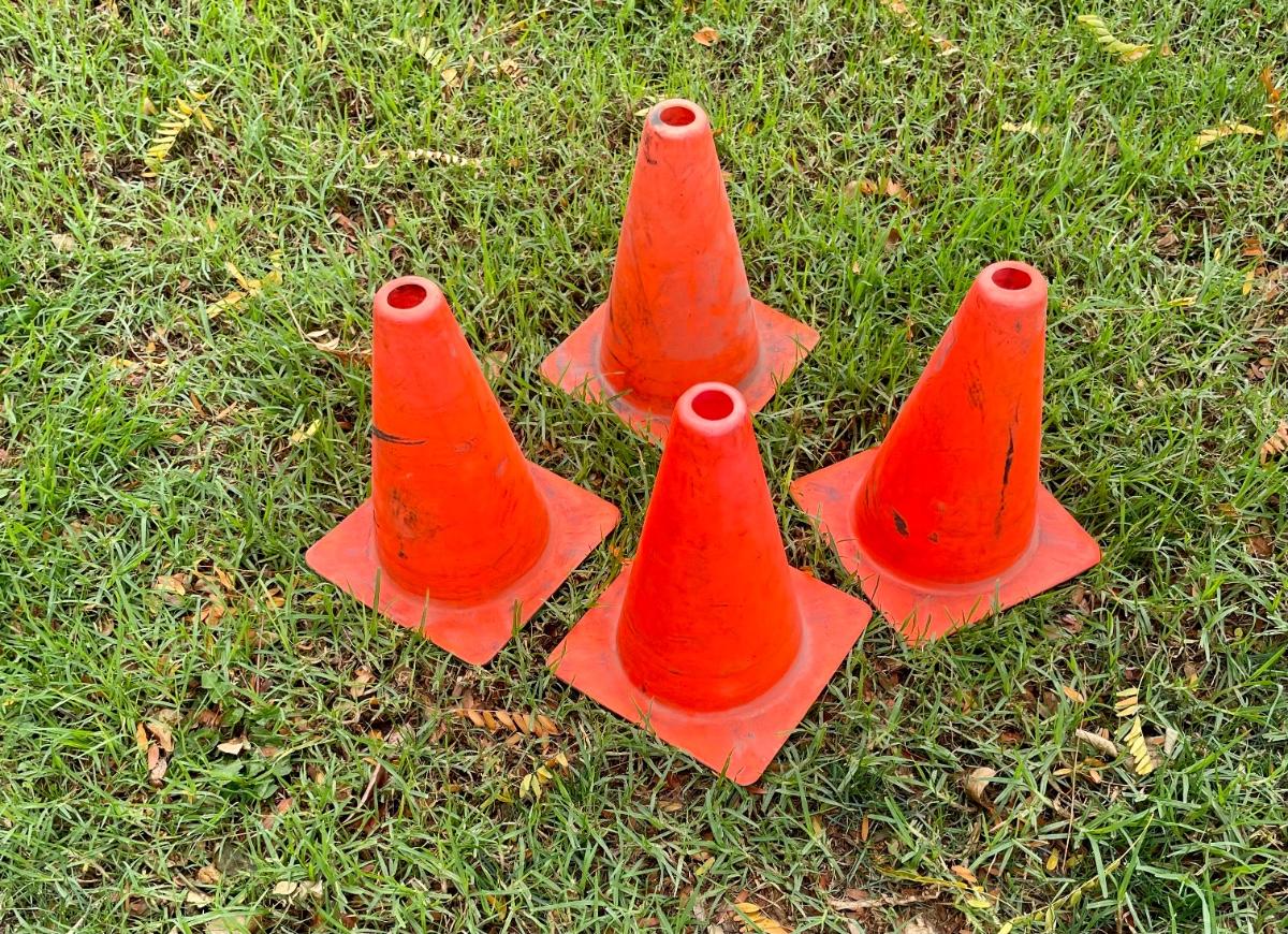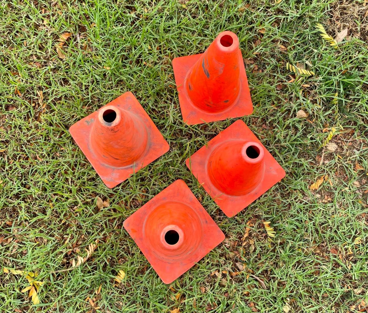 4 traffic-style cones in bright orange. Approx 12” tall. Could be used for sports games or practices.