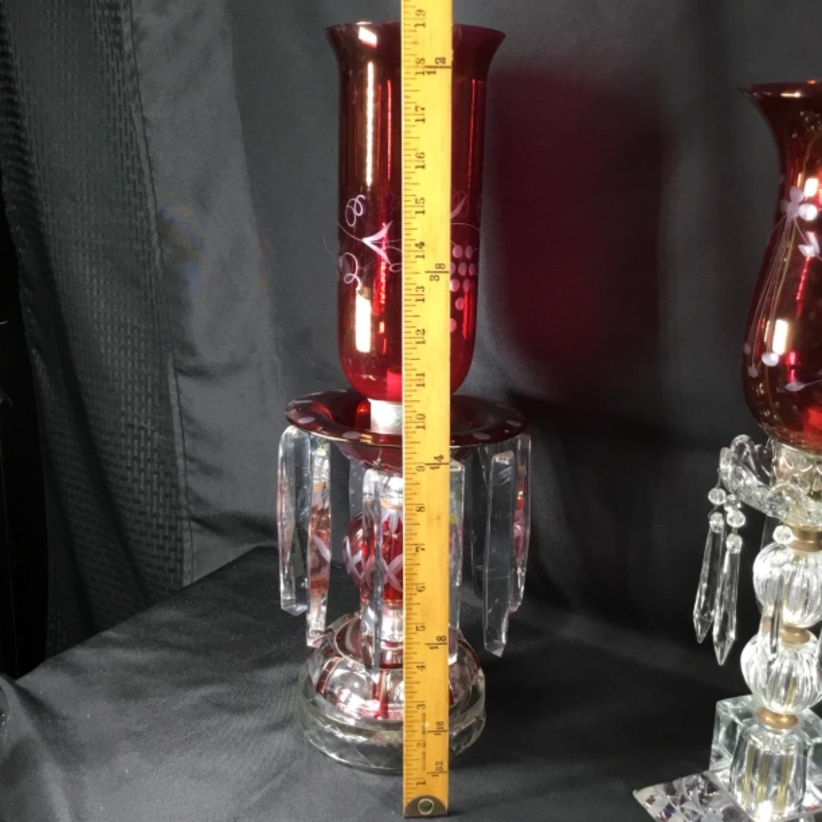 In excellent condition overall. The tall ones measure 18.75” and the shorter ones stand 17.5” tall. They were turned into electric lamps at some point. All of these are unmarked and have their wires snipped; see pictures. May have flea bite nicks in the crystals but no major chips or damage noticed.
