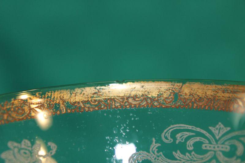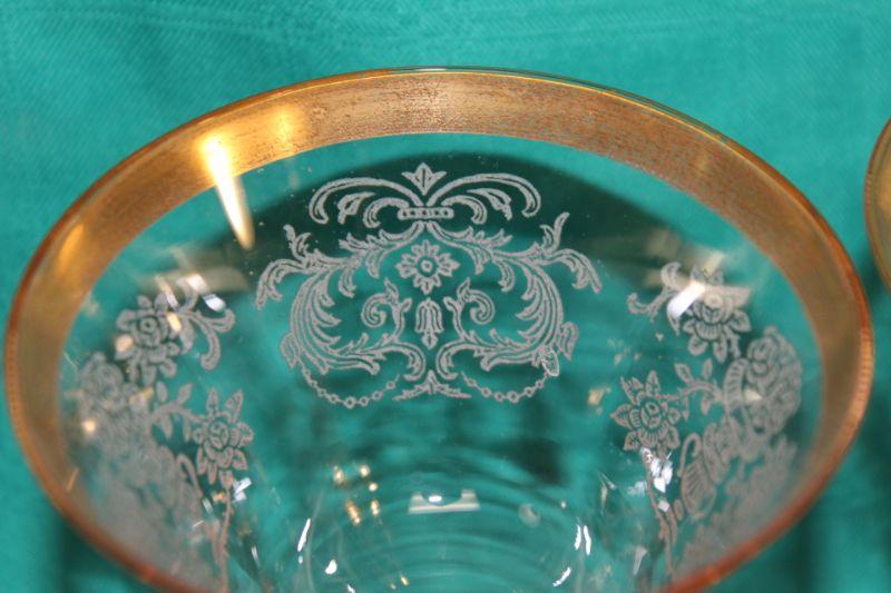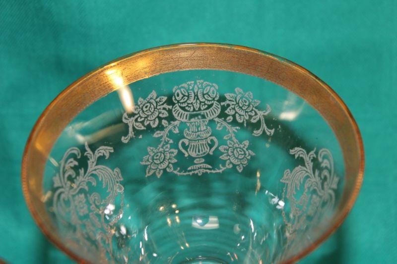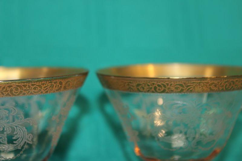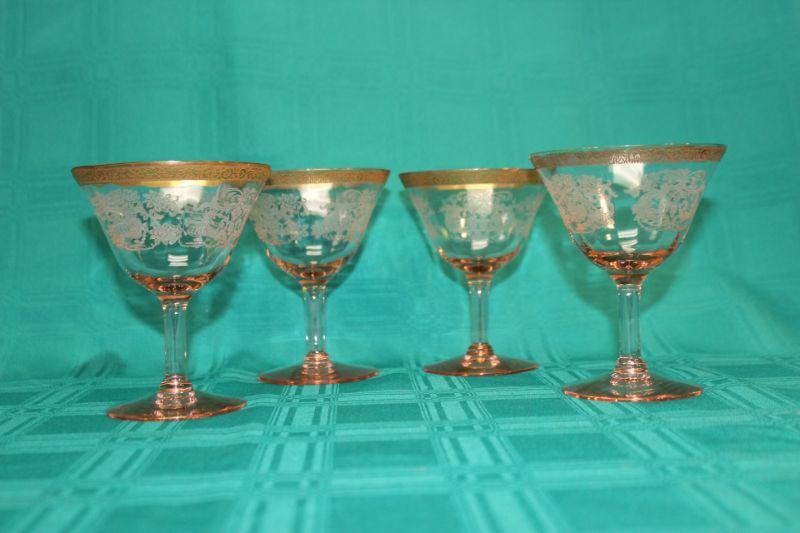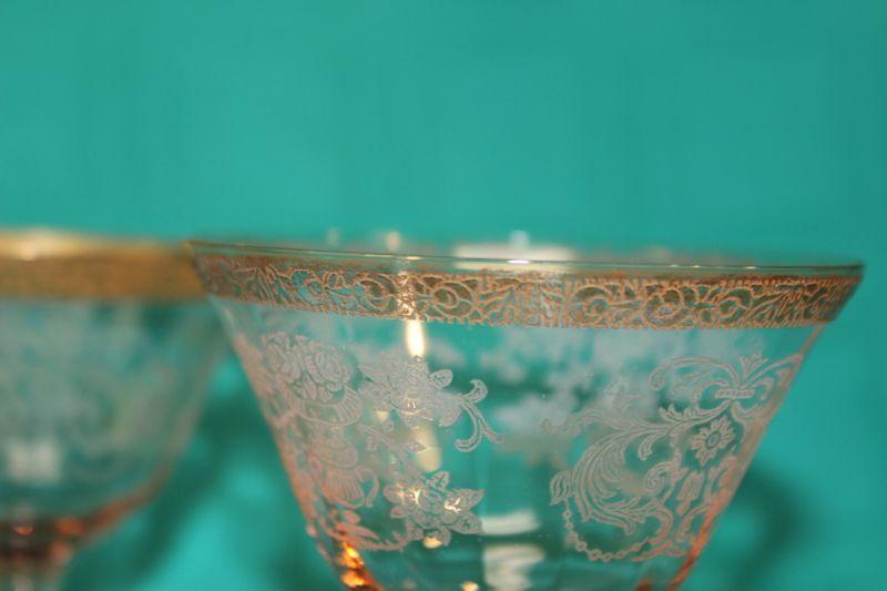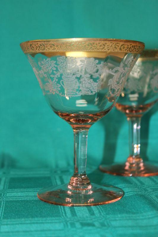 Small pale pink wine glasses. Frosted pattern with gold accents. One glass has the smallest chip, I tried to photograph but it is that small it is hard to see.