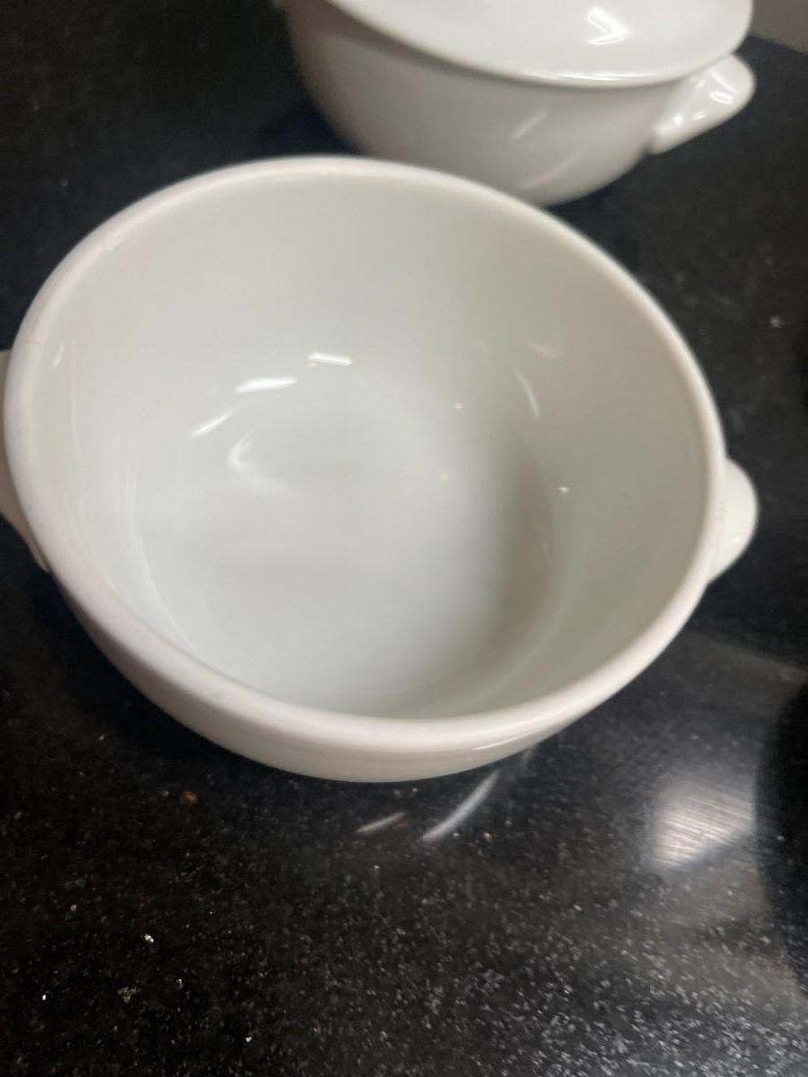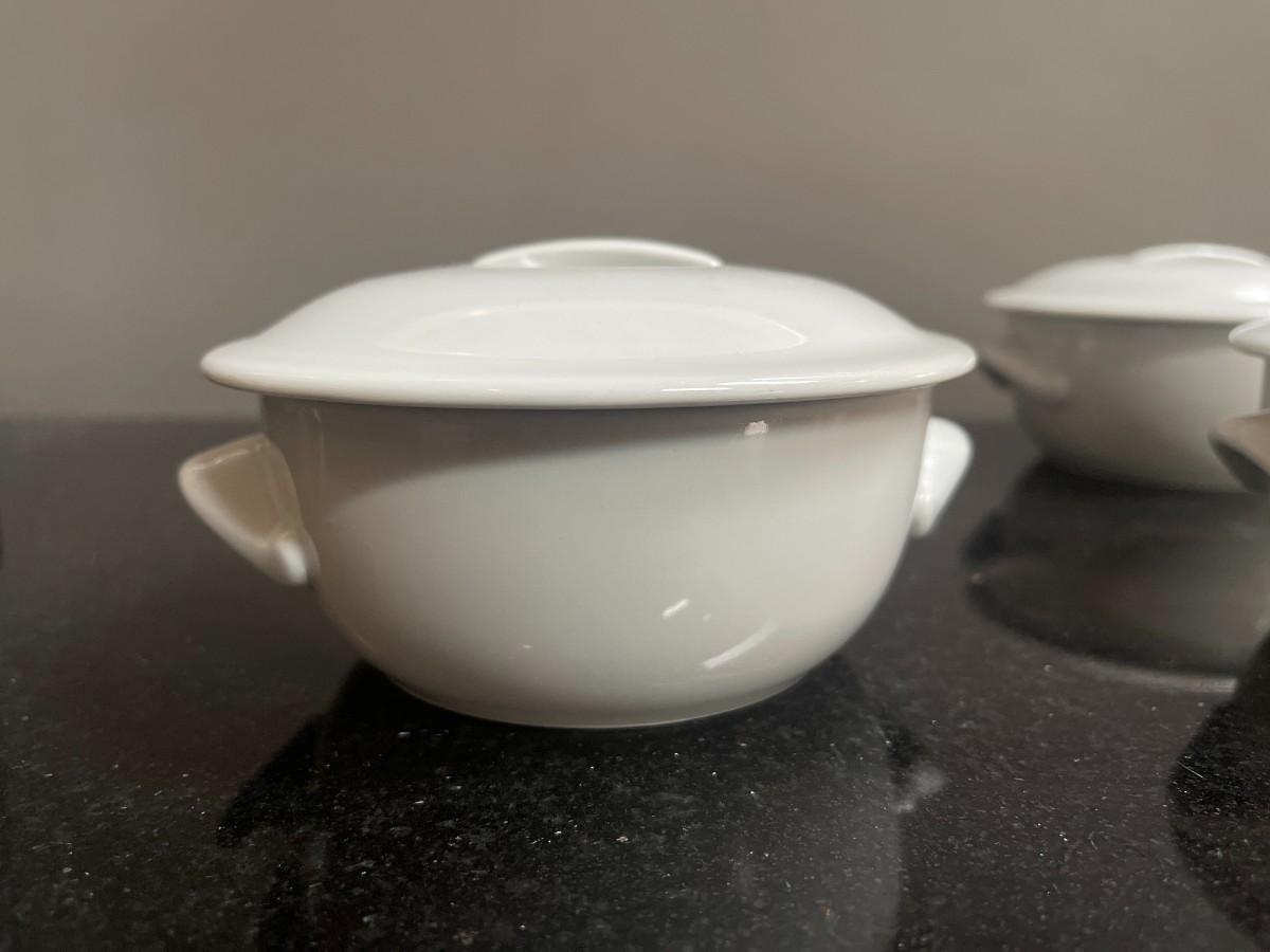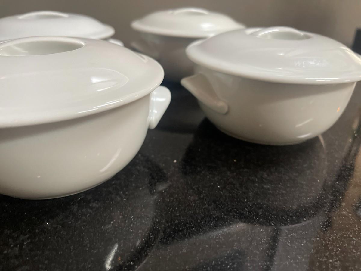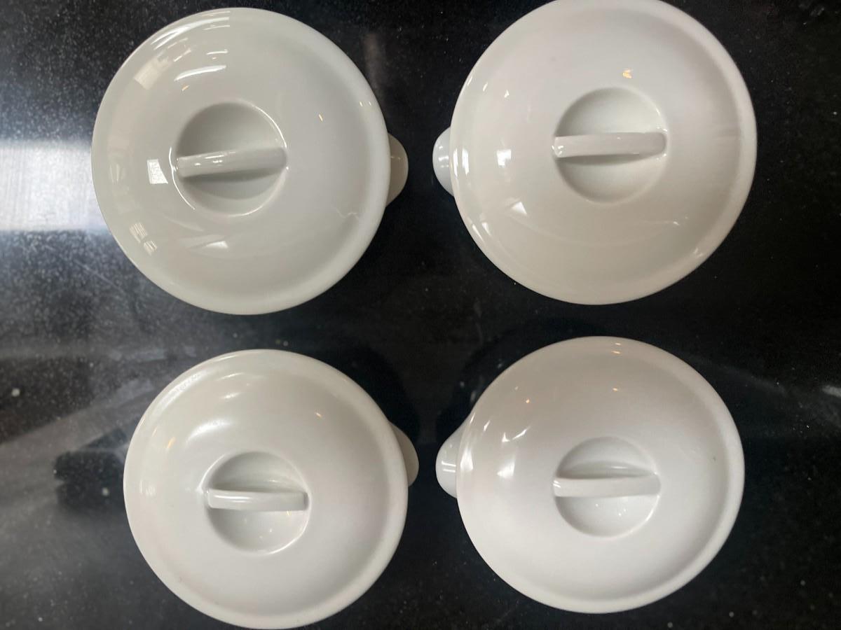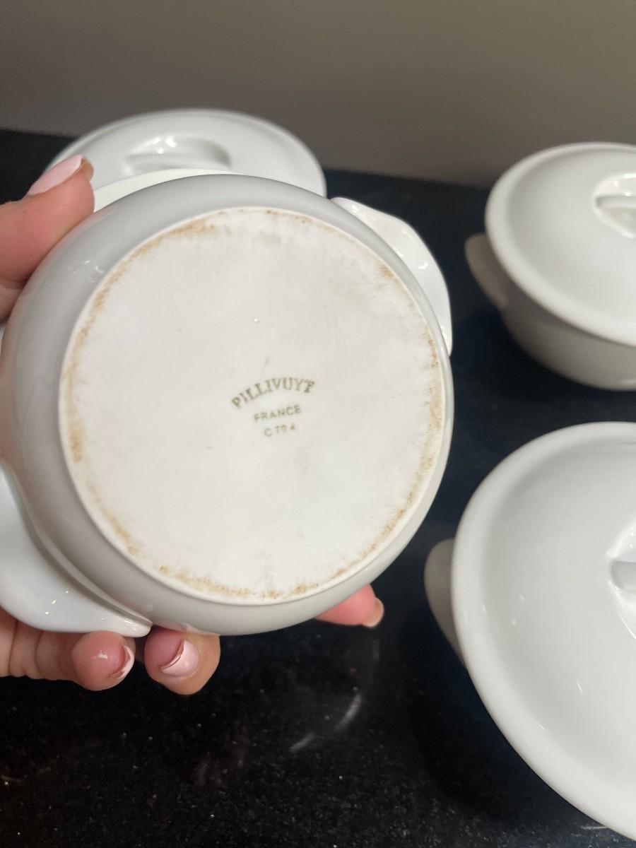 Set of 4 Pillivuyt White Covered Handled Porcelain Soup Bowls. Just for reference a set of 4 classic onion soup bowls by Pillivuyt retails for $152.