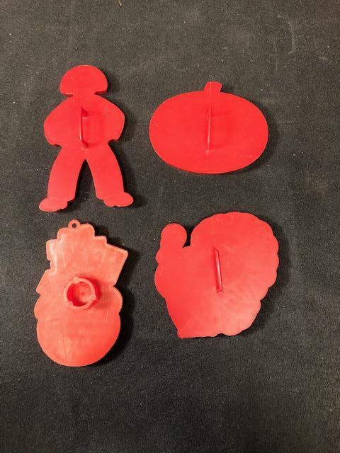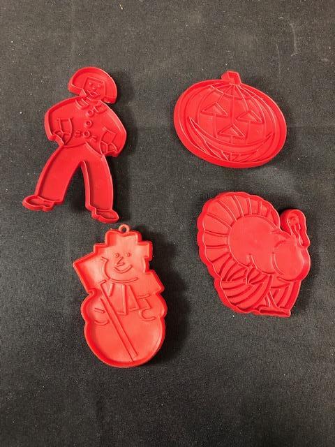 Set of 4 cookie cutters. Red plastic stamp like cutters. Jack-o-lantern, turkey, snowman, and a man.