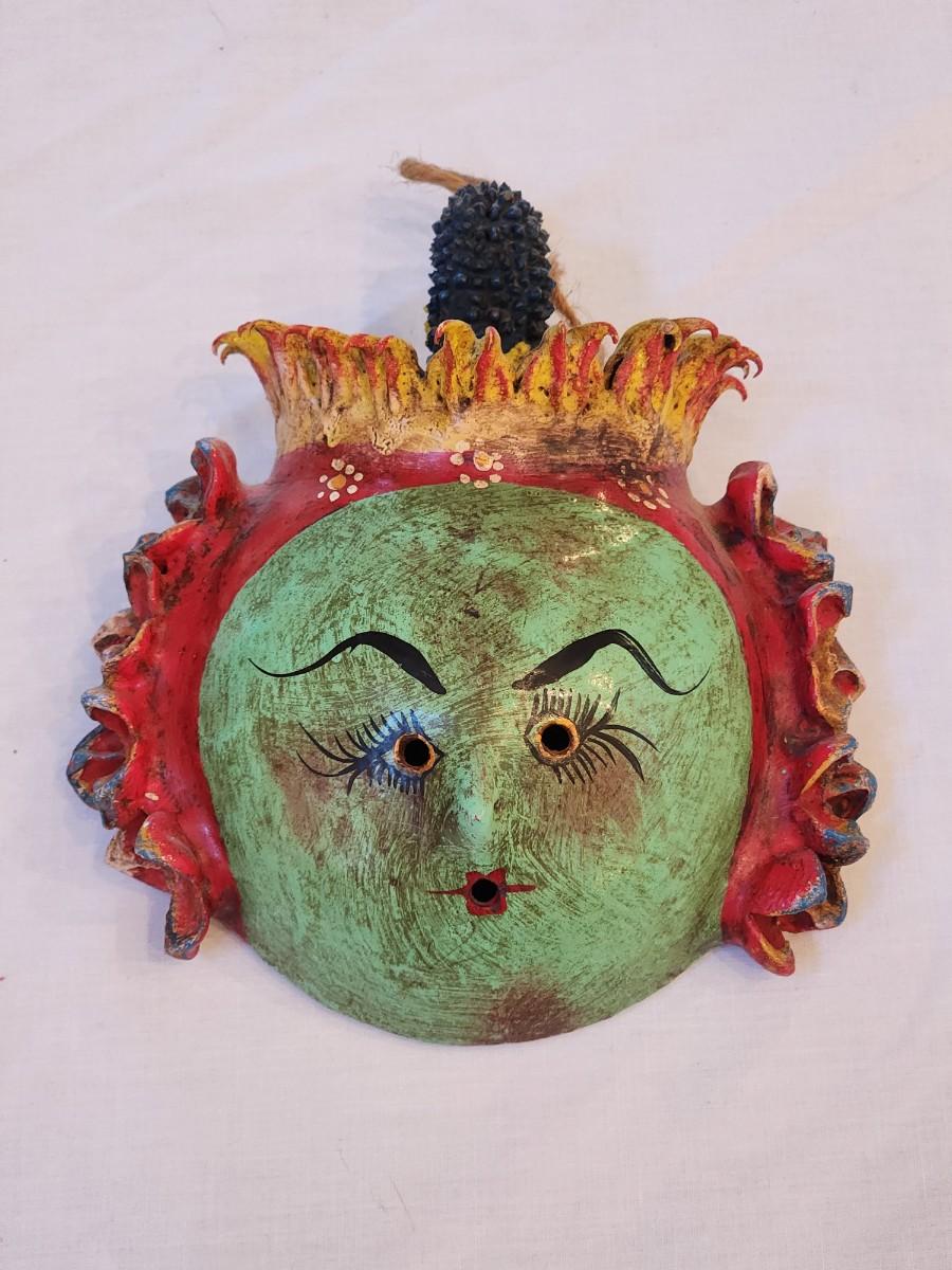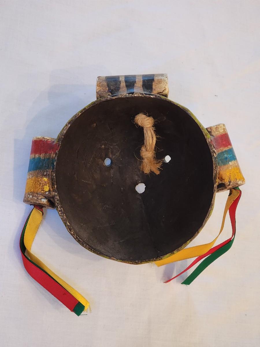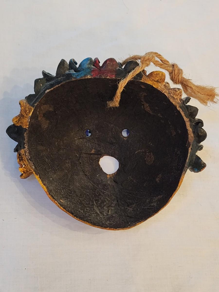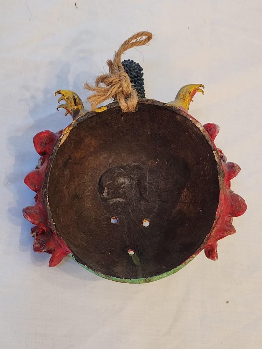Decorative masks made from the coconut shell and then built up with clay and other seed pods or leaves.