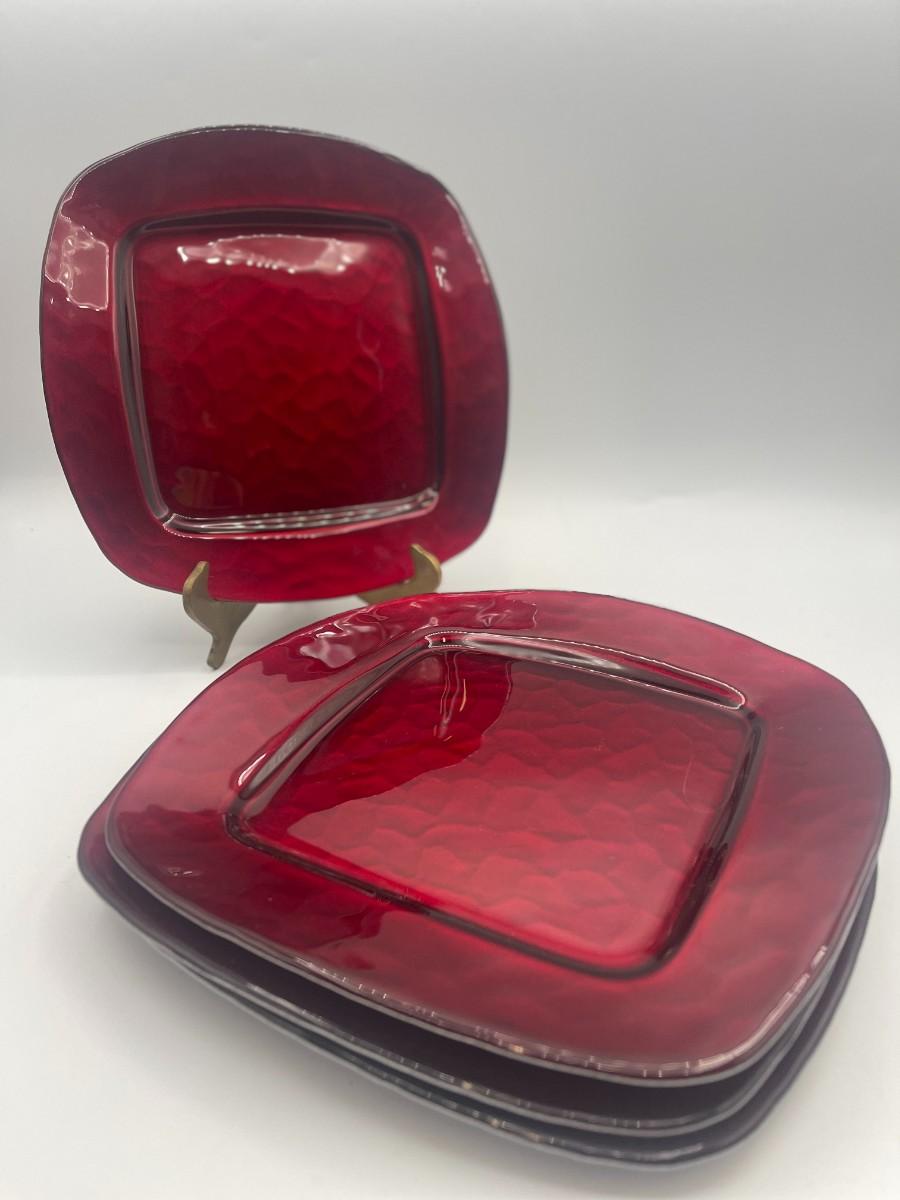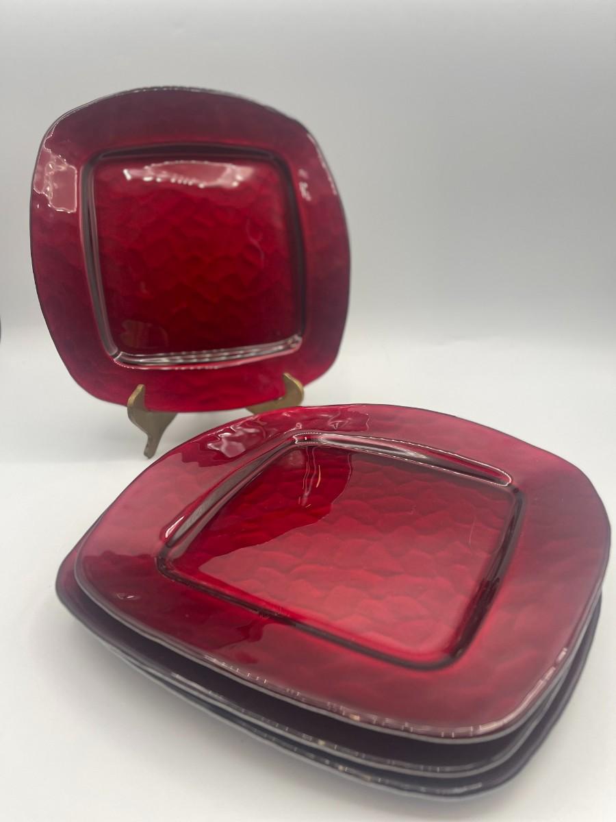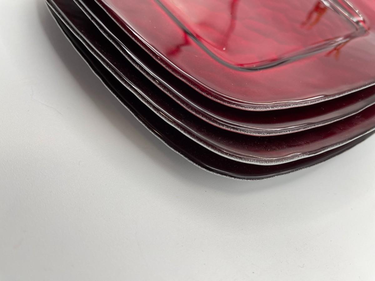 Set of 4 red enamel on metal plates, 8" . Like new condition.