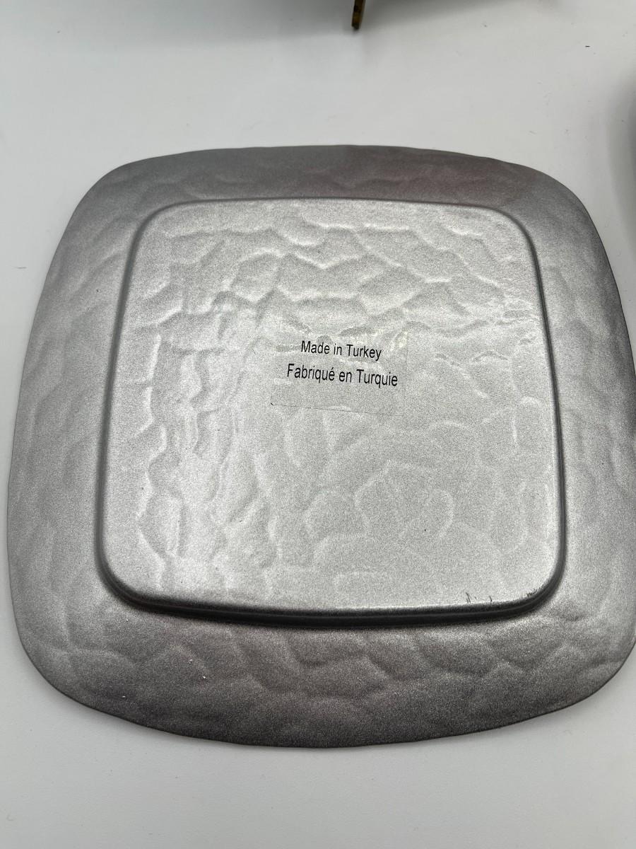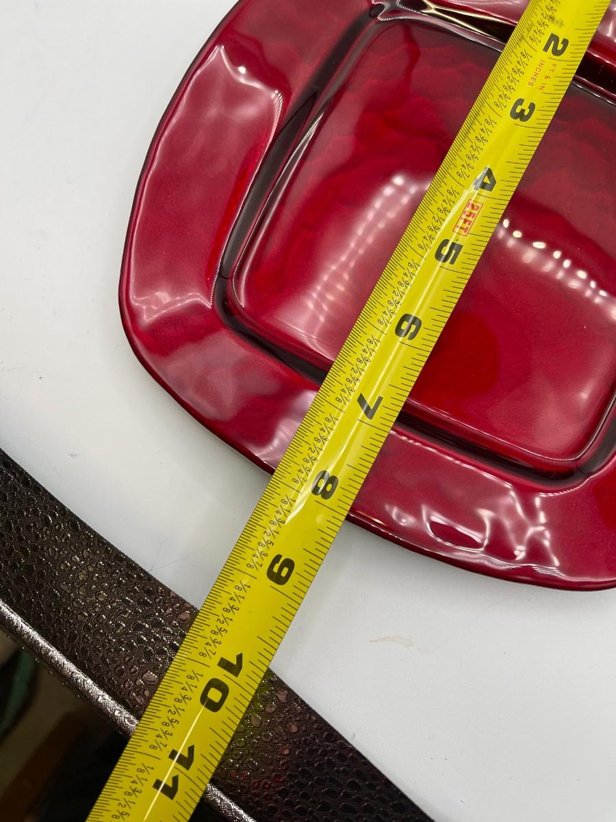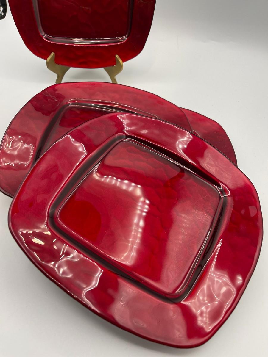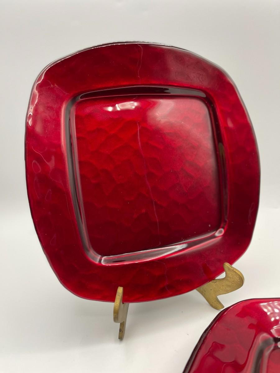 Set of 4 red enamel on metal plates, 8" . Like new condition.