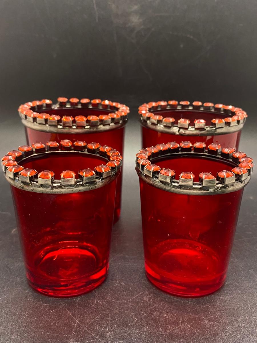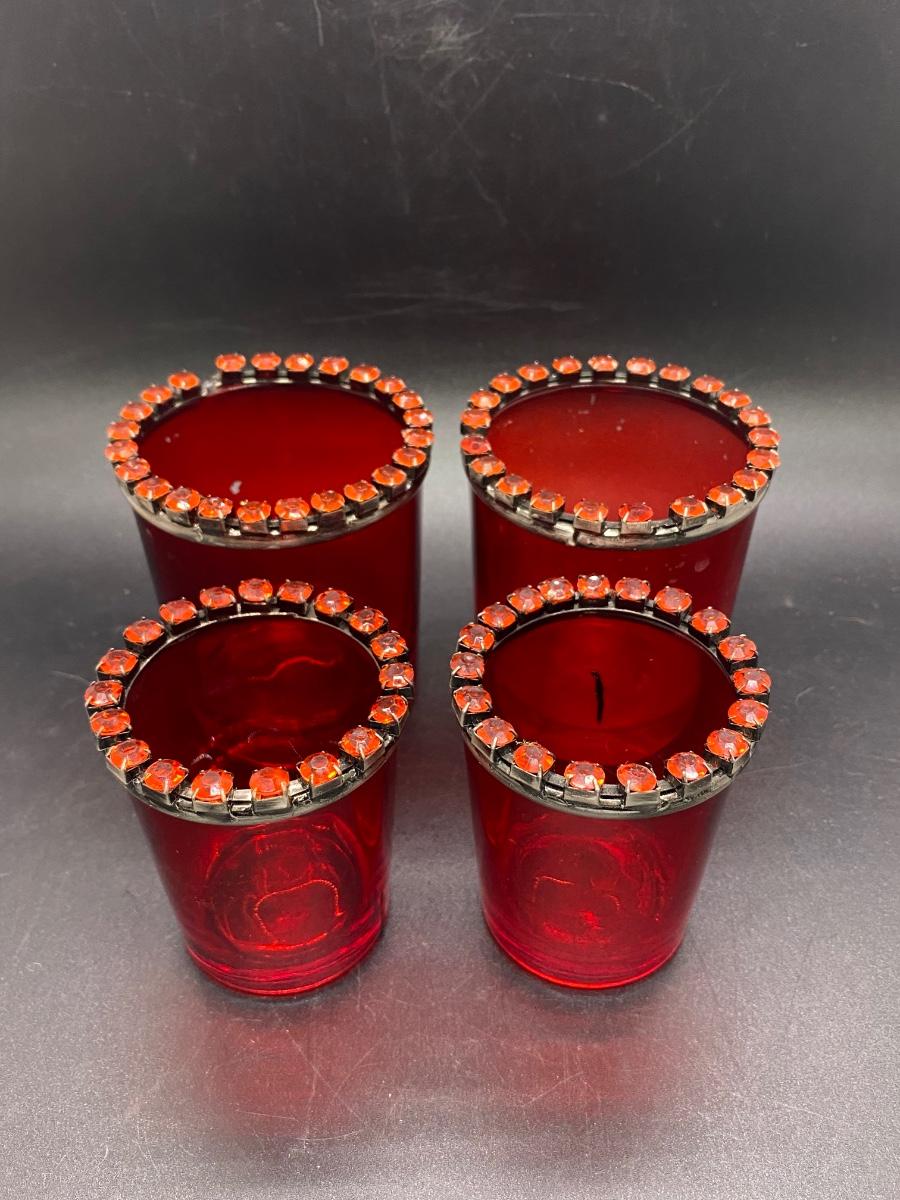 Set of 4 red glass votive candle holders. 2 sizes, red rhinestone edge. Around 3" size, light signs of use.