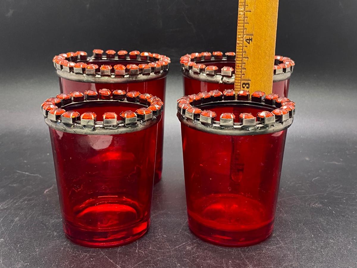 Set of 4 Red Glass & Rhinestone Trim Votive Candle Holders