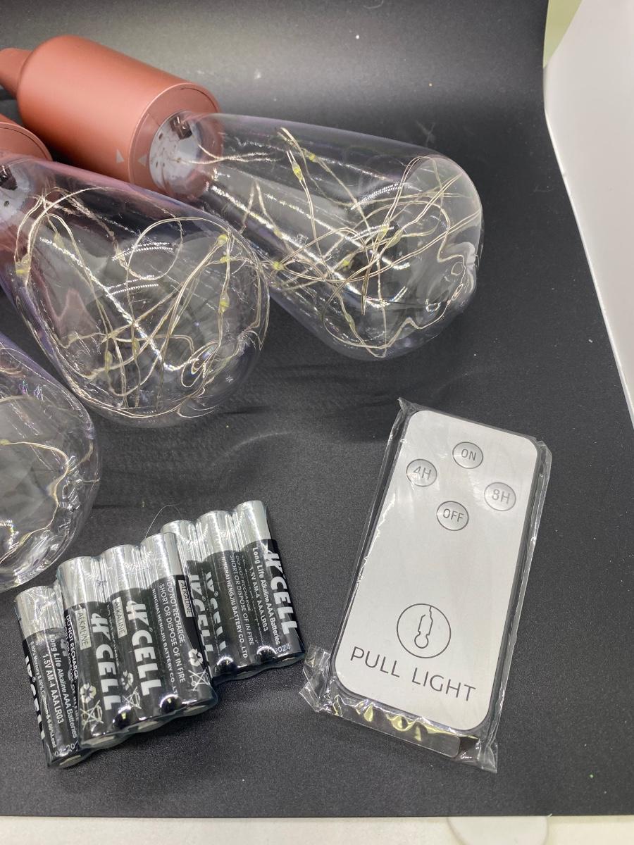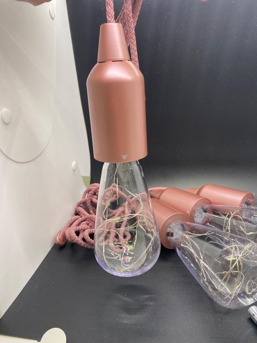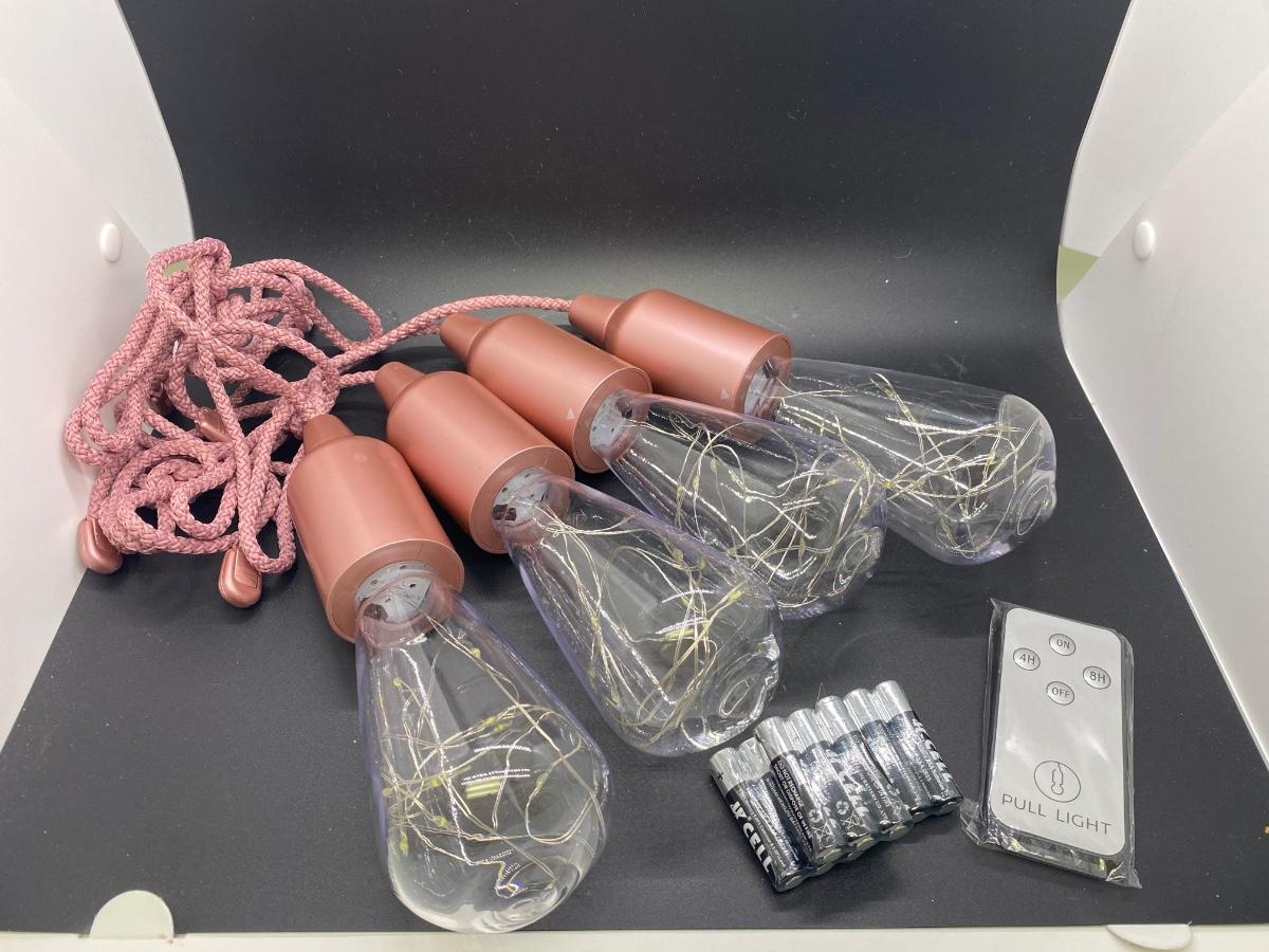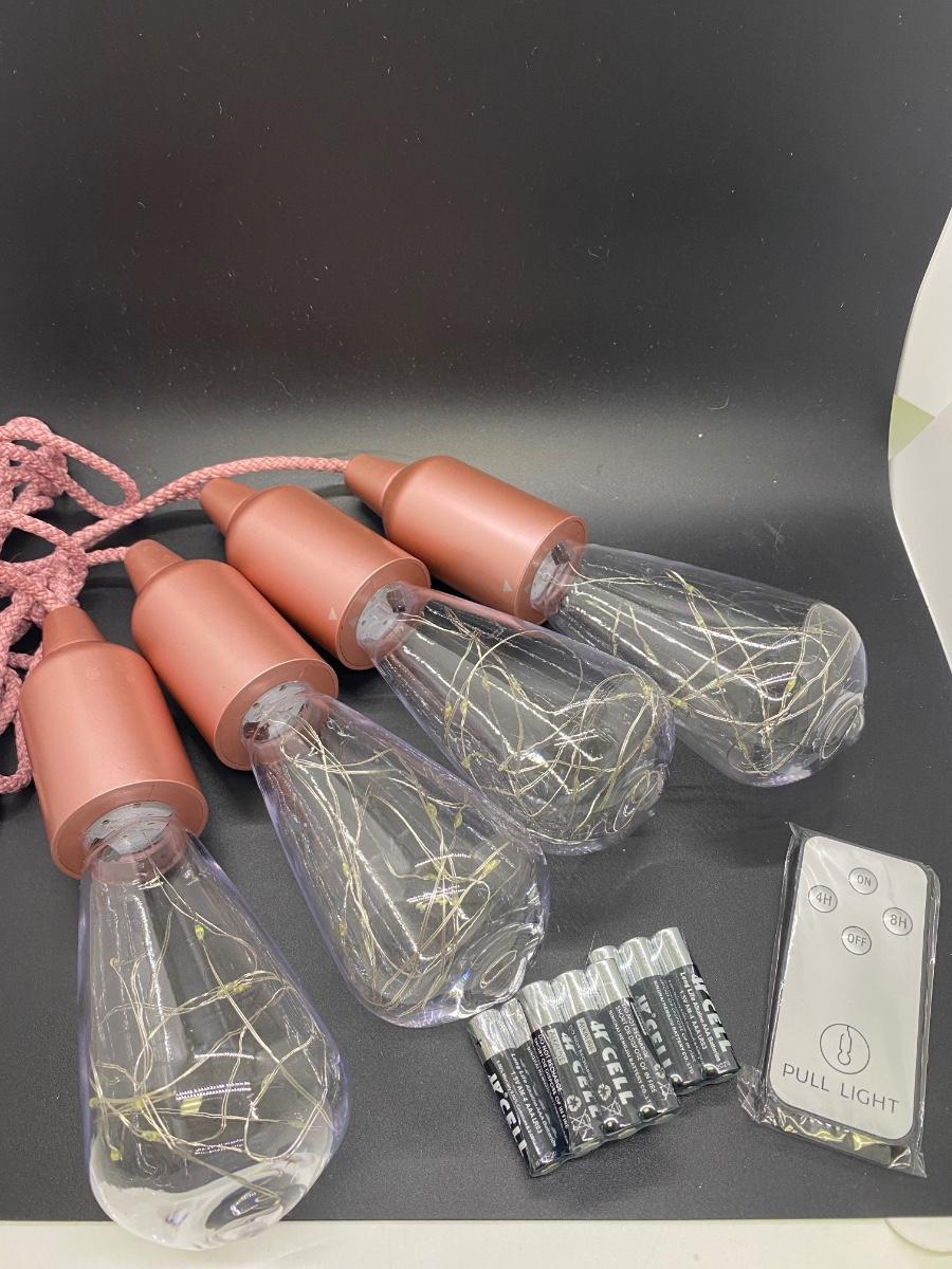Set of 4 Rose Gold Indoor Outdoor Pull Lights. Battery operated, shatter proof bulbs with fairy lights inside. Unused. This set comes with three sets of unopened batteries and a remote. There are no instructions regarding the remote, not sure if it actually goes to this set.