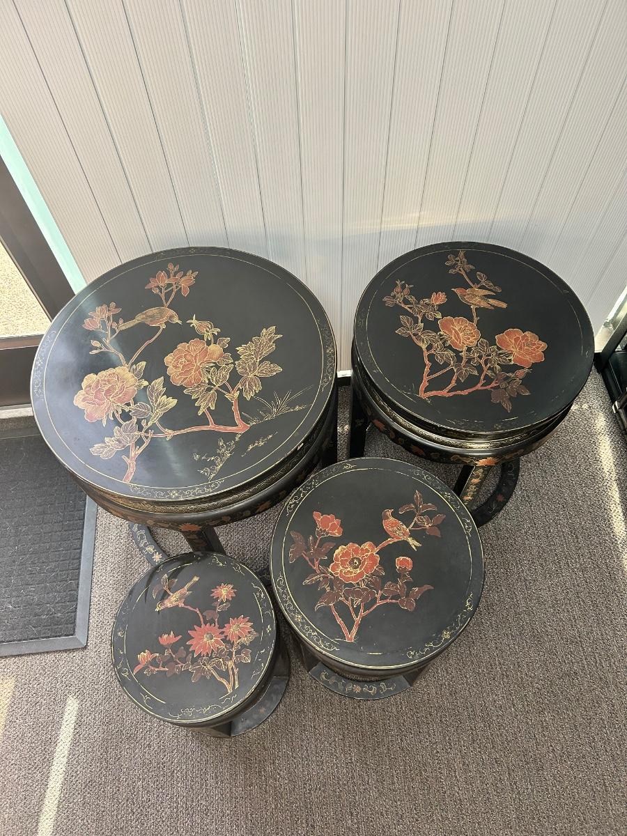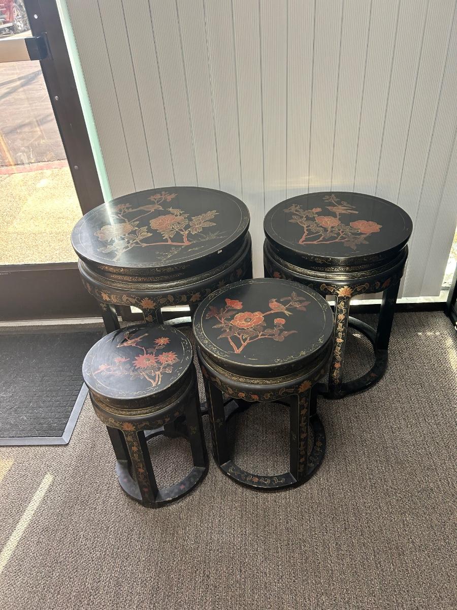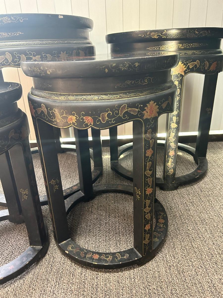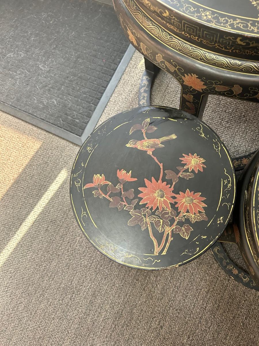 Set of 4 Round Nesting Side Tables Japanese Chinoiserie Black Lacquer with Birds and Flowers. In good vintage condition. Nest nicely. Some light wear from age and could use a slight cleaning. No damage noticed. Shortest is about 18" and tallest about 24".