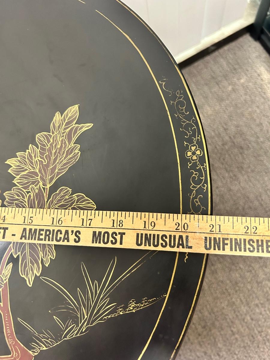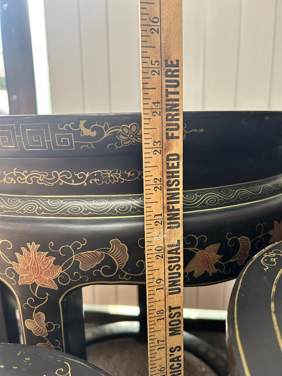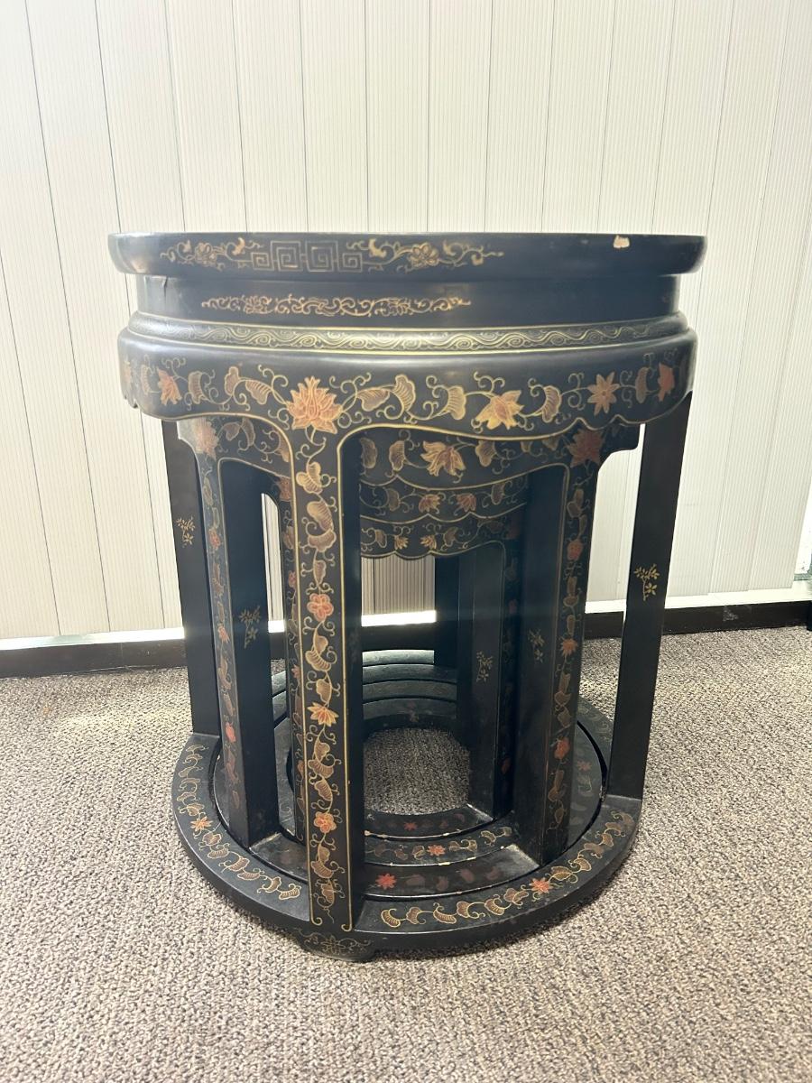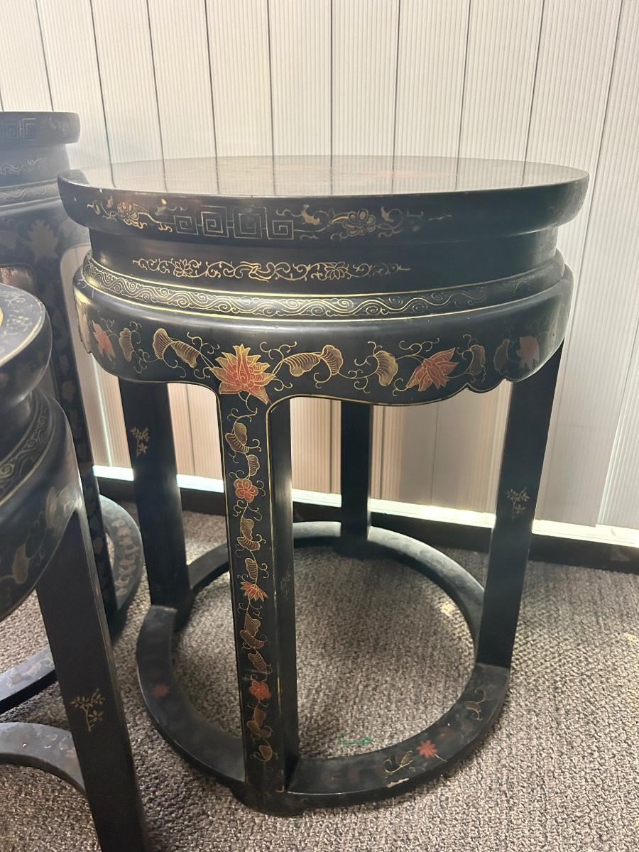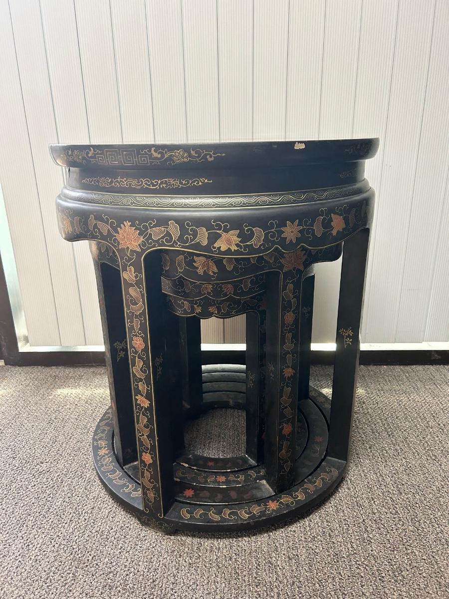 Set of 4 Round Nesting Side Tables Japanese Chinoiserie Black Lacquer with Birds and Flowers. In good vintage condition. Nest nicely. Some light wear from age and could use a slight cleaning. No damage noticed. Shortest is about 18" and tallest about 24".