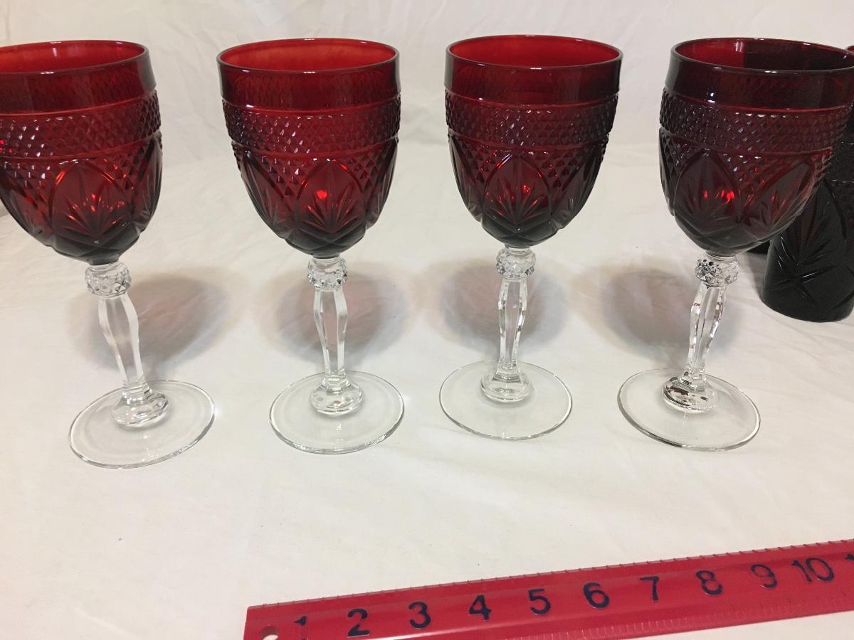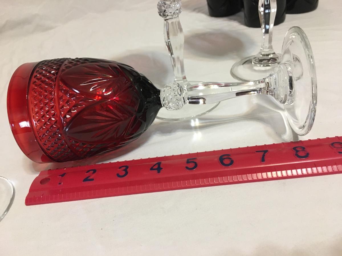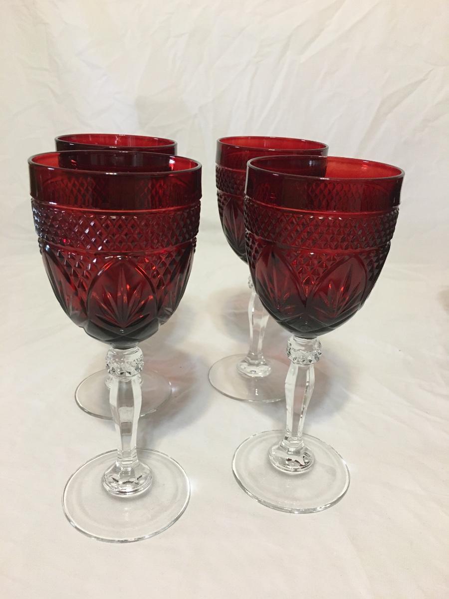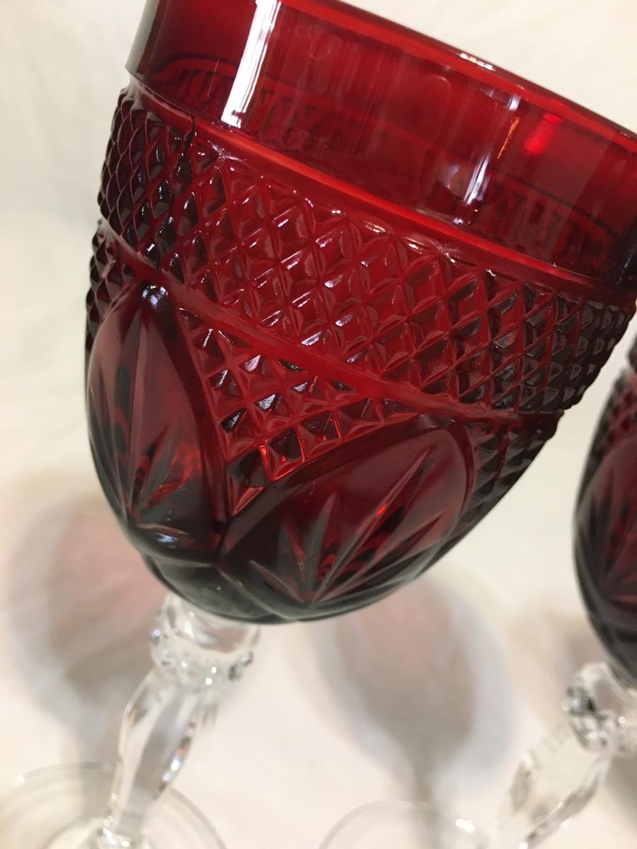 Set of 4 Ruby Red Pressed Glass Wine 8” Clear Stem Fan Diamond Cut