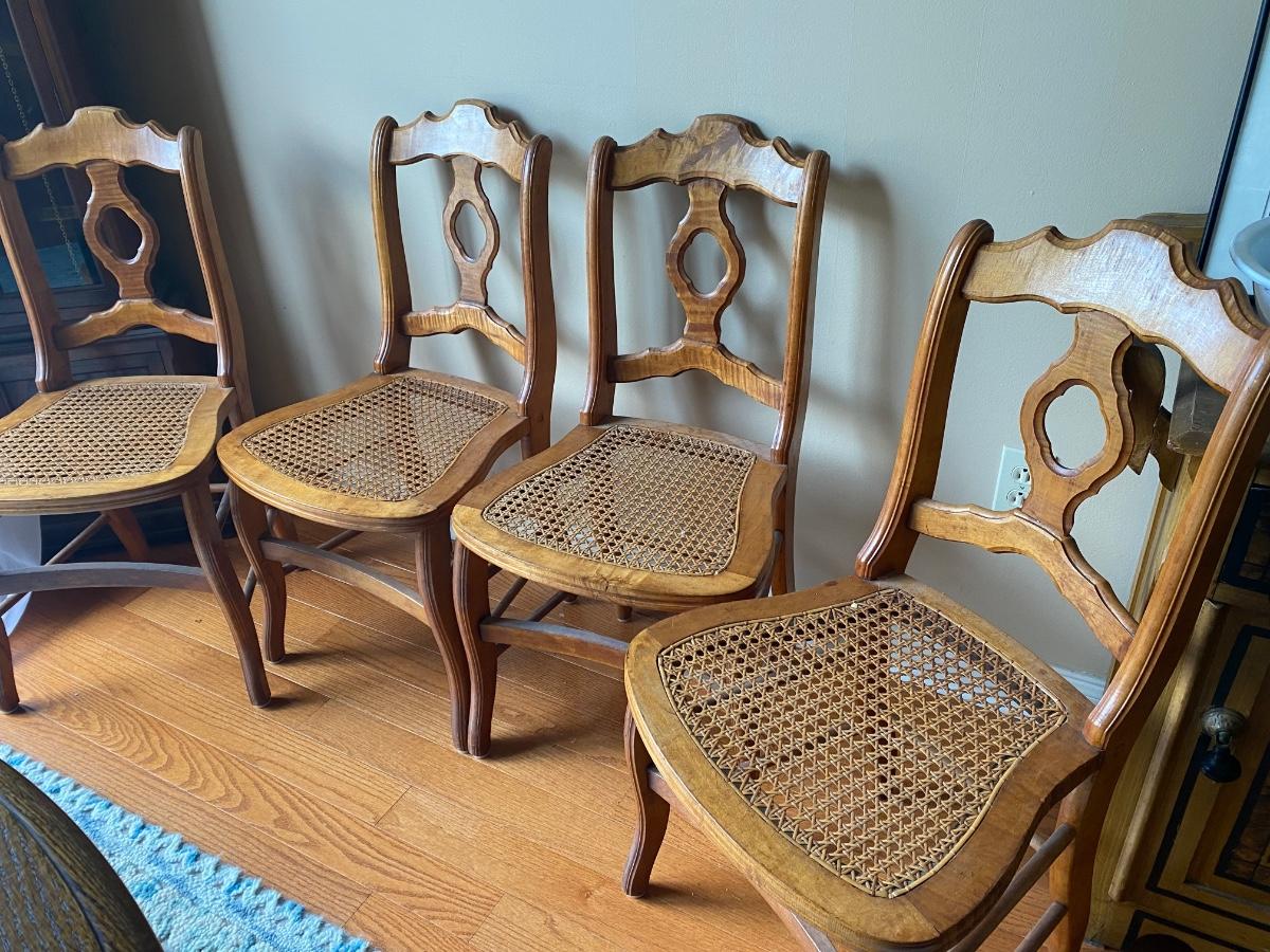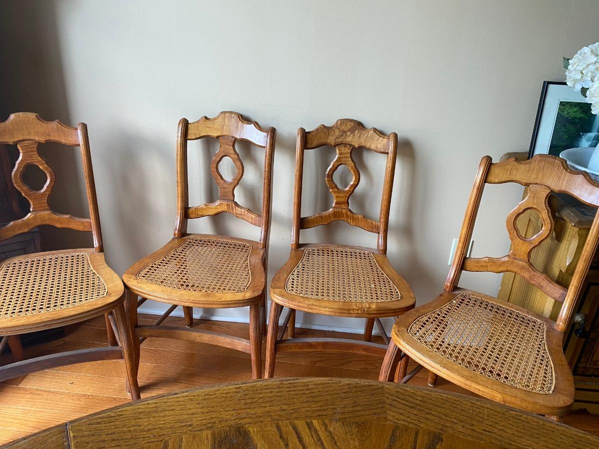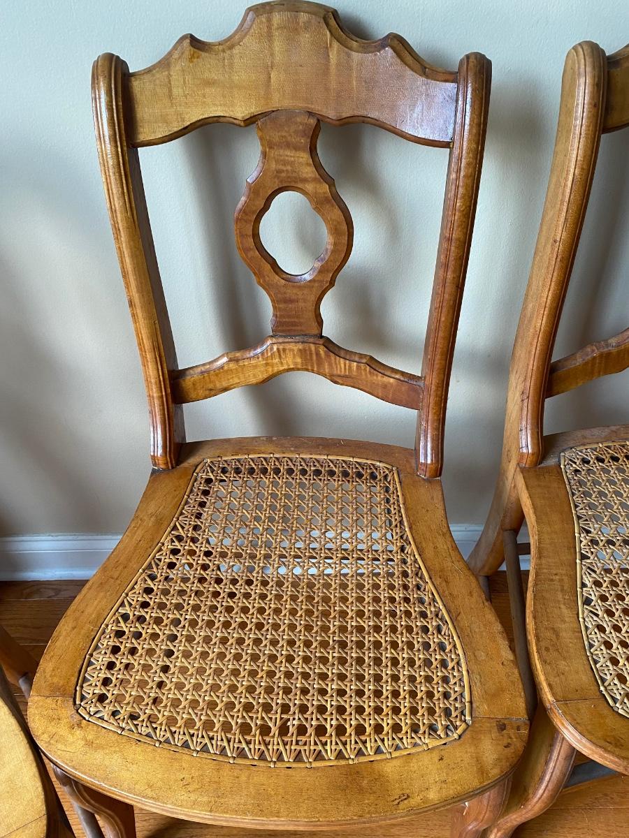 Set of 4 vintage tiger maple chairs with cane seats