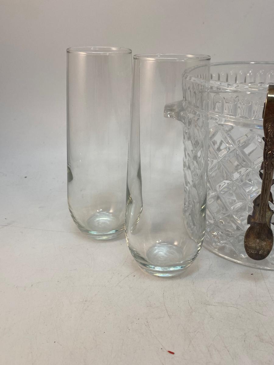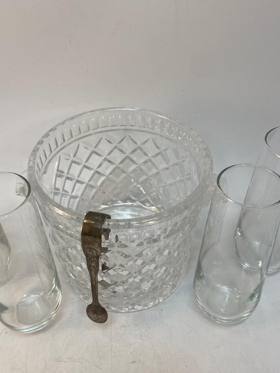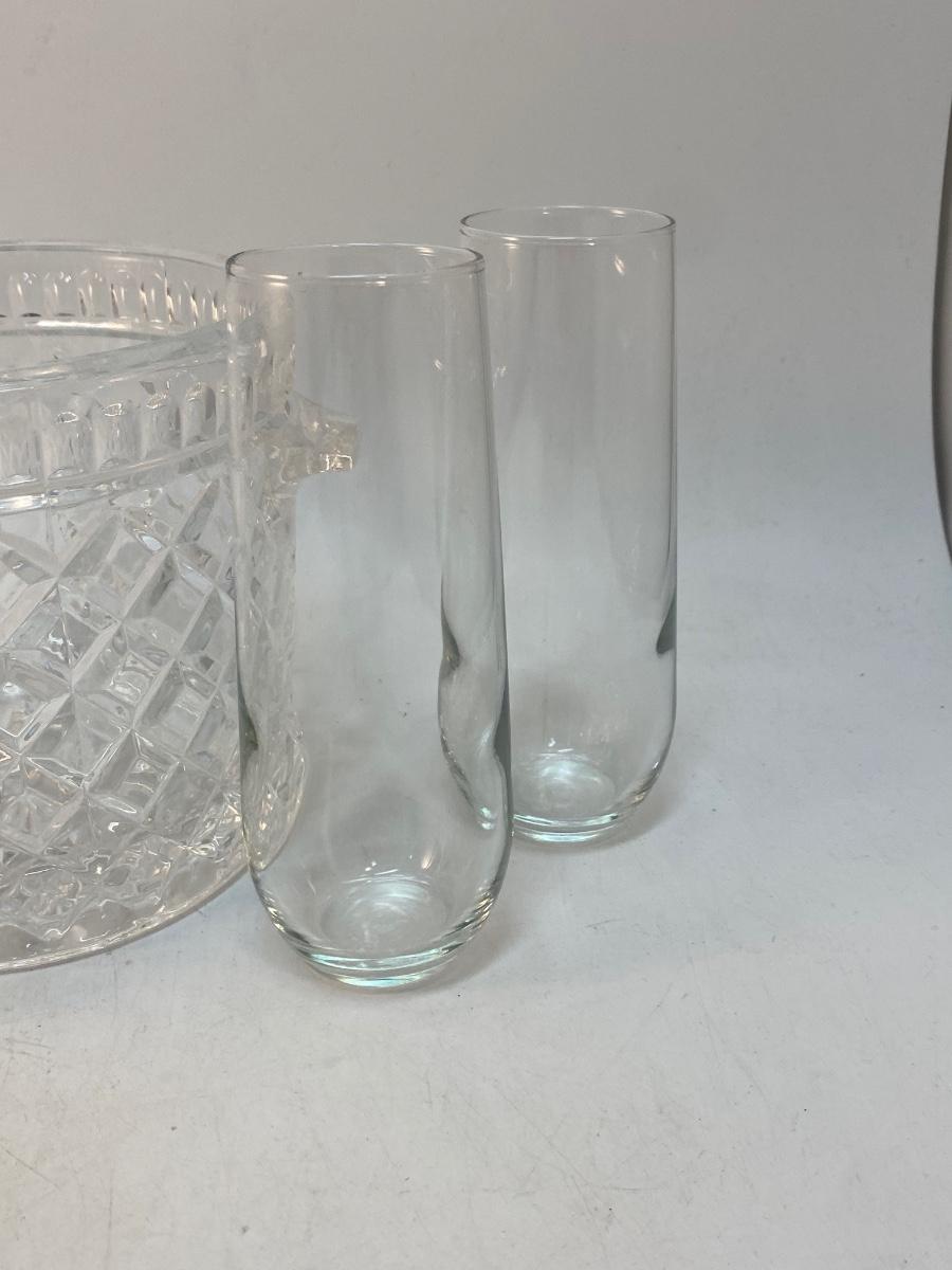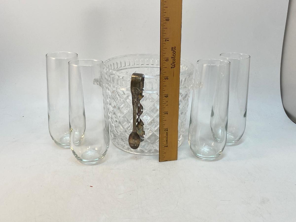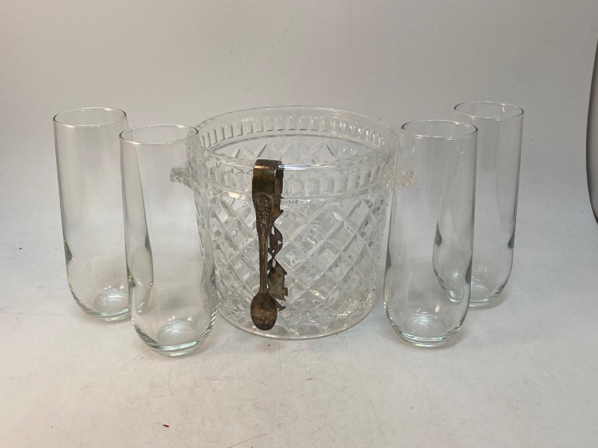 Set of 4 Stemless Champagne Glasses and Small Crystal Ice Bucket. Everything in good condition. Small tongs are silver plate.