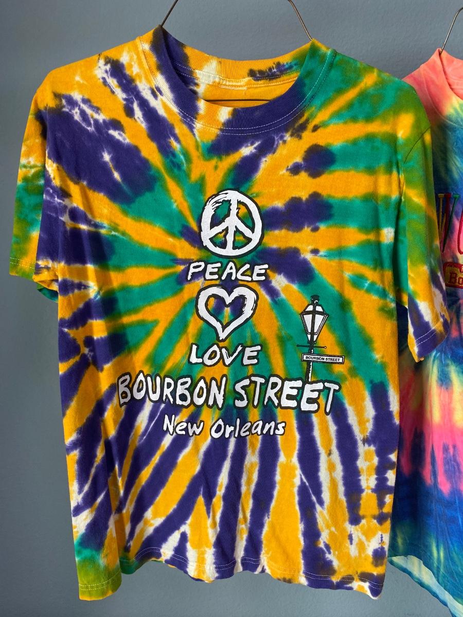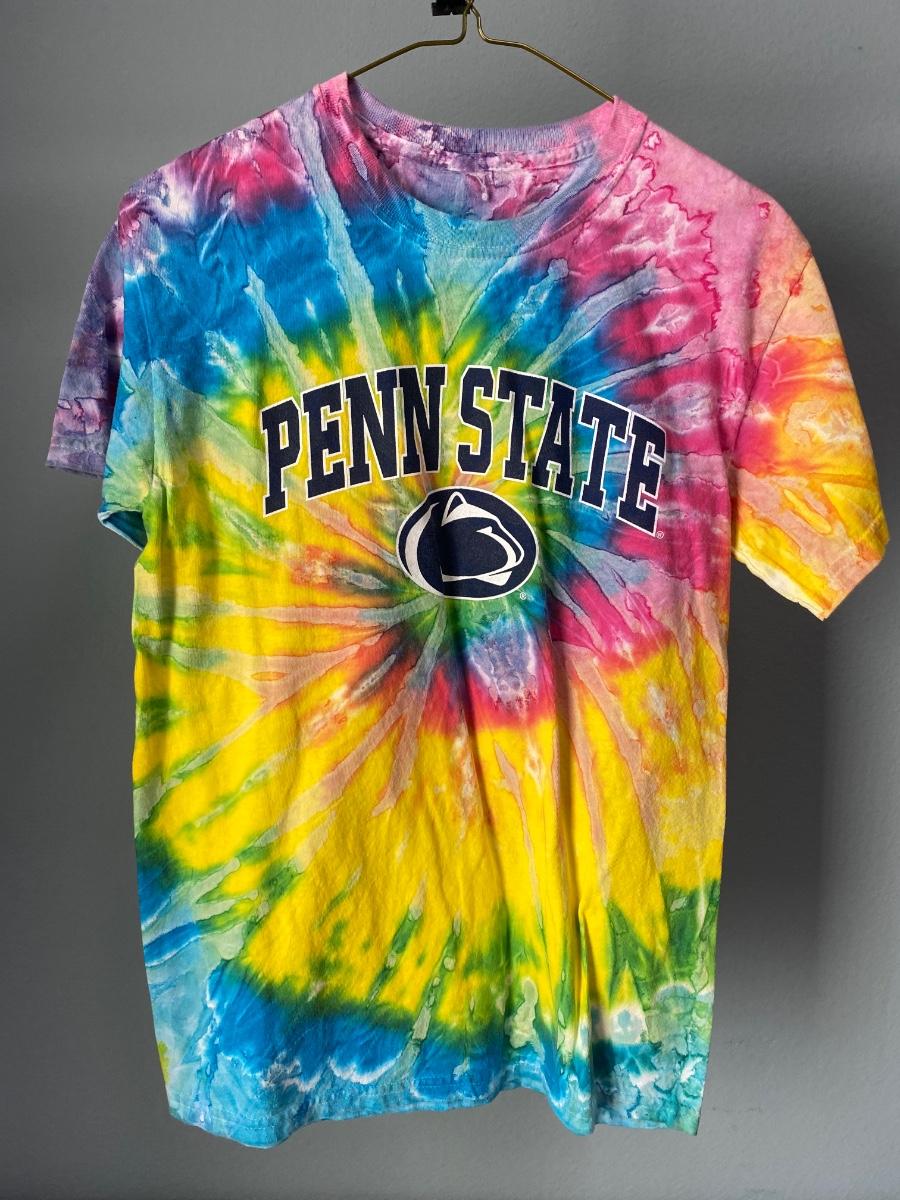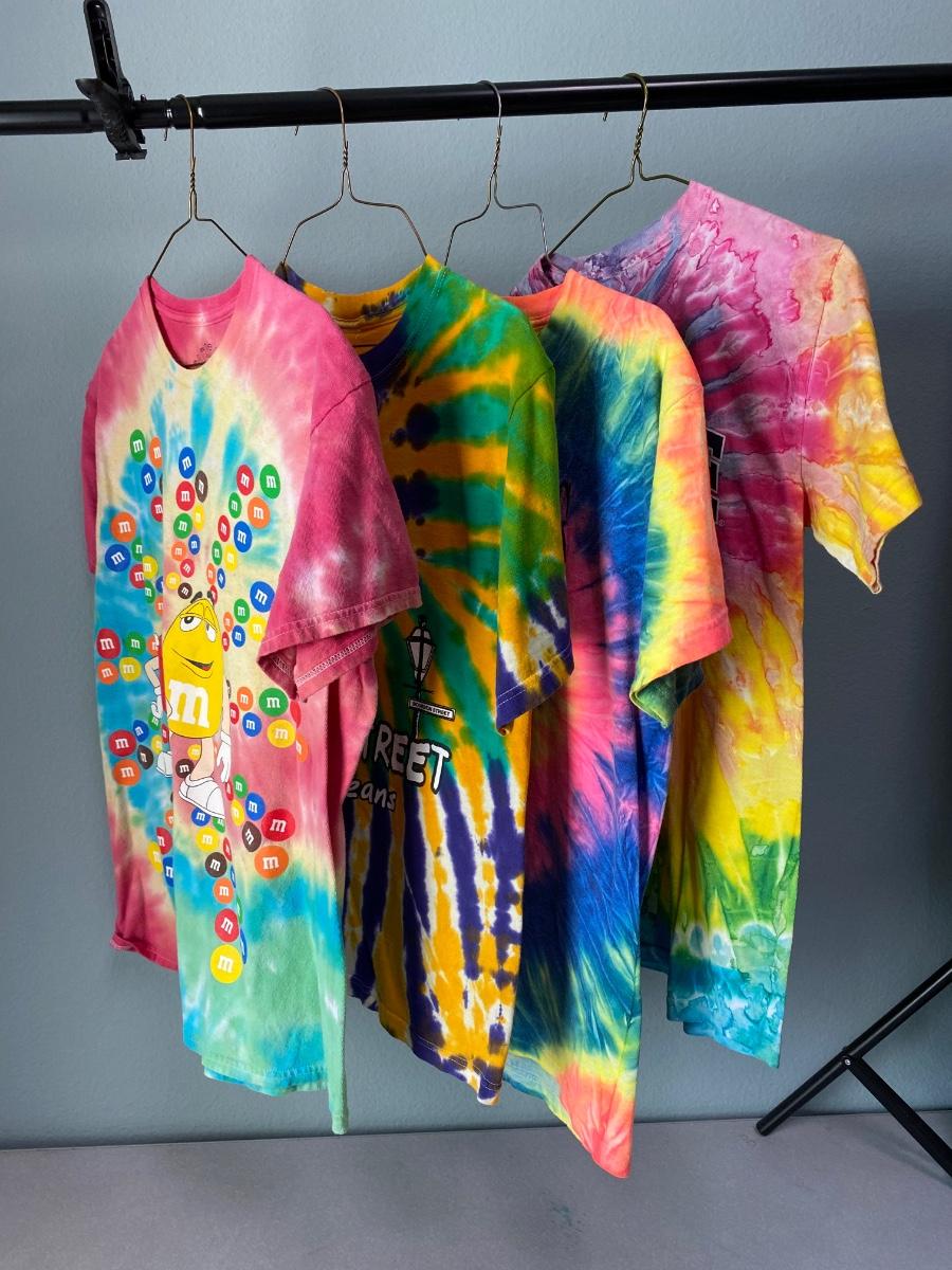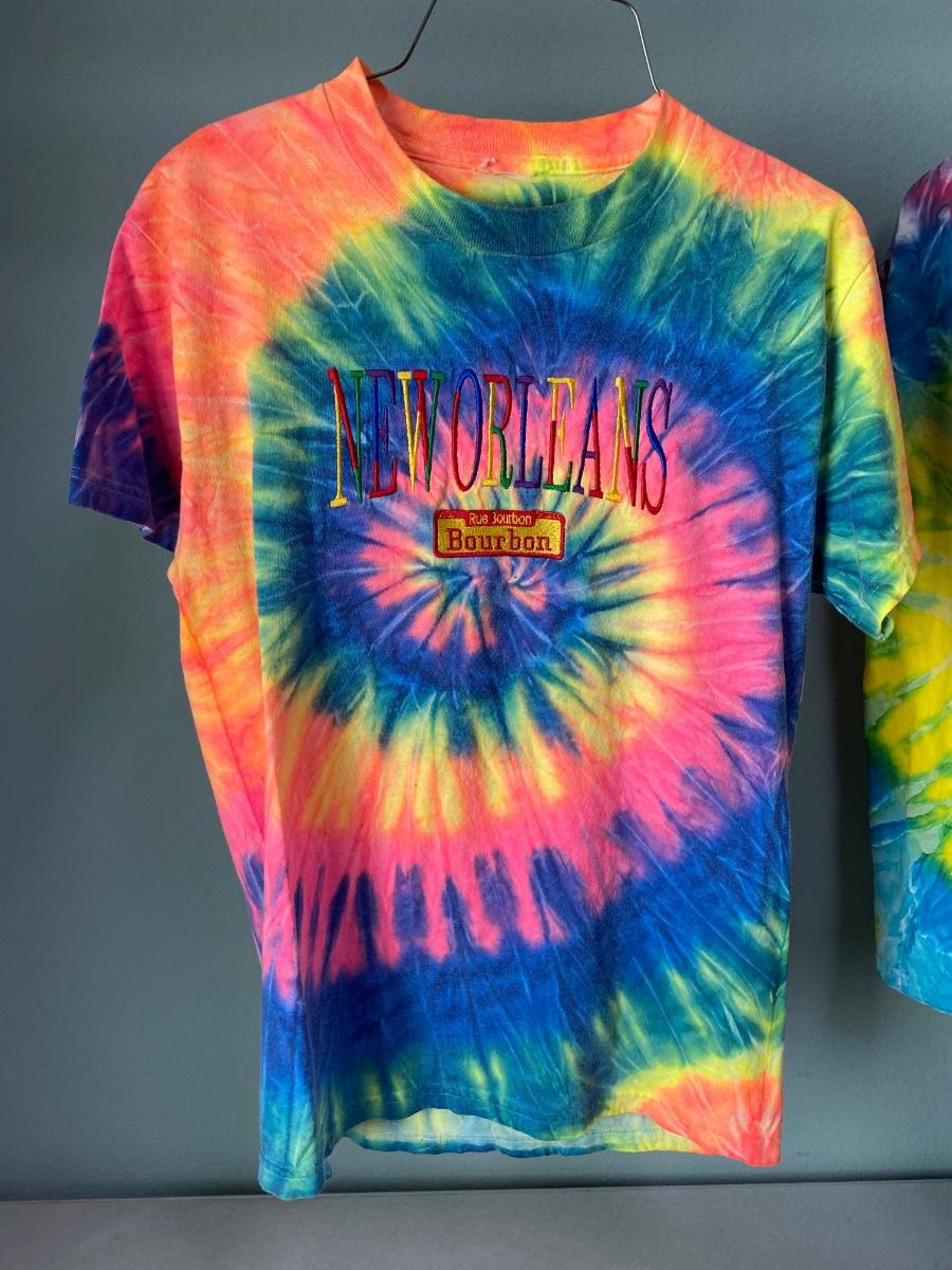 Set of 4 tie-dyed graphic t-shirts. M&M's, New Orleans (2), and Penn State. Colorful designs. All seem to be about the same size, medium.