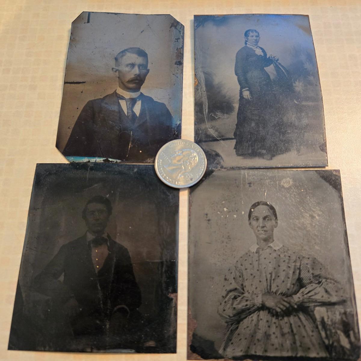 This auction lot is for Four Tin Type Photos. This group of 4 Tin Type Photos show a variety of folk - relationship unknown but found in the same chest. All are approximately 3-1/2-inches tall X 2-1/2-inches wide. They are in the condition as shown.