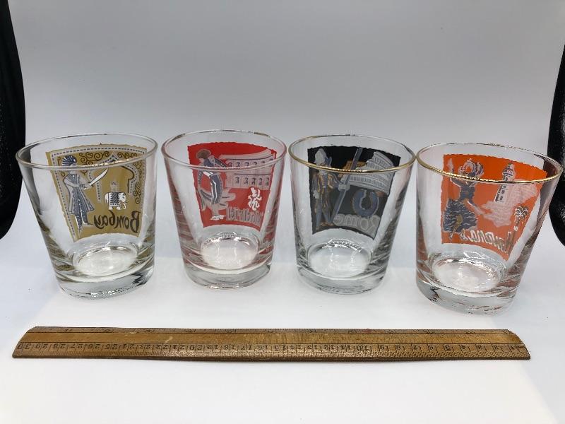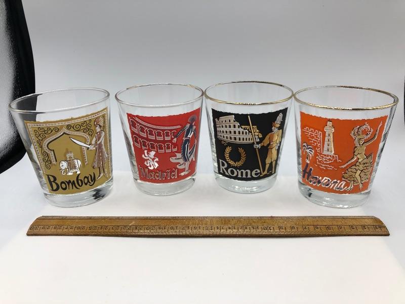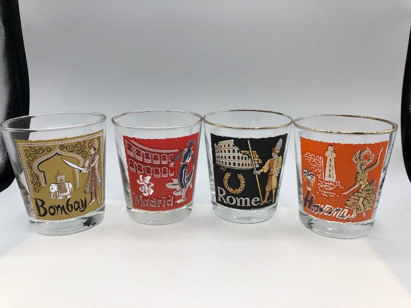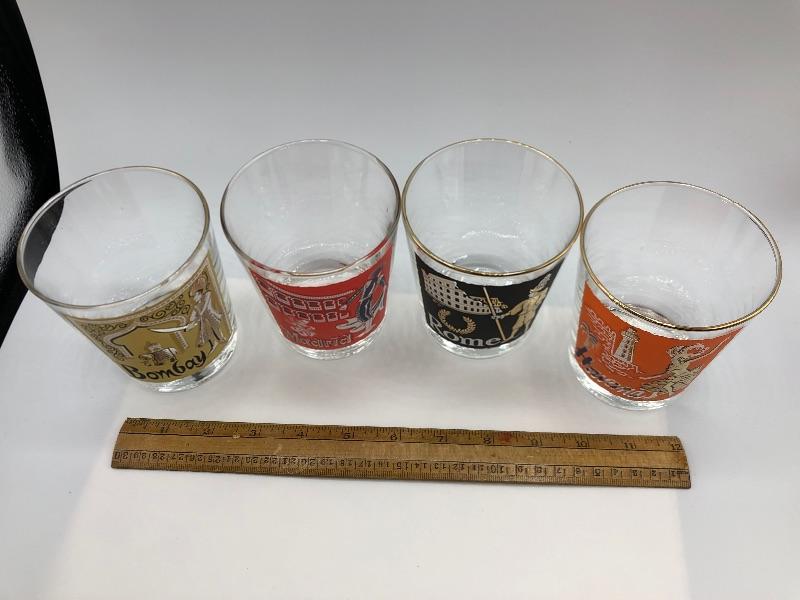 Set of 4 Vacation destination drink glasses. Bombay, Madrid, Rome, Havana. Good condition, little to no wear to designs.