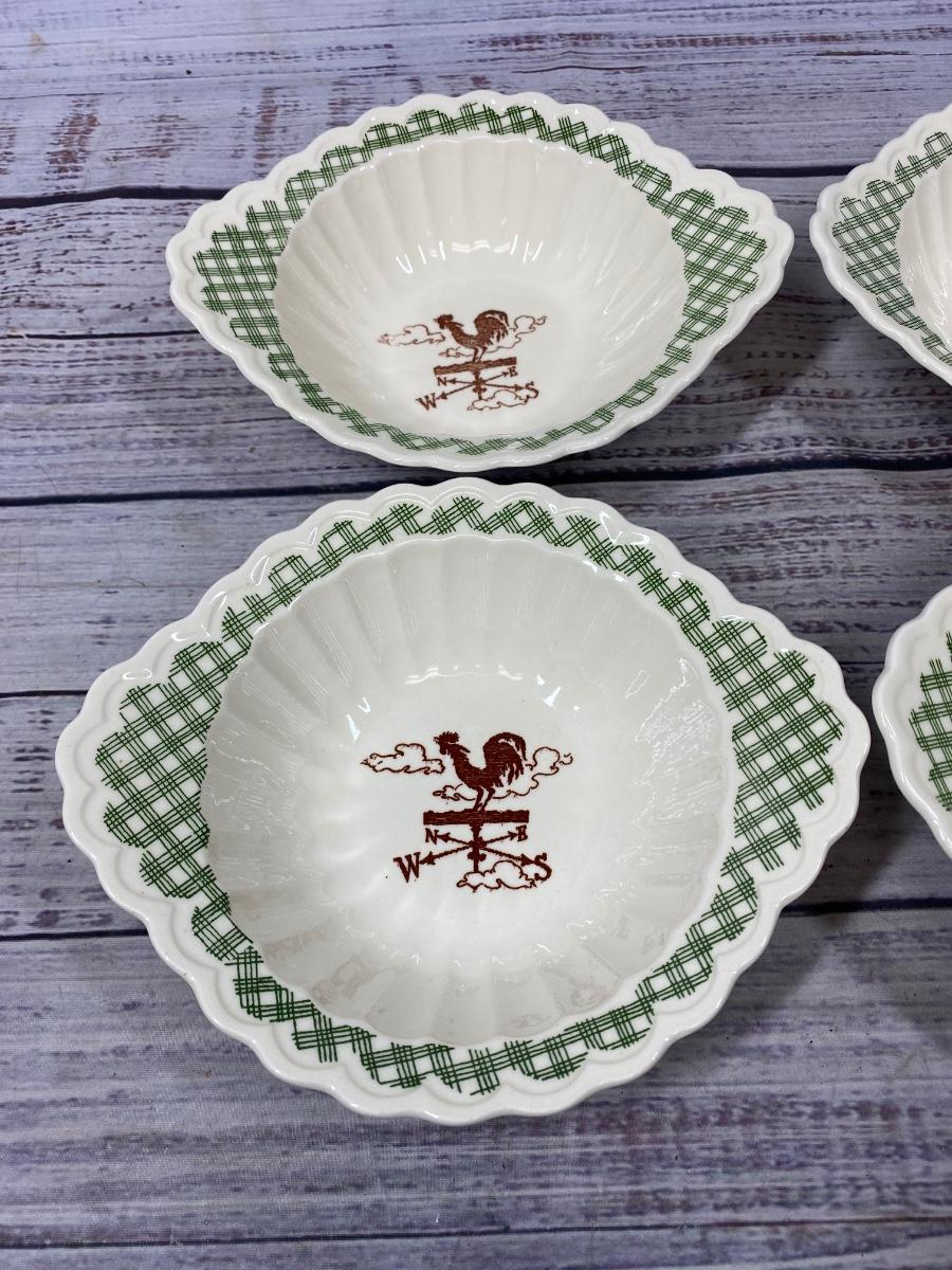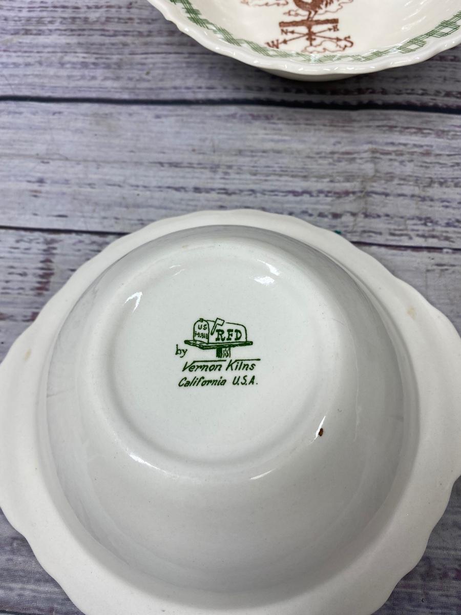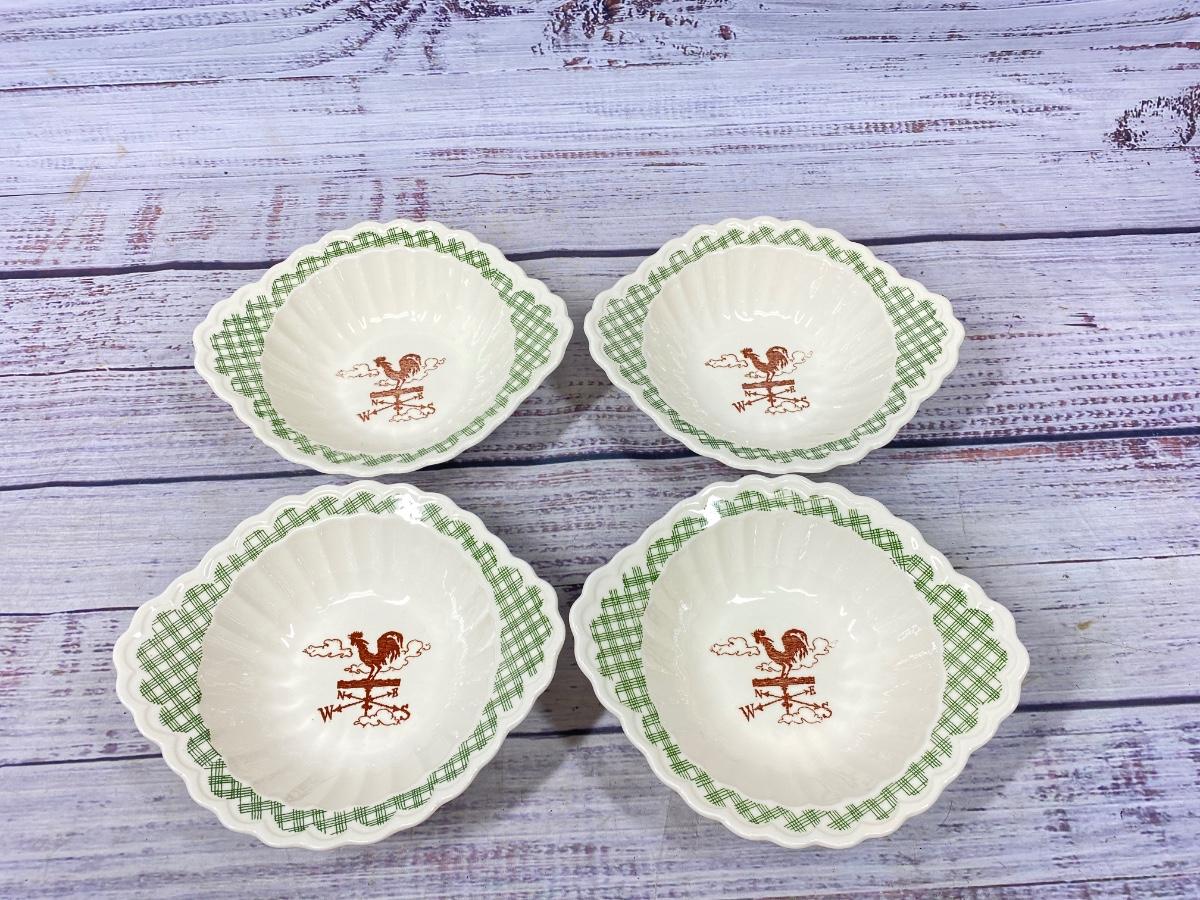 Set of 4 Vernon Kilns RFD handled cereal bowls. Cute farmhouse style bowls with scalloped edges, green plaid pattern and rooster weathervane pictures. In good condition, no chips.