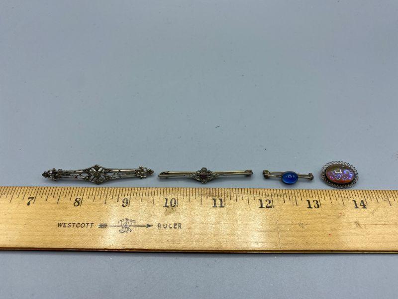 Set of 4 Victorian style brooches. Simple yet beautiful pieces. The top 3 are marked sterling. I could not find a mark on the bottom one.