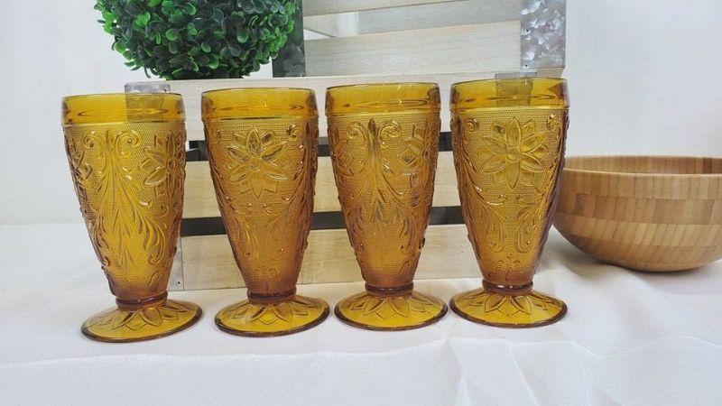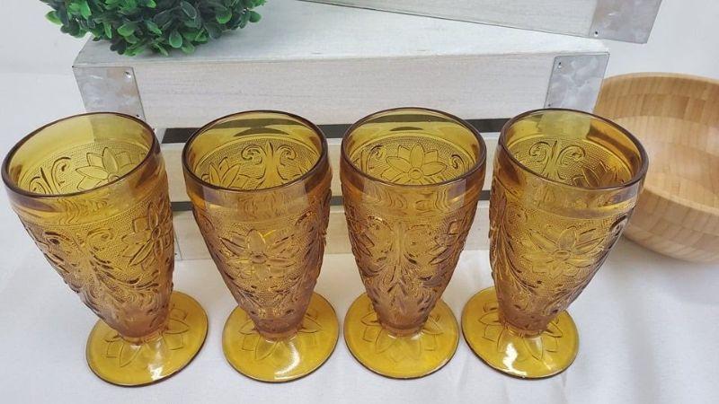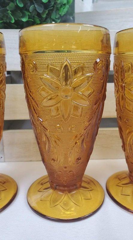 Set of 4 Vintage Amber Glasses, Holly Daisy Button Flower Cut Glassware, Parfait