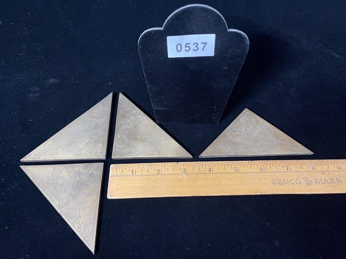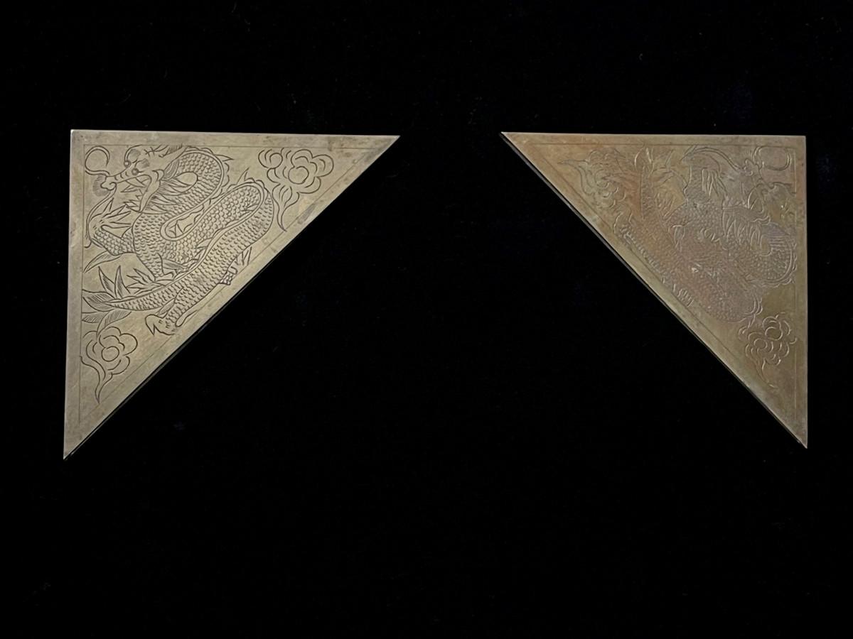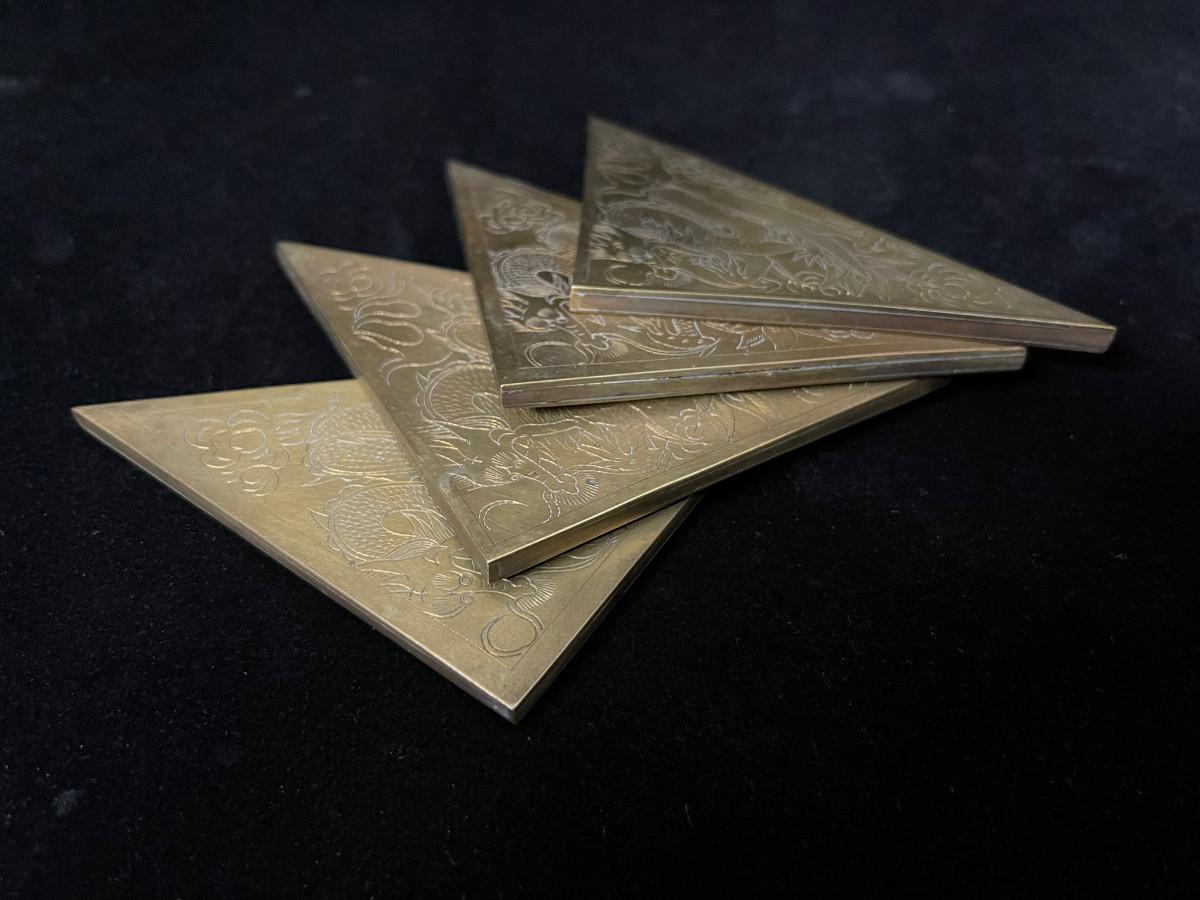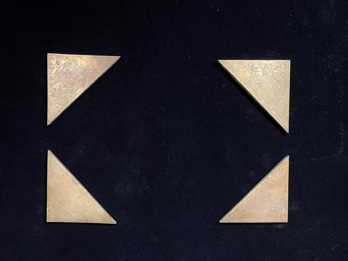 DESCRIPTION: This lost is a set of 4 brass corner blocks made to dress up a large desktop blotter. Each has been incised with a coiling dragon floating in the clouds.