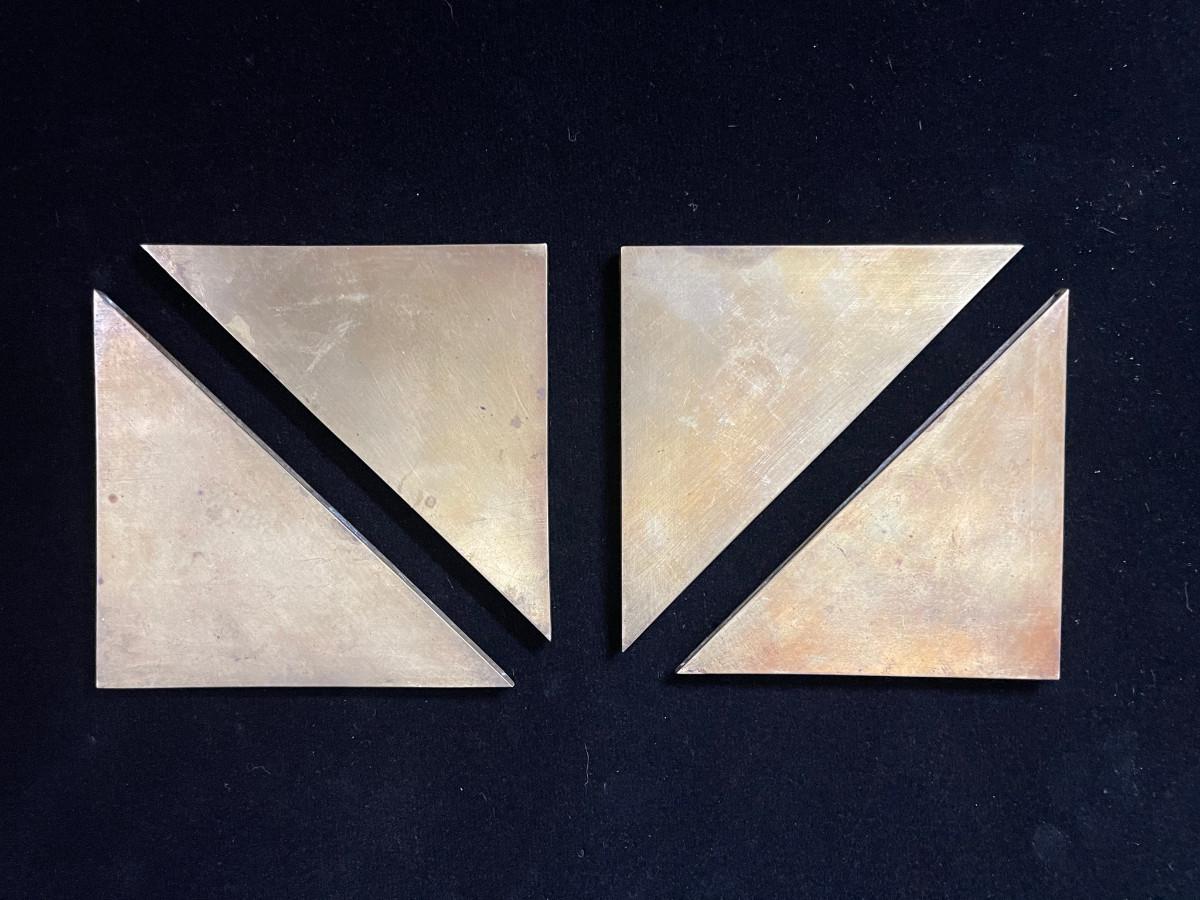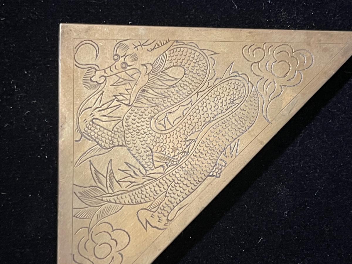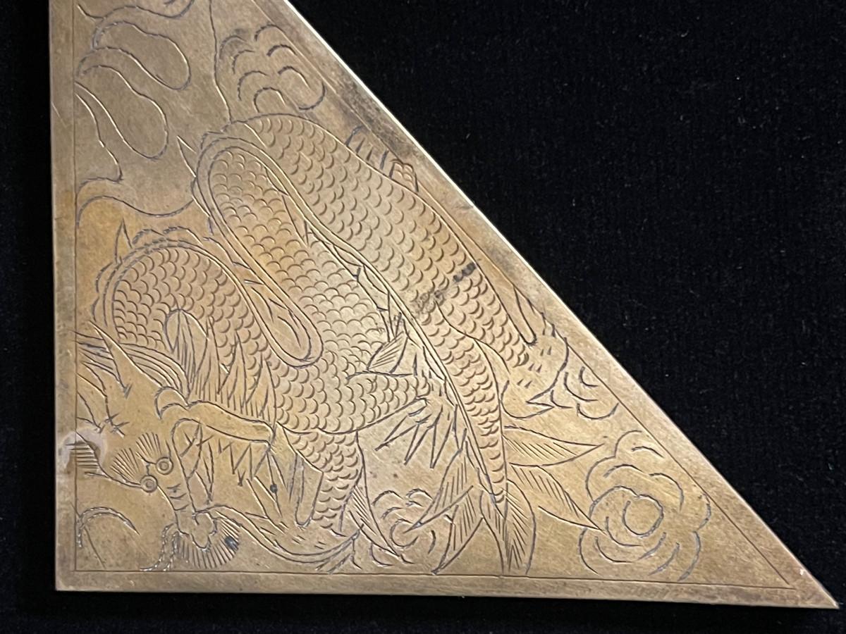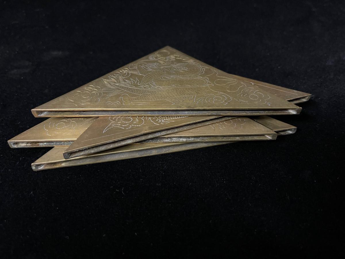 DESCRIPTION: This lost is a set of 4 brass corner blocks made to dress up a large desktop blotter. Each has been incised with a coiling dragon floating in the clouds.