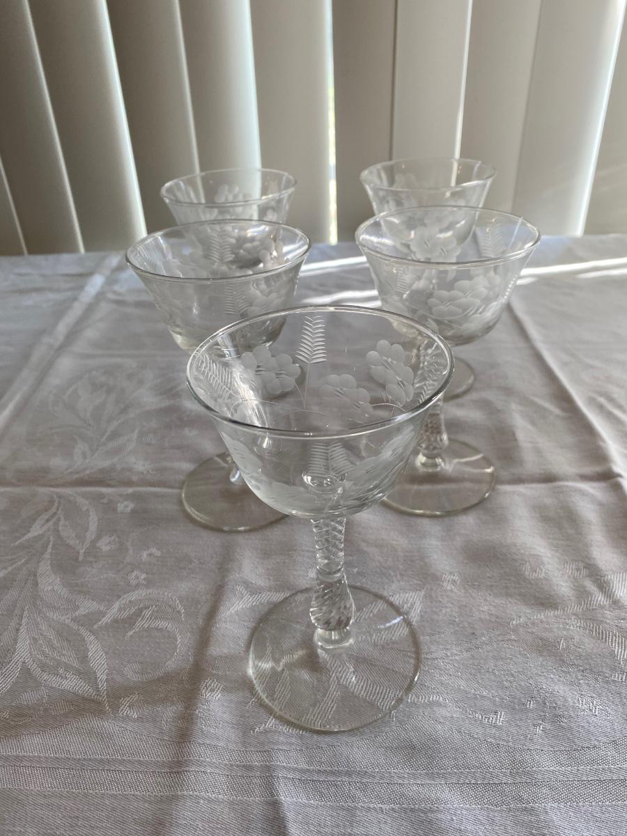 Set of 4 Vintage crystal etched wine glasses. Exc condition
