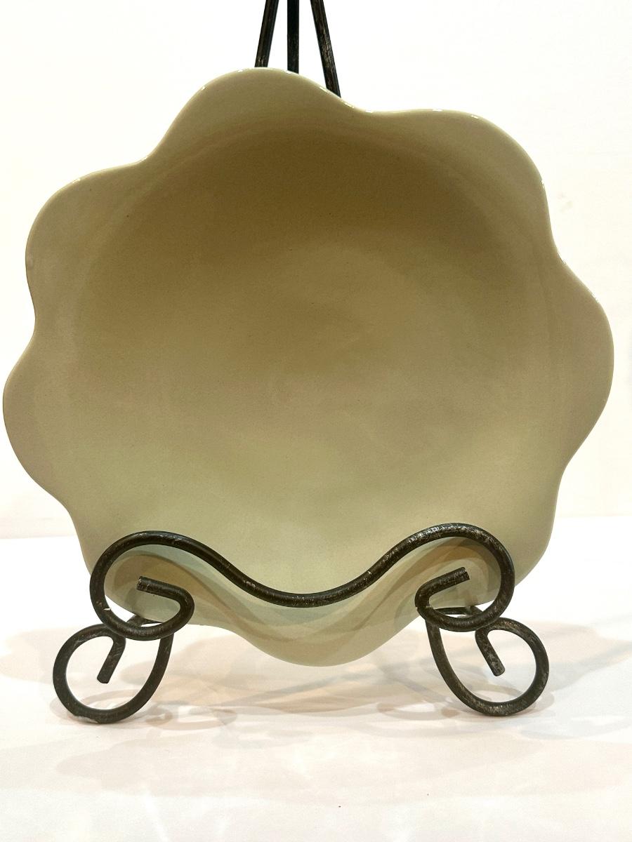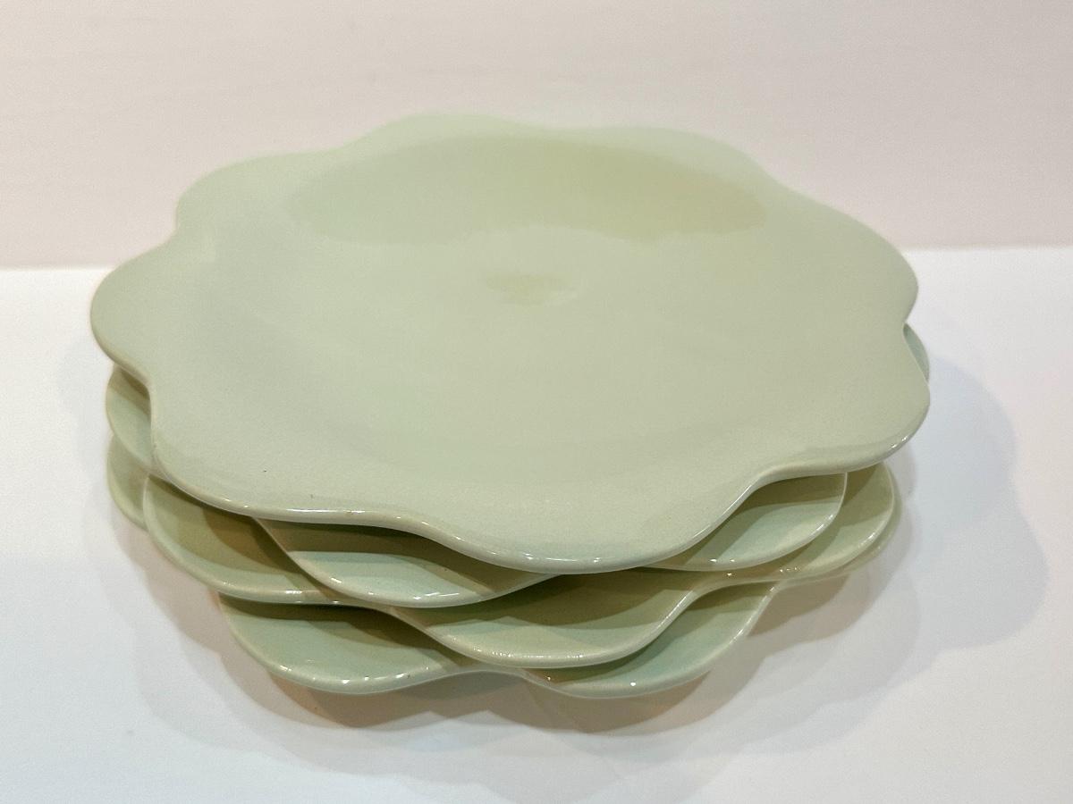 Charming scalloped edge mint green dessert plates made in Italy. Lighting in pictures makes the color look varied, they are all mint green like the stacked picture.