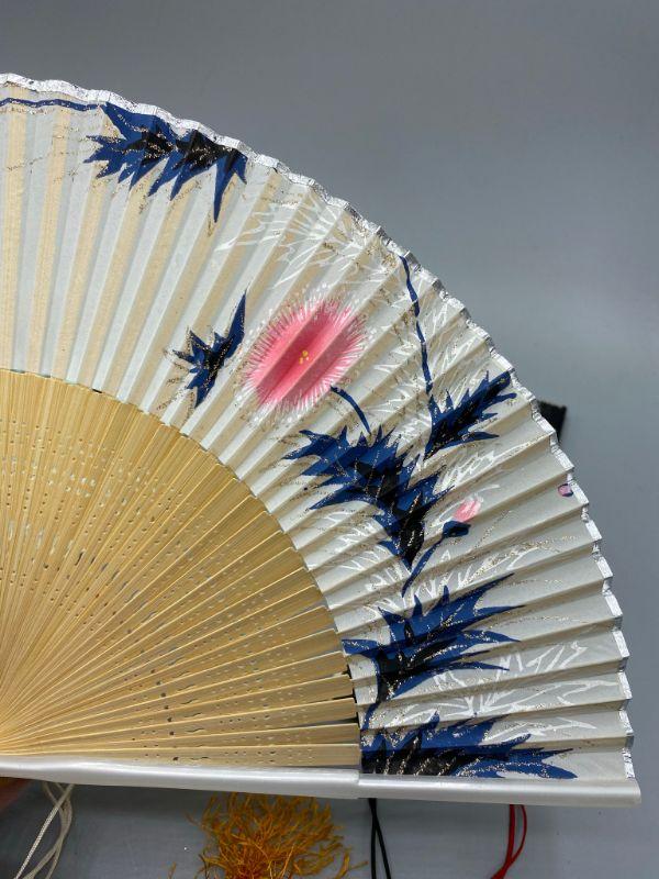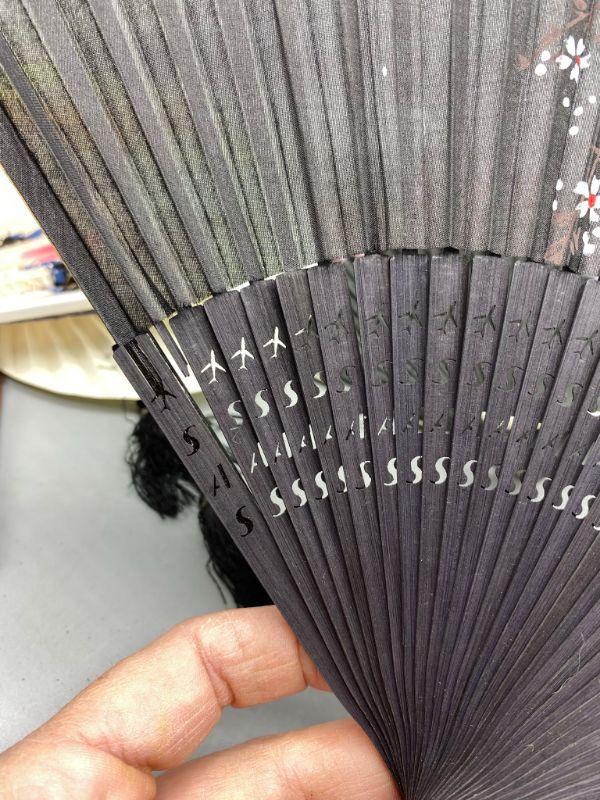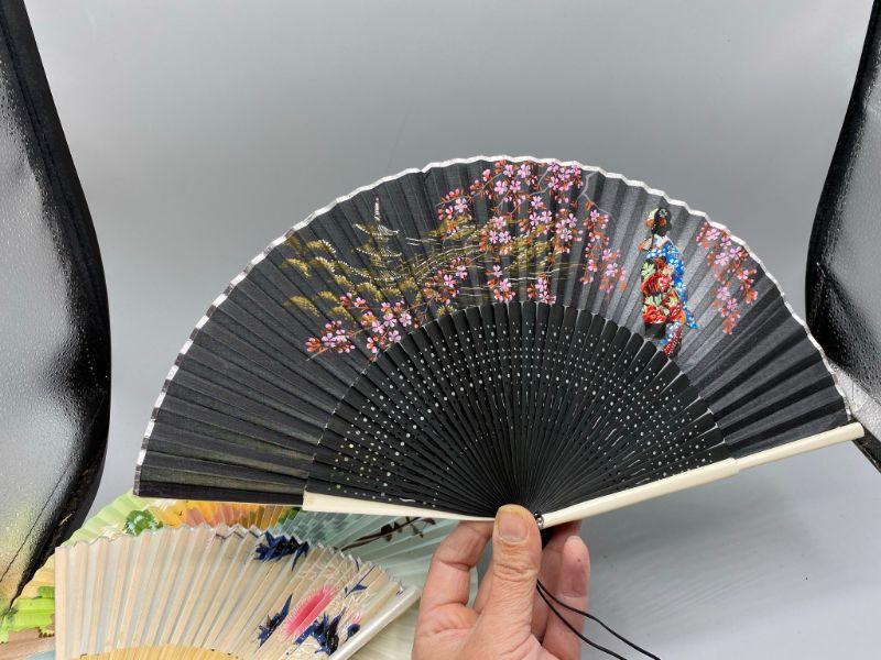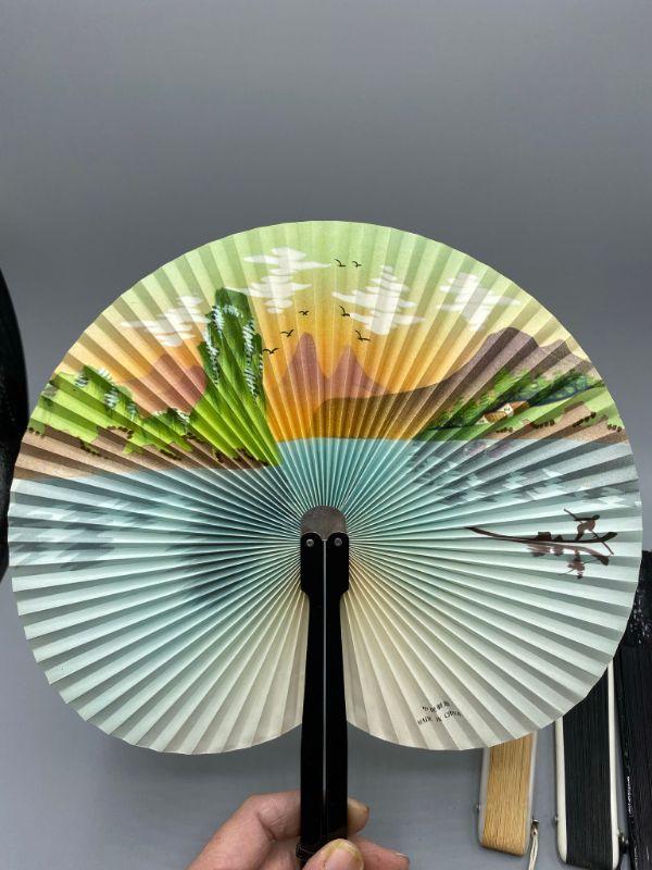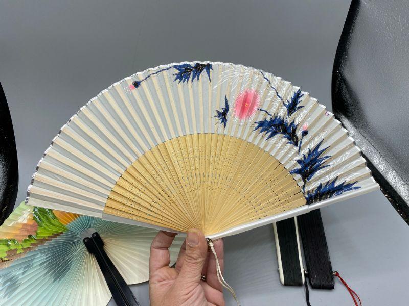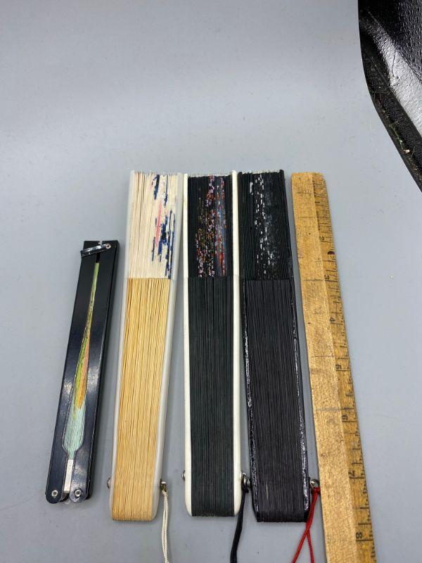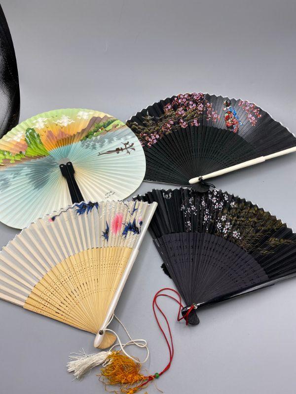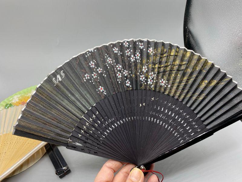 Set of 4 beautiful vintage folding fans. Asian inspired handheld fans. One is from SAS airlines, it does have a piece of wood missing. Good vintage conditions.