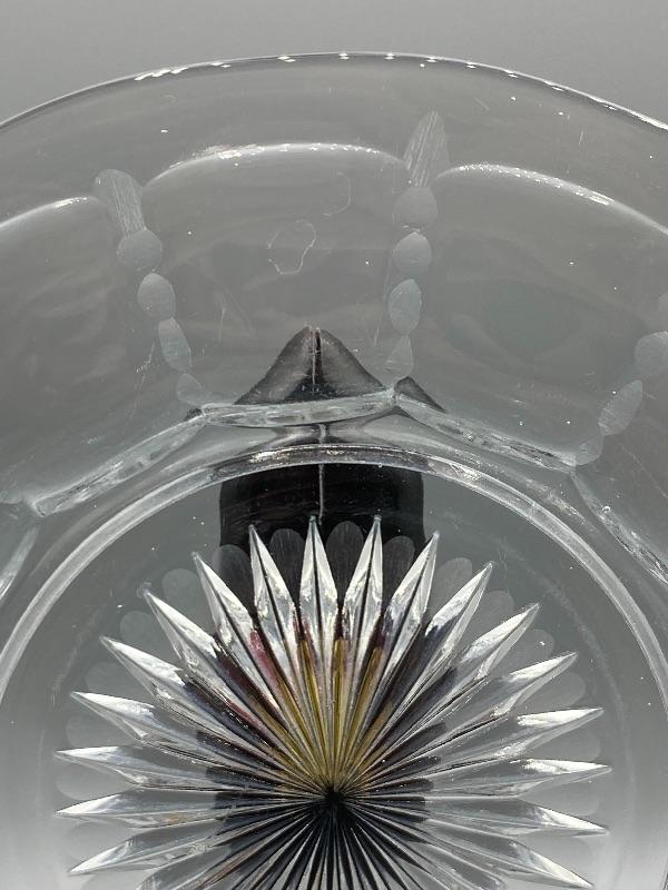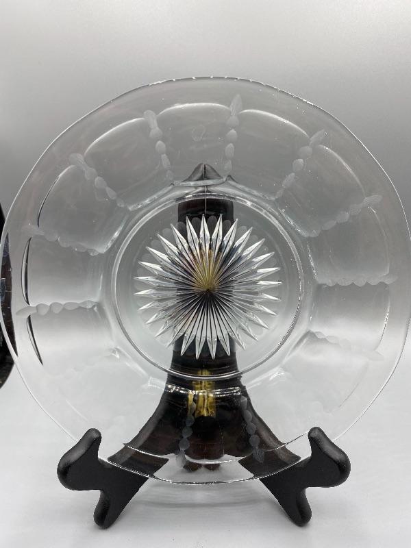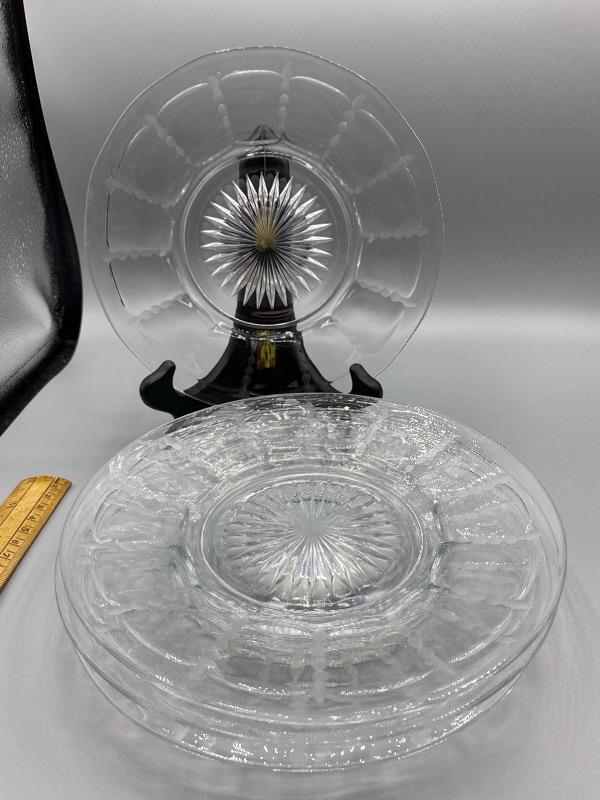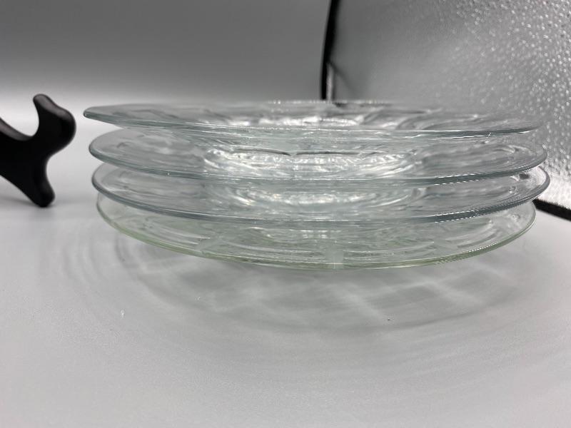 Set of 4 vintage glass plates. Have a faintly etched design around the rim. About 8” size. Good condition