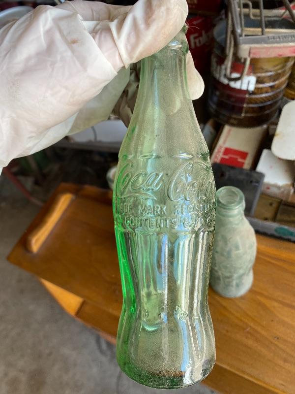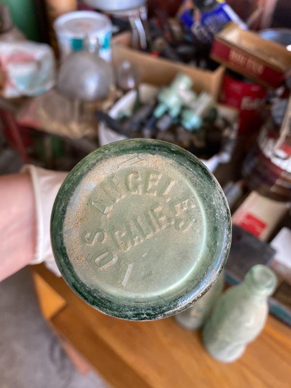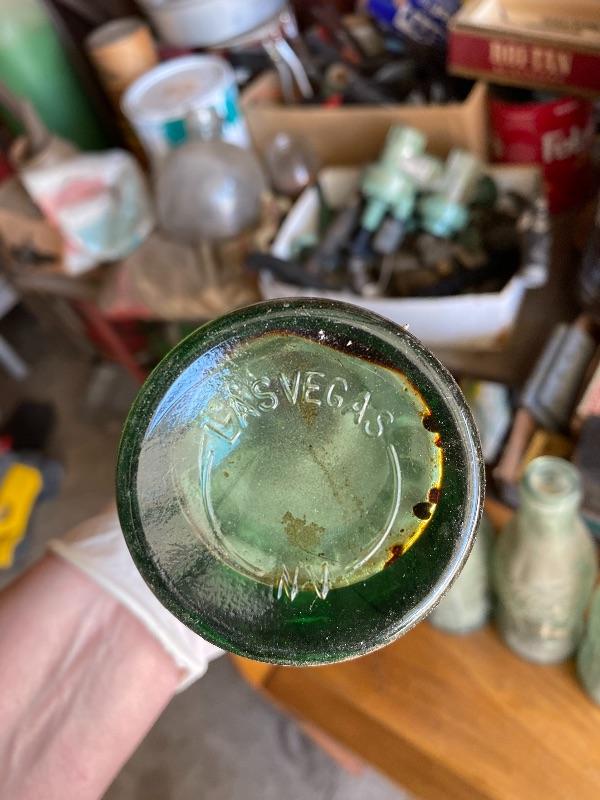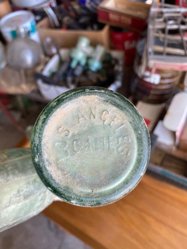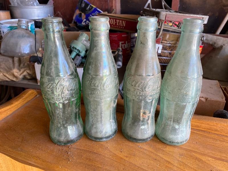 Set of 4 vintage green glass Coca Cola bottles. Dirty but no chips. Three are from Los Angeles bottling, the other is from Las Vegas bottling.