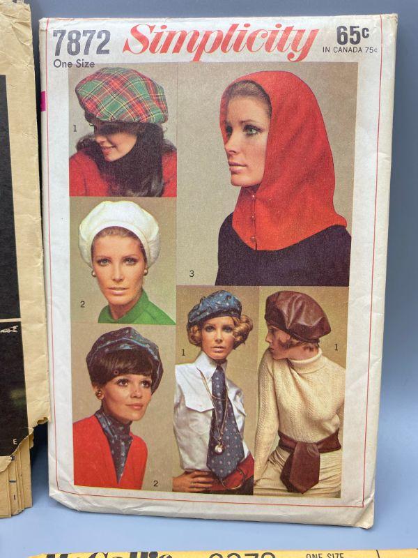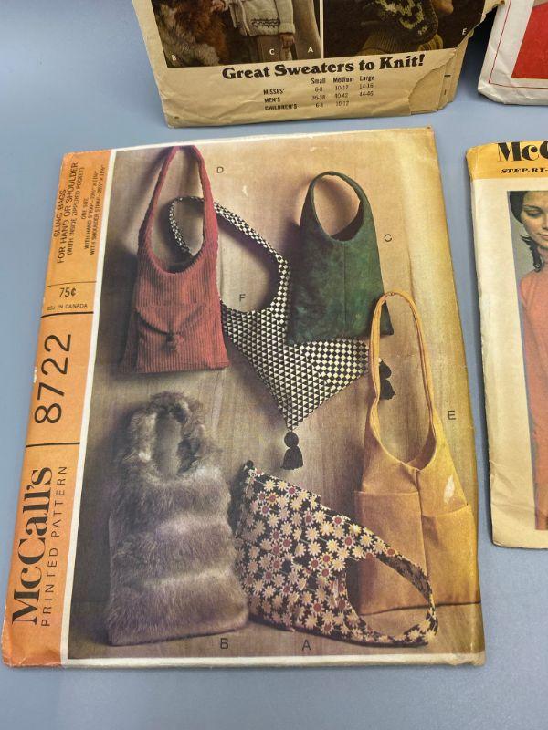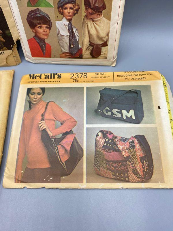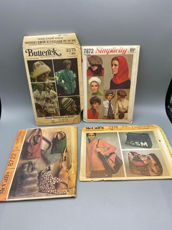 Set of 4 vintage patterns. 2 from McCall's, 1 Simplicity, 1 Butterick. For hats, purses and sweaters. Good condition, well kept. The sweater pattern has a ripped corner on the envelope but the pattern is ok. 1967, 1968, and 1970 were the dates found on patterns.
