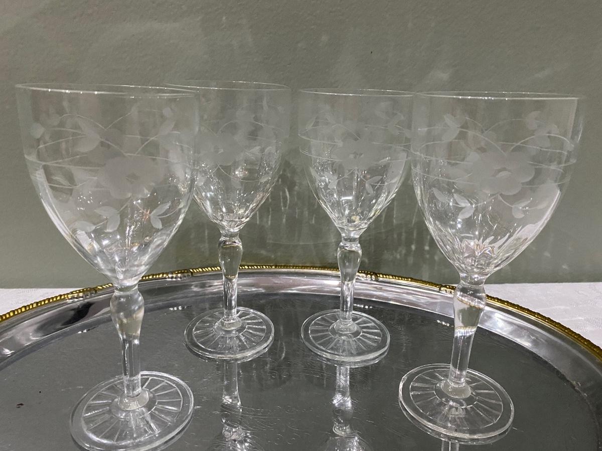 Set of 4 Vintage Lennox cut crystal etched wine glasses, Tiffin Franciscan. Approx 7-1/4” x 3-1/4”
