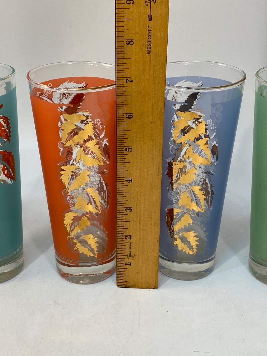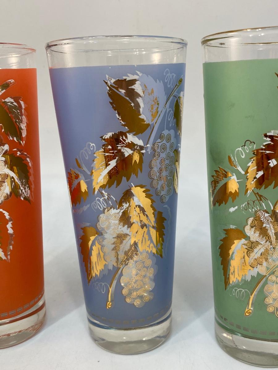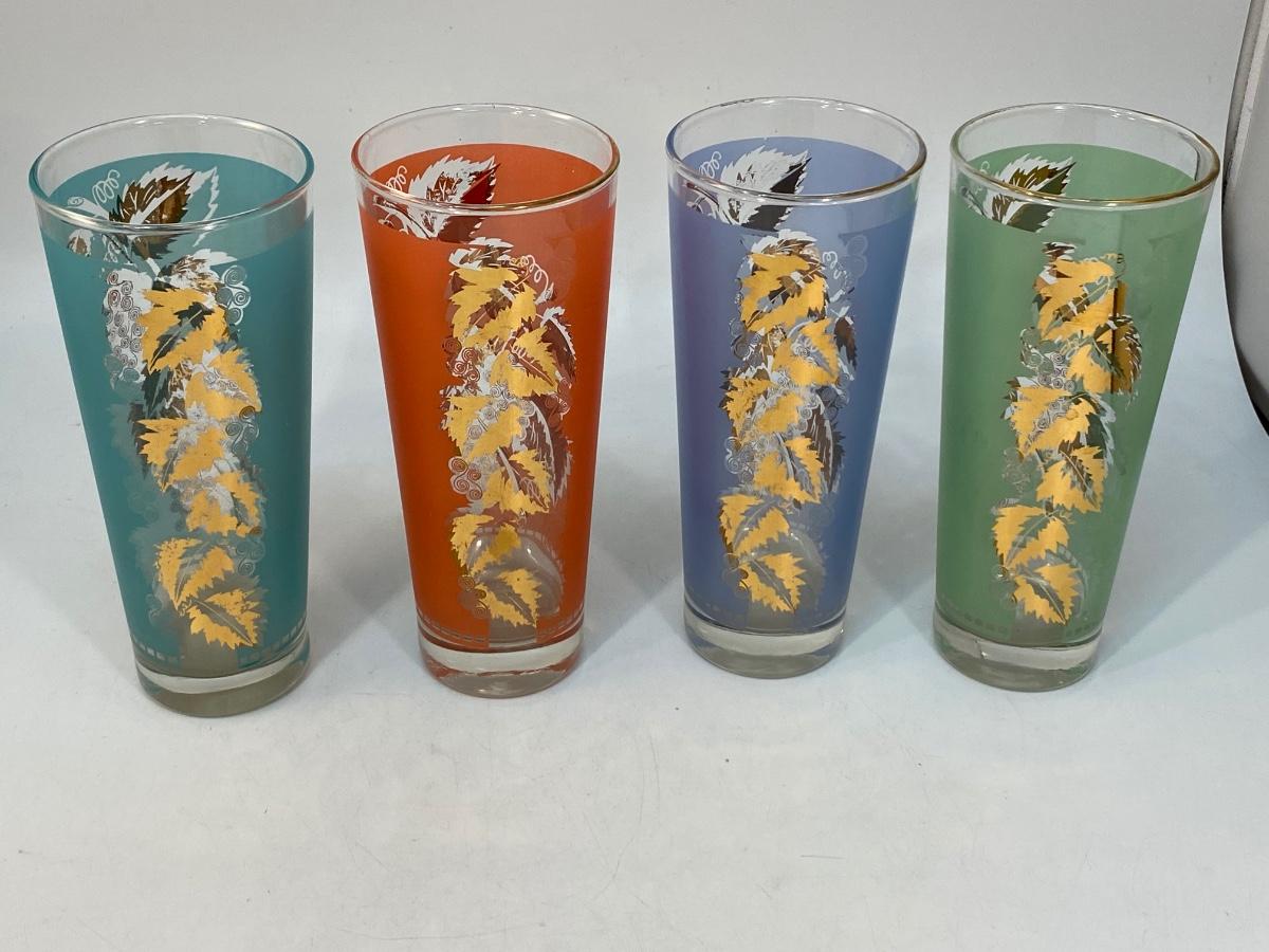 Set of 4 Vintage MCM Mid Century Multicolored Iced Tea Drink Glasses Gold Grape Leaves