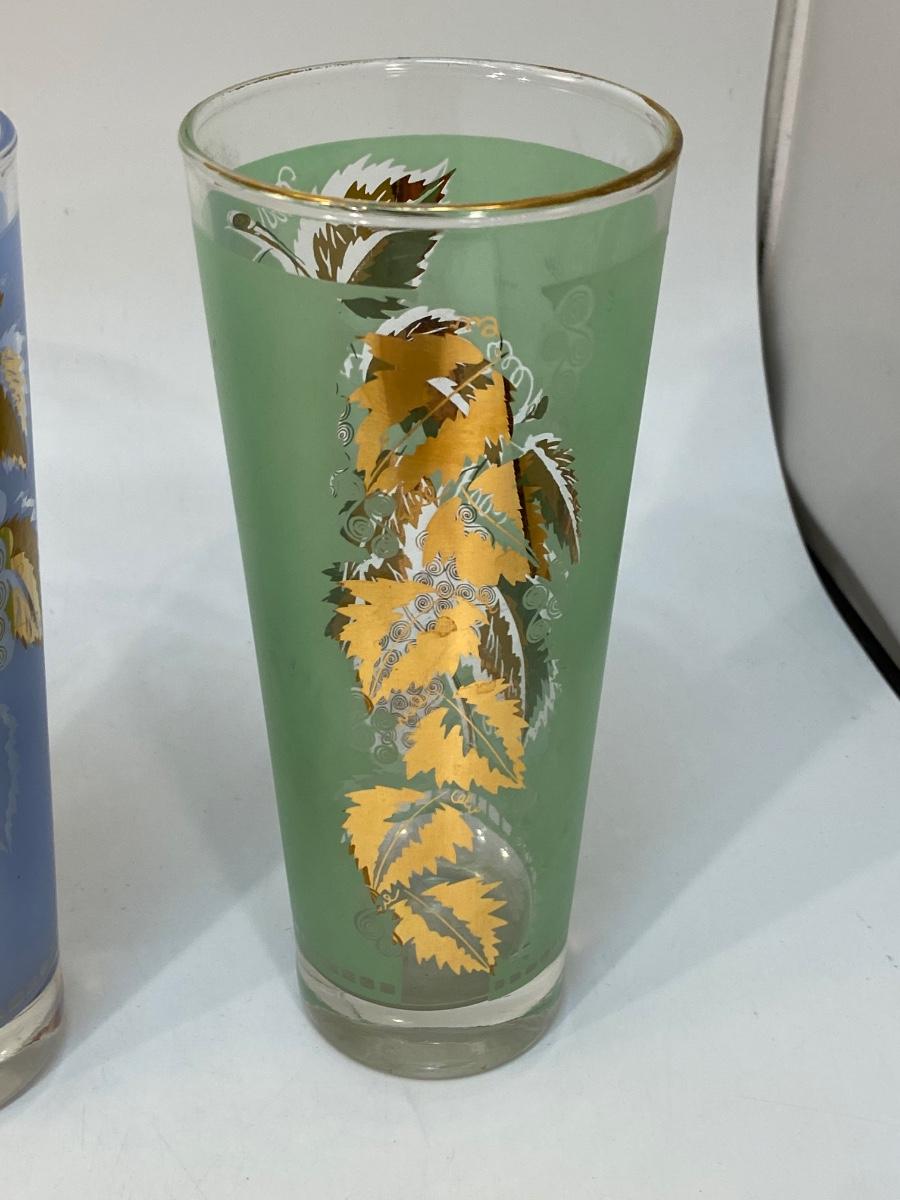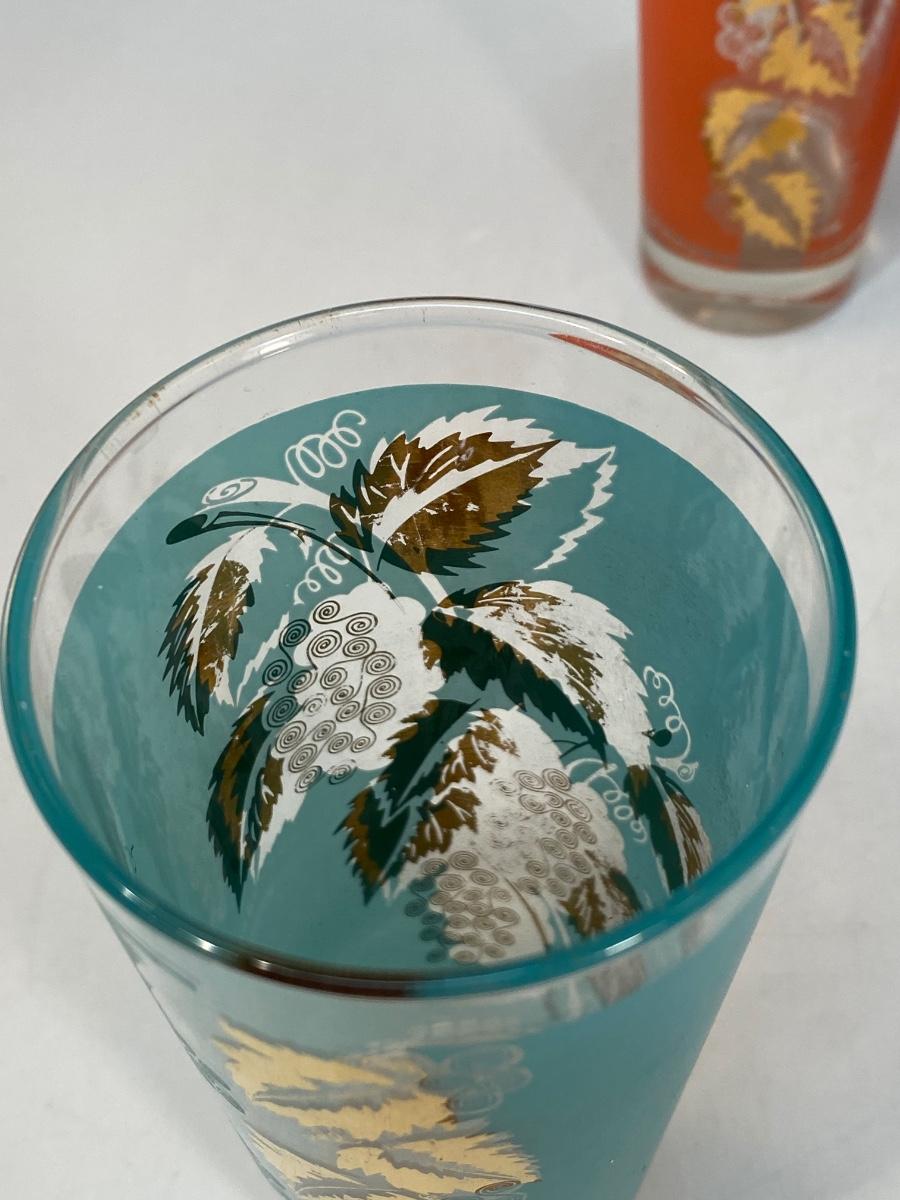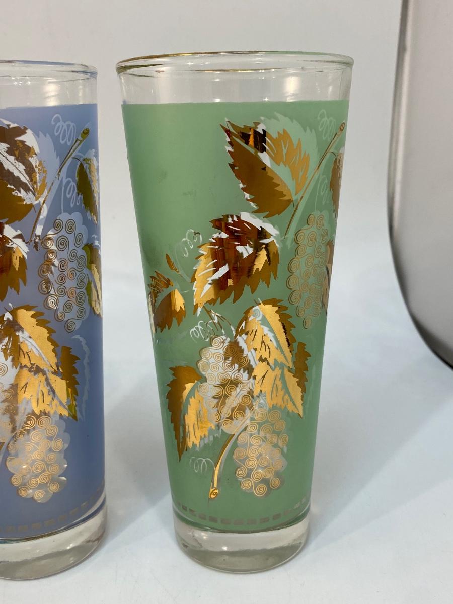 Set of 4 Vintage MCM Mid Century Multicolored Iced Tea Drink Glasses Gold Grape Leaves