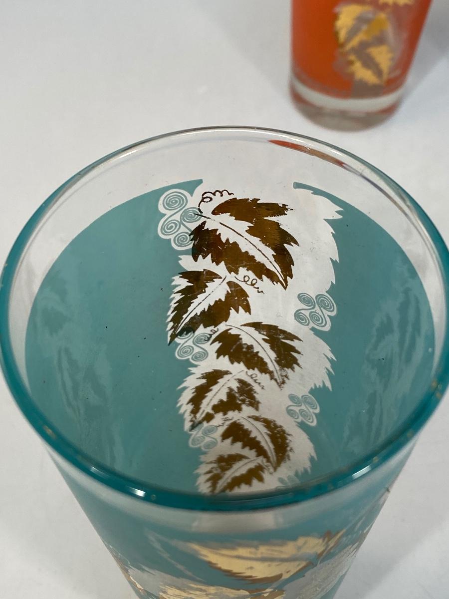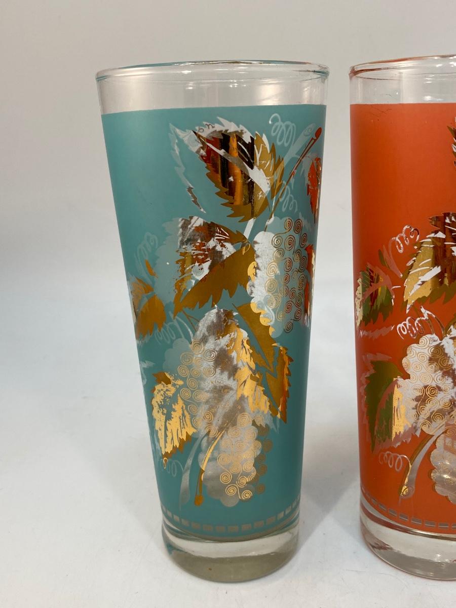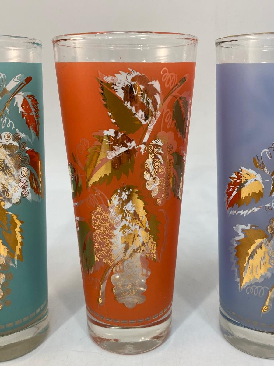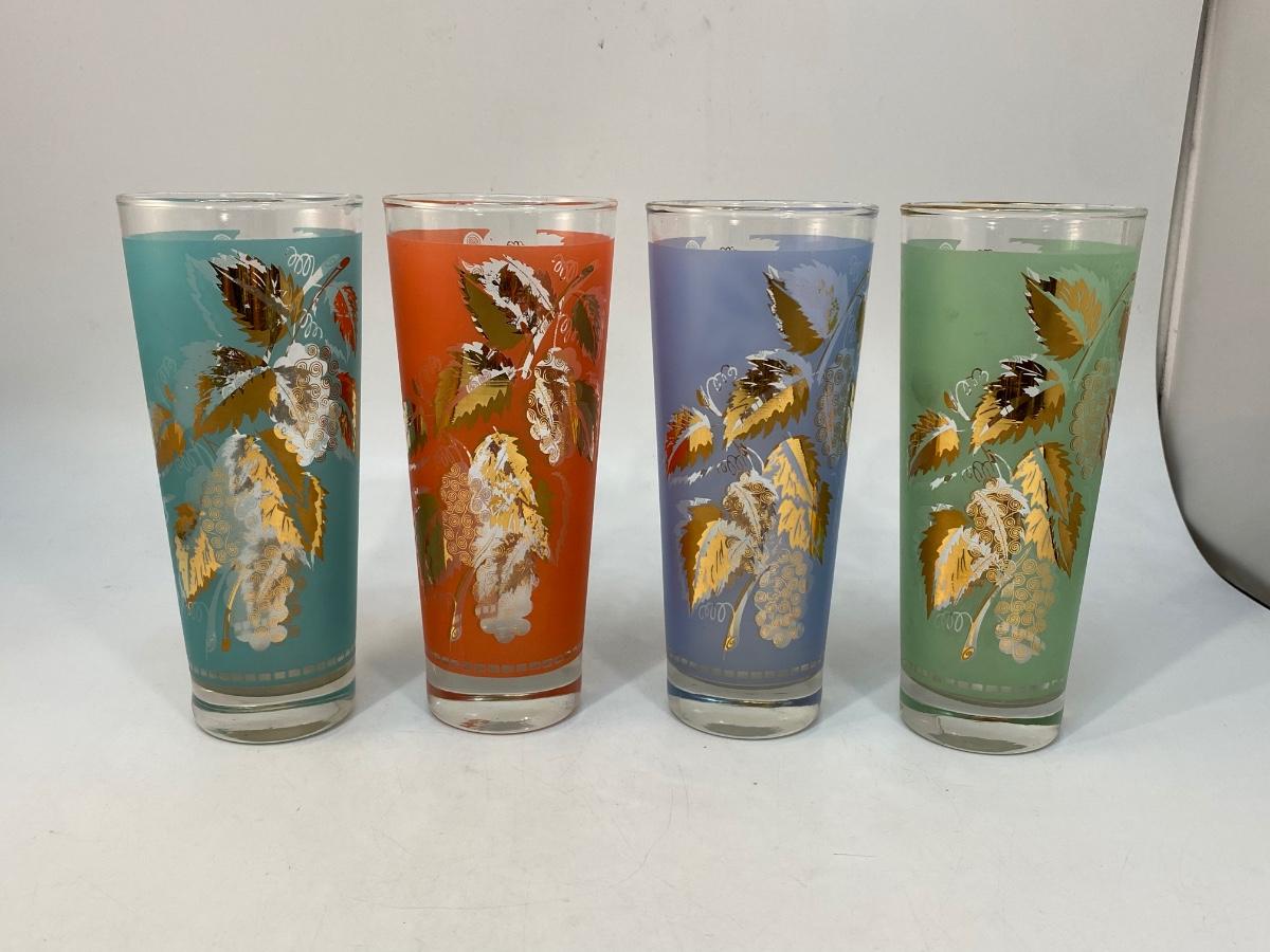 Set of 4 Vintage MCM Mid Century Multicolored Iced Tea Drink Glasses. Teal, coral, periwinkle, and green colored glasses with a gold grape vine design on two sides. The gold has worn a bit from use and age, but the images are still recognizable. Glasses stand about 7" and are in overall good vintage condition.