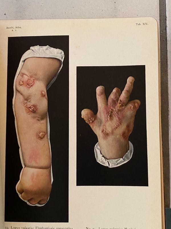 Set of 4 vintage medical books. Mixed subjects, mainly dealing in dermatology. The book with no cover has some graphic colored photos of different dermatological diseases, some of which are on deceased people.