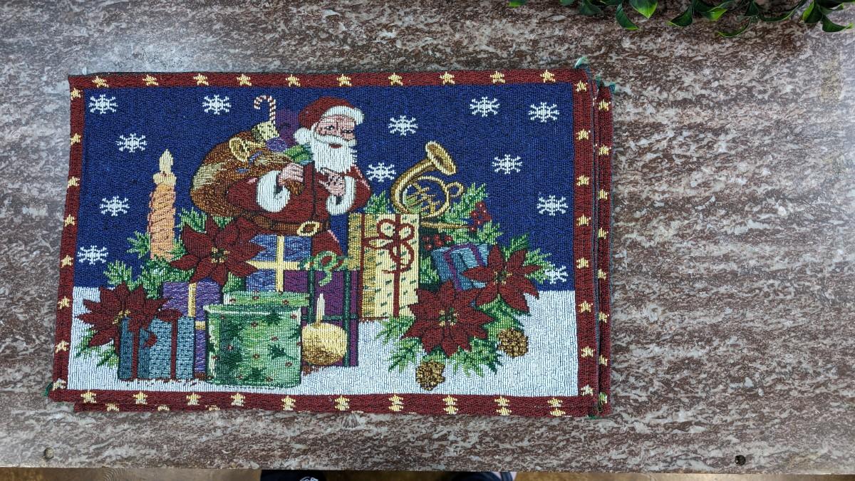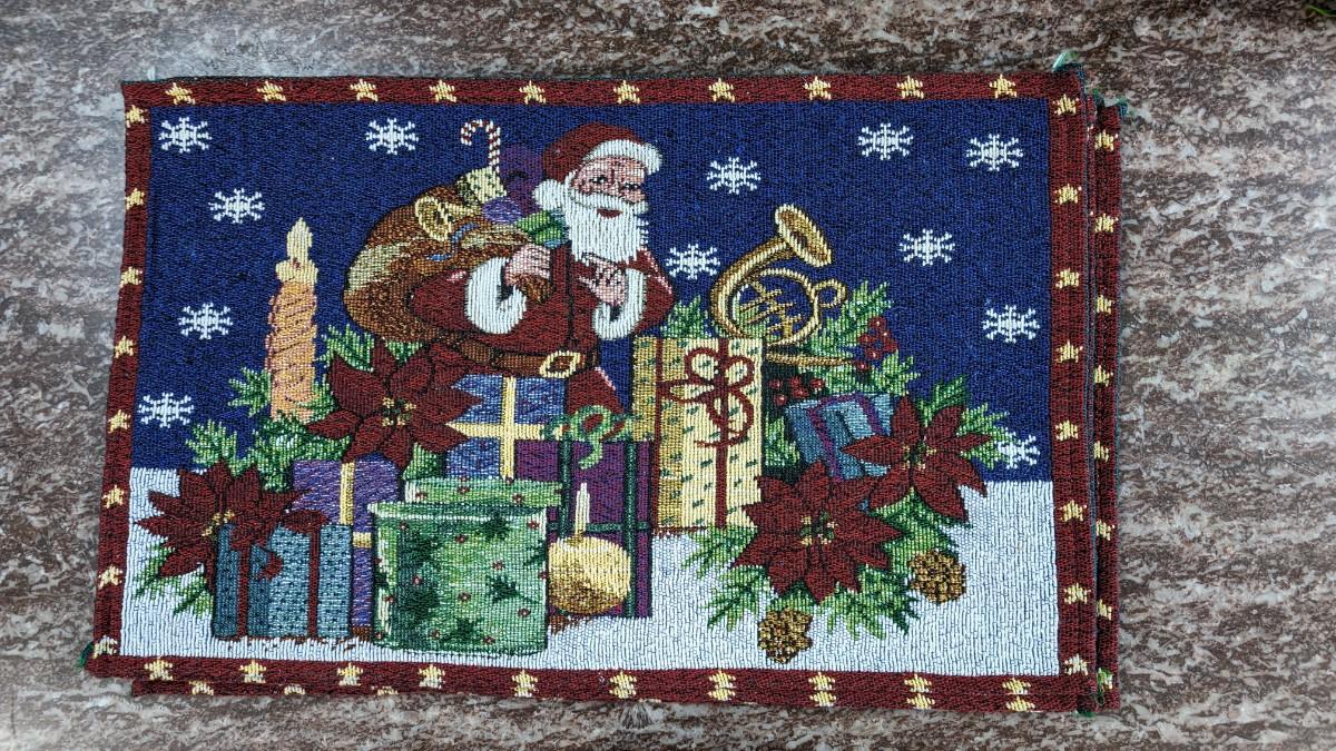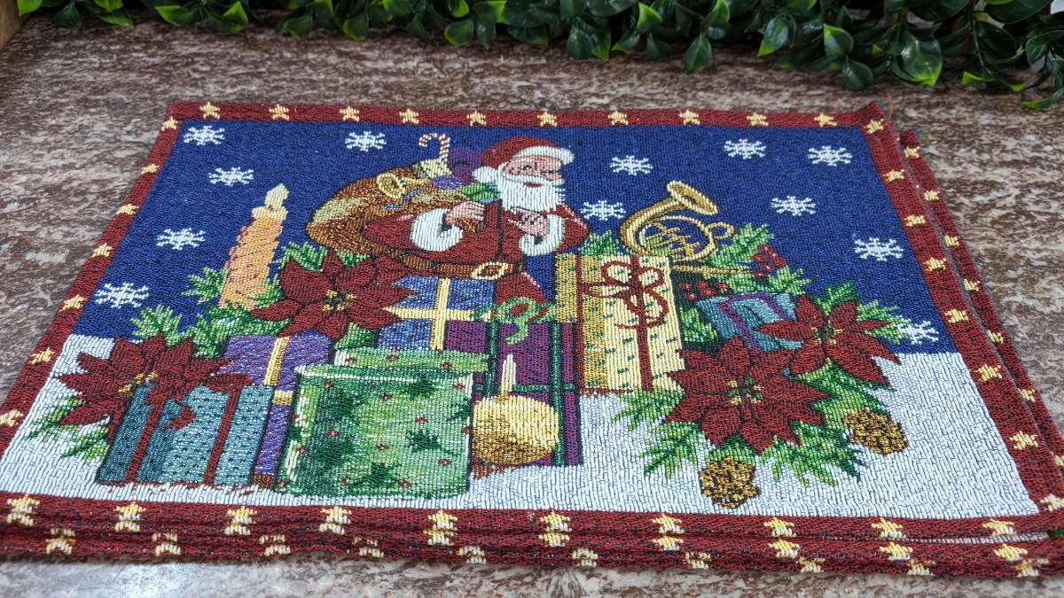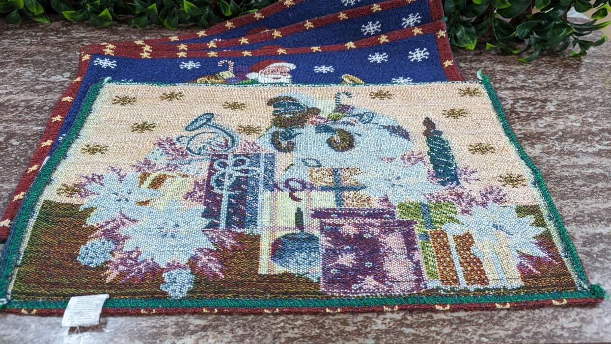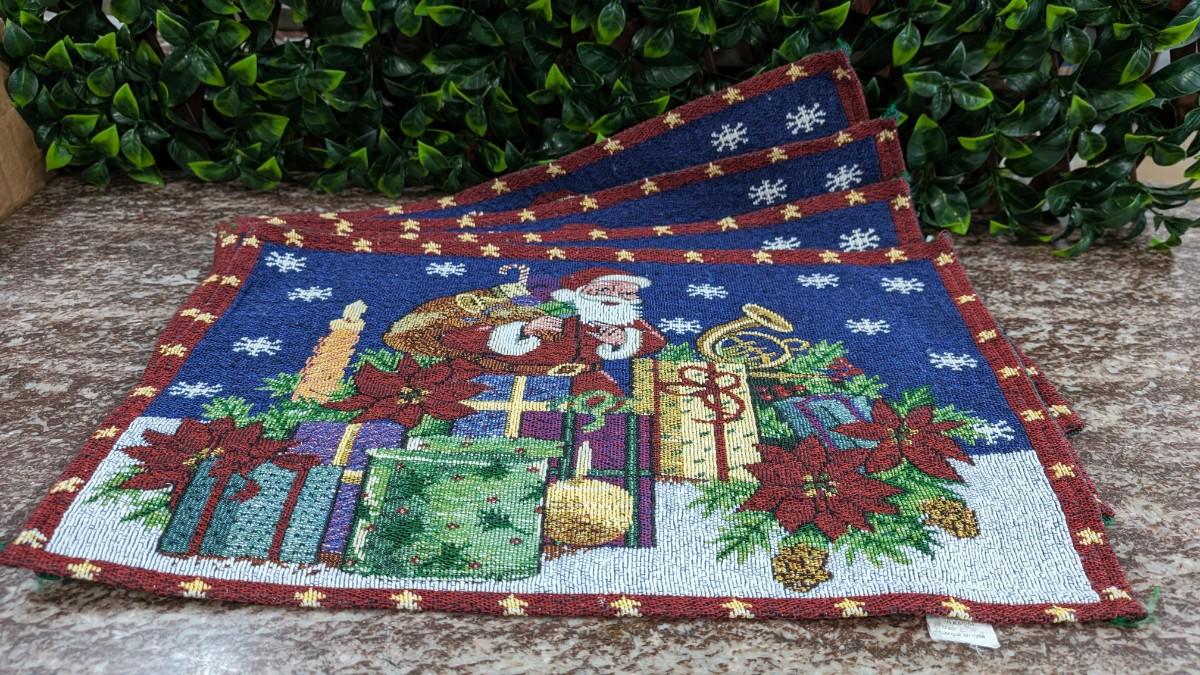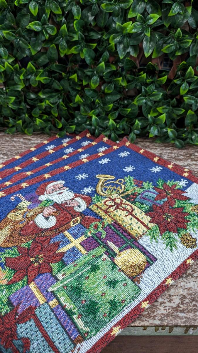 This is a Set of 4 Vintage Santa Placemats Christmas Cloth Poinsettia