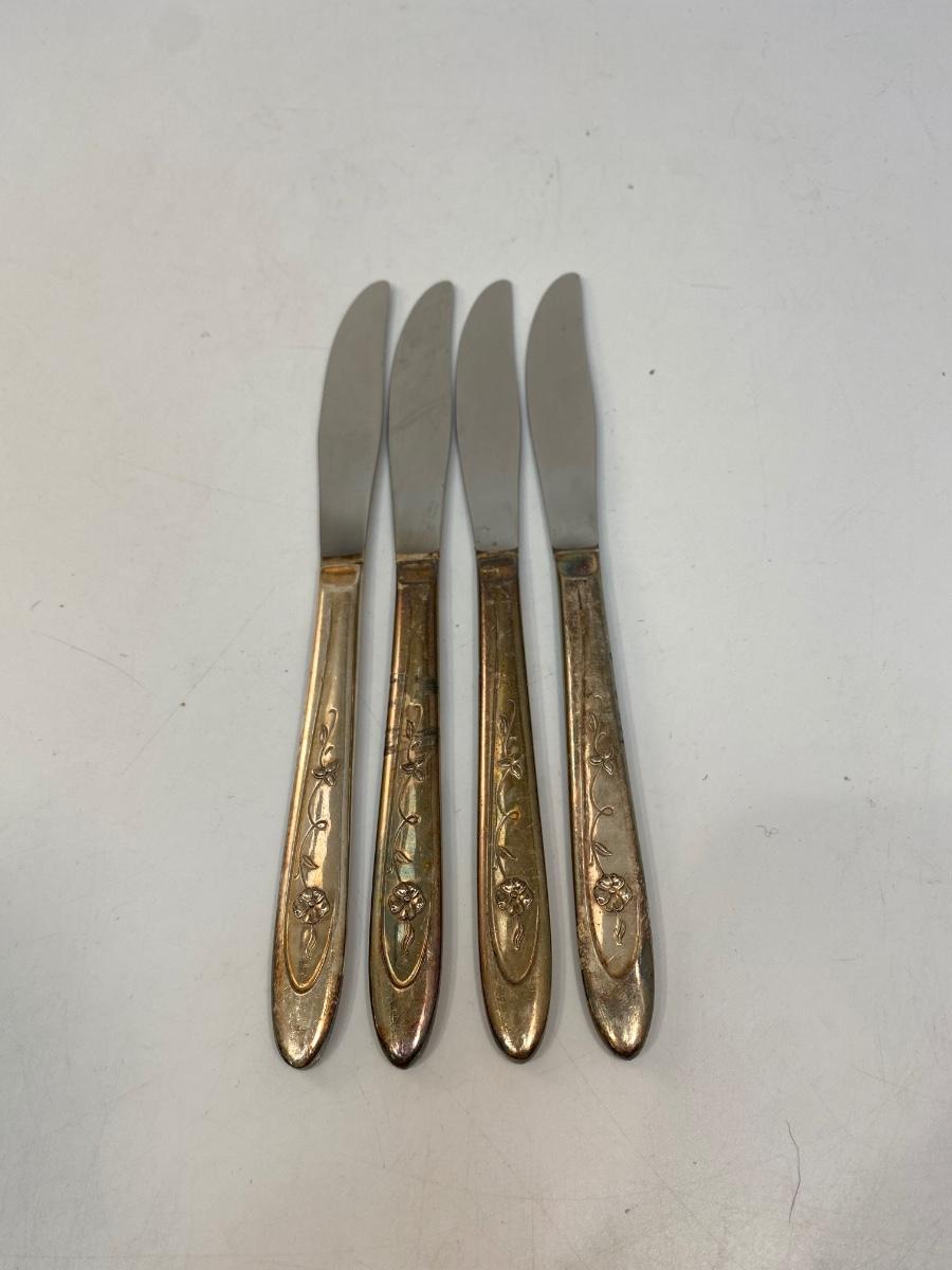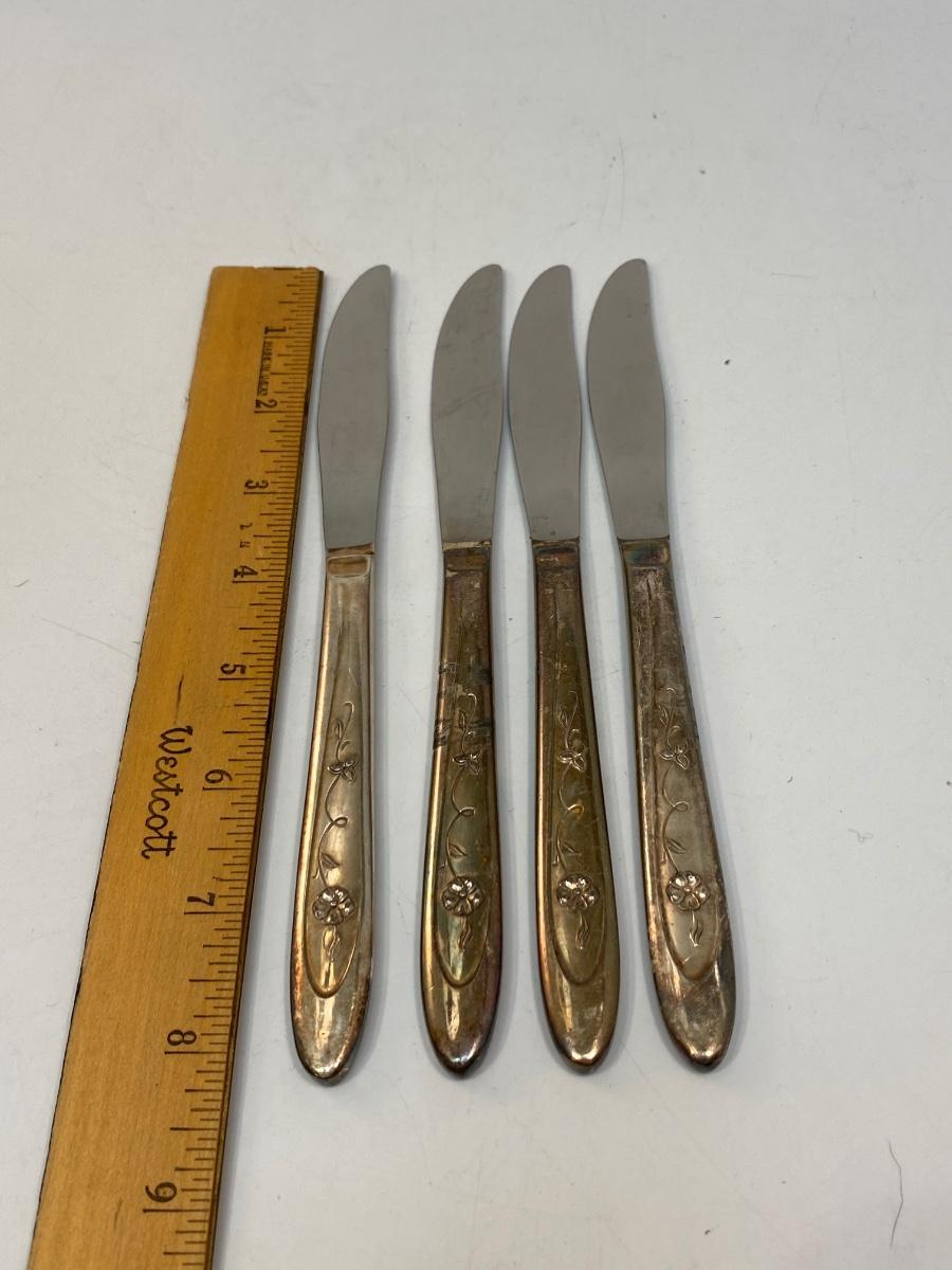 Set of 4 Vintage Silver Plate Hollow Handle Small Dinner Knife. Matching set. Some wear from age, simple flower pattern.