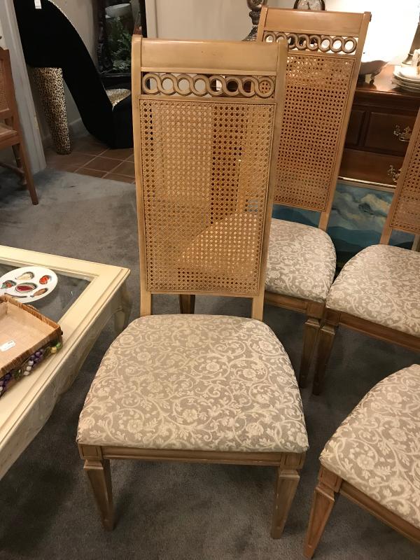Set of 4 vintage 1960's Thomasville dining side chairs. Italian style with caned backs and upholstered seats in a gold scroll pattern. Caning in excellent condition. Pecan finish. Excellent condition. 21" x 24" x 45" H each.