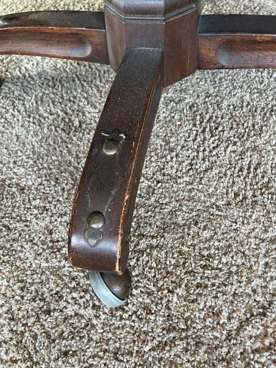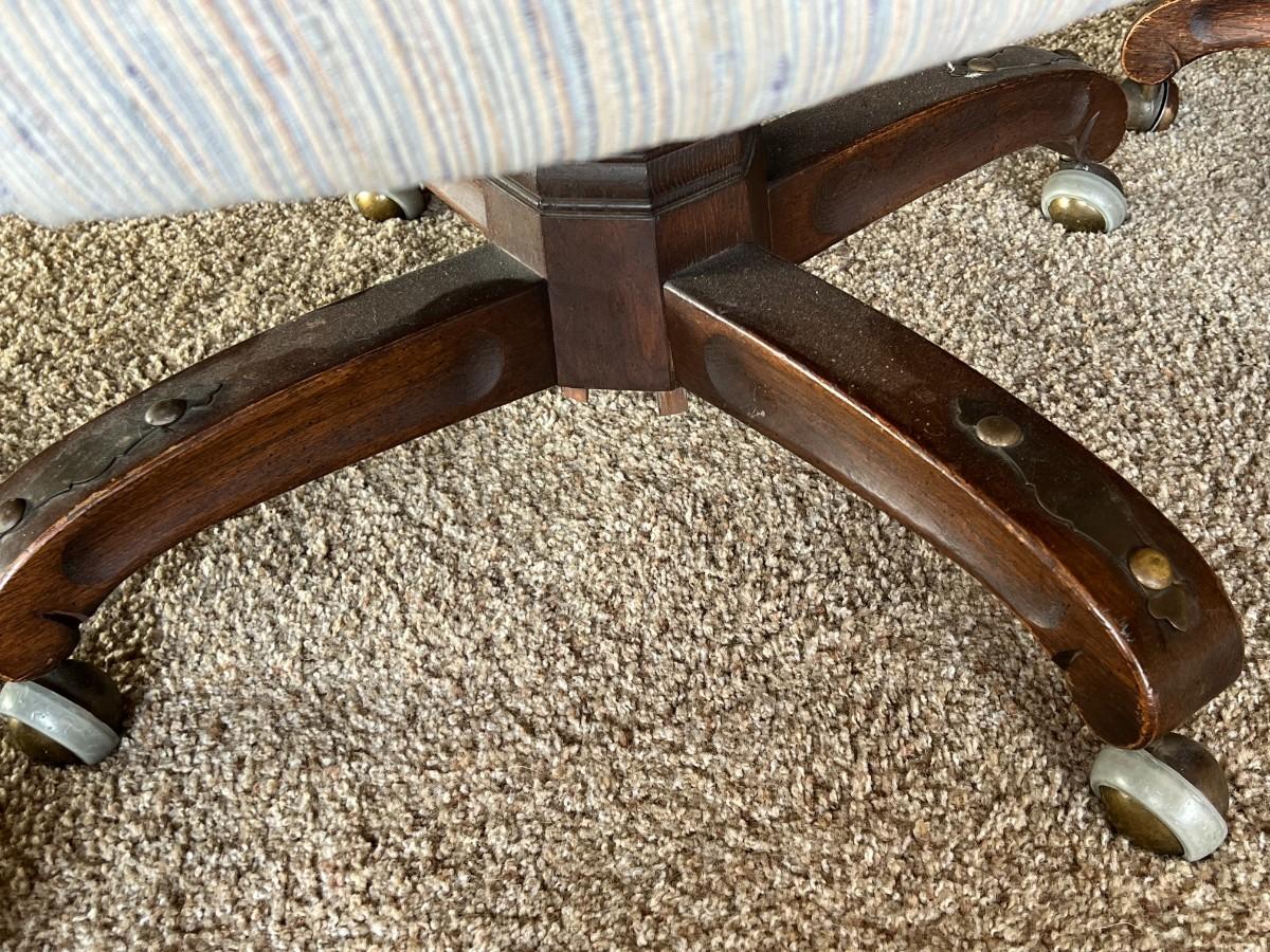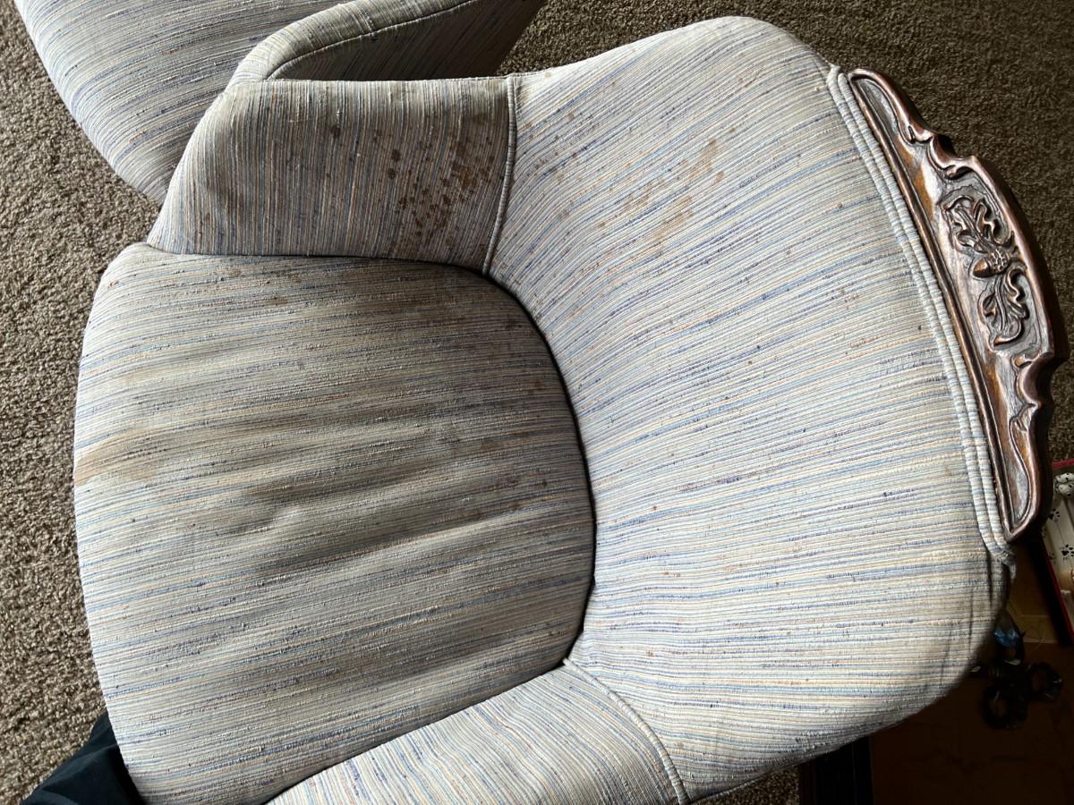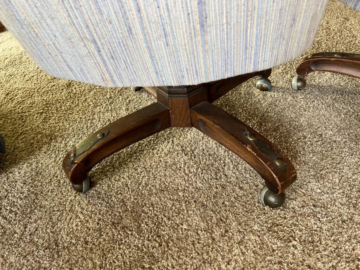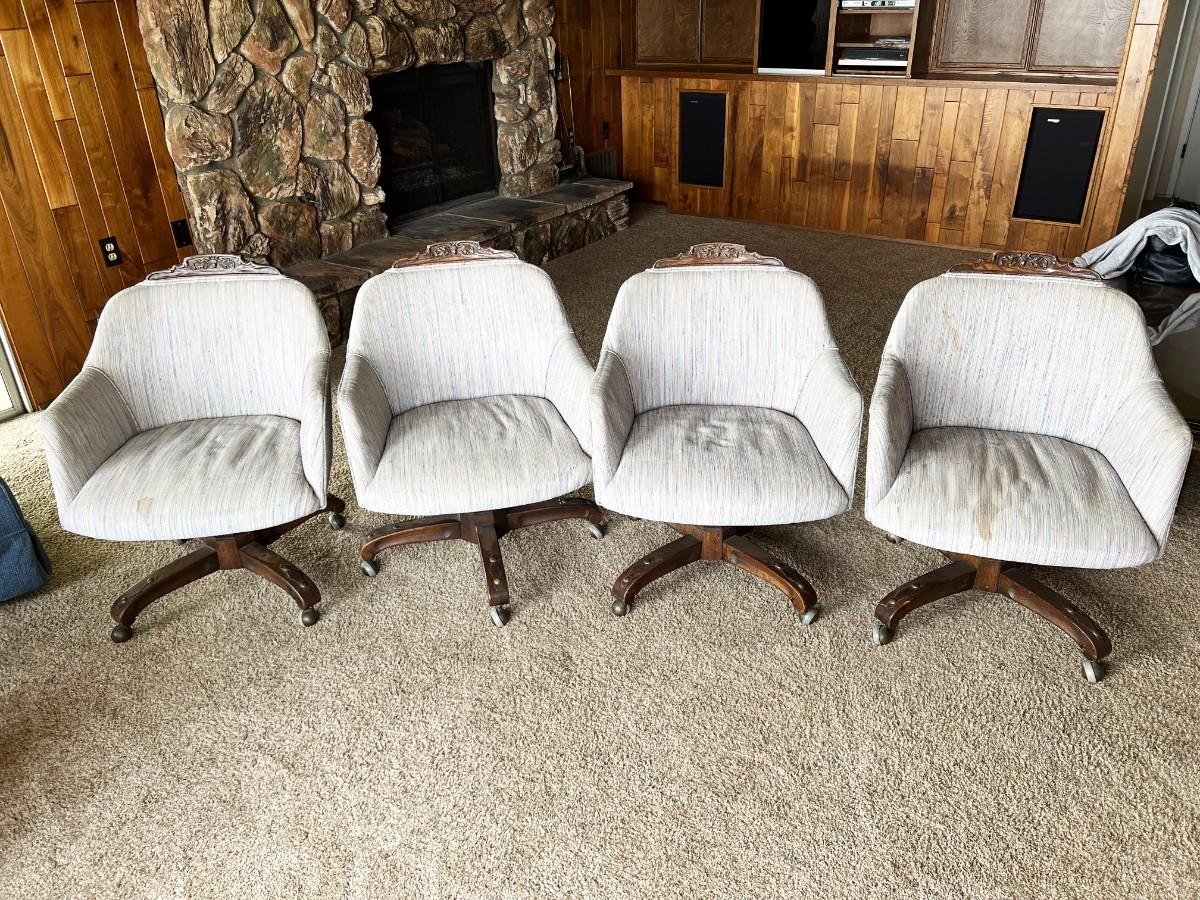 Set of 4 Vintage Upholstered Barrel Dining Chairs. In vintage condition, light wear from age. On wheels.