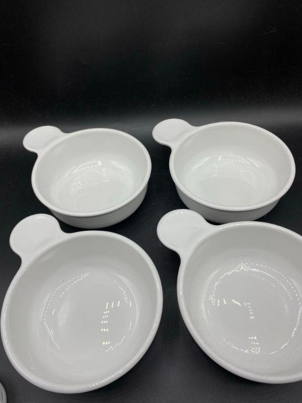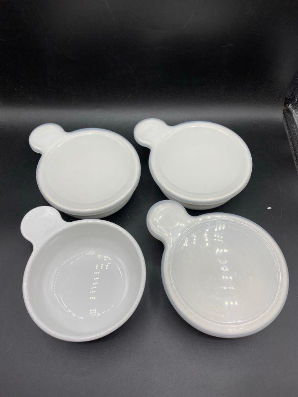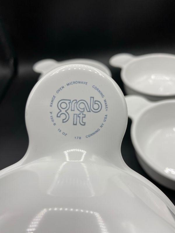 Set of 4 white Corning Grab it bowls. Single handle bowls. Oven and microwave proof. Come with 3 plastic lids. Very good condition.