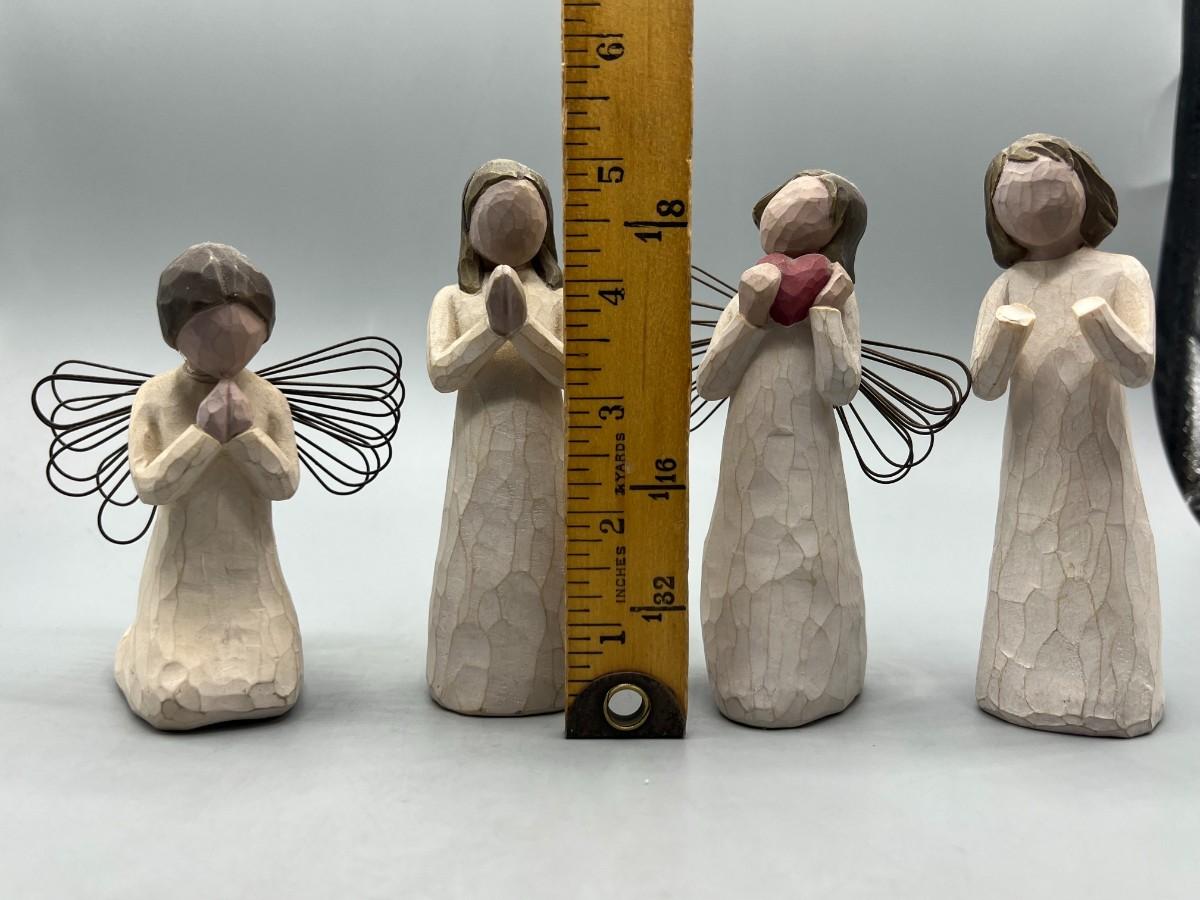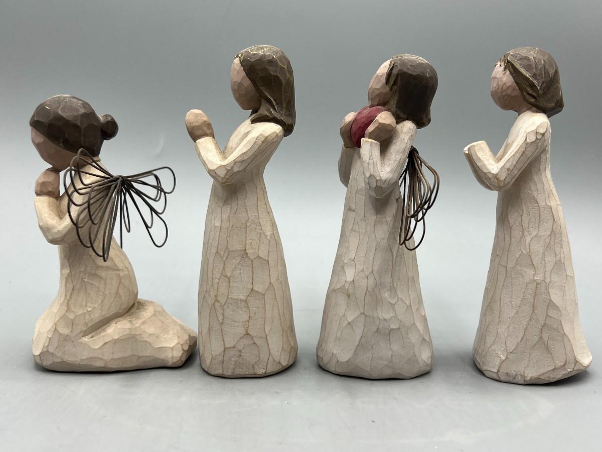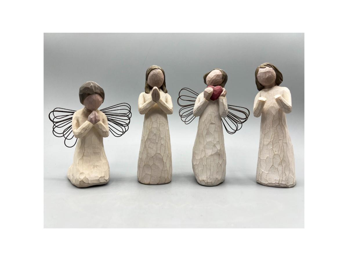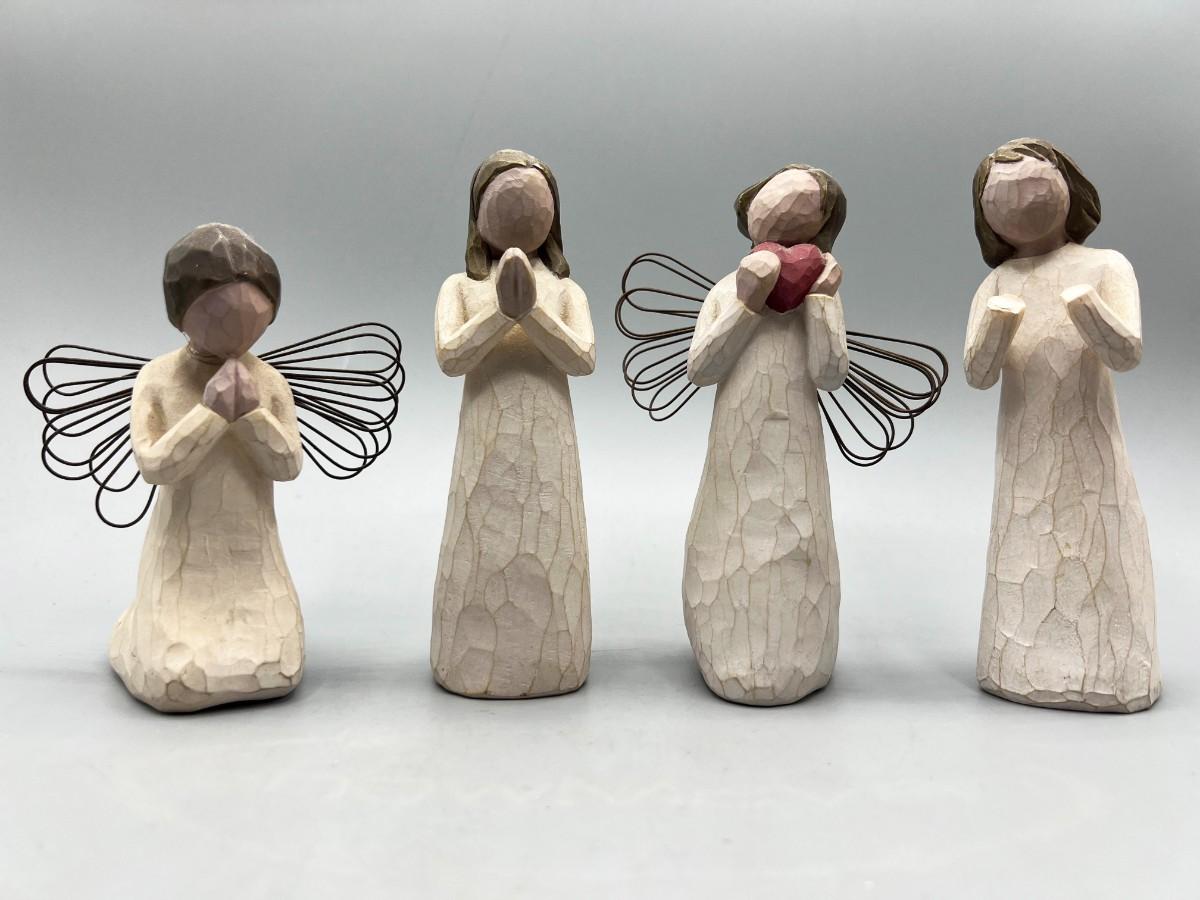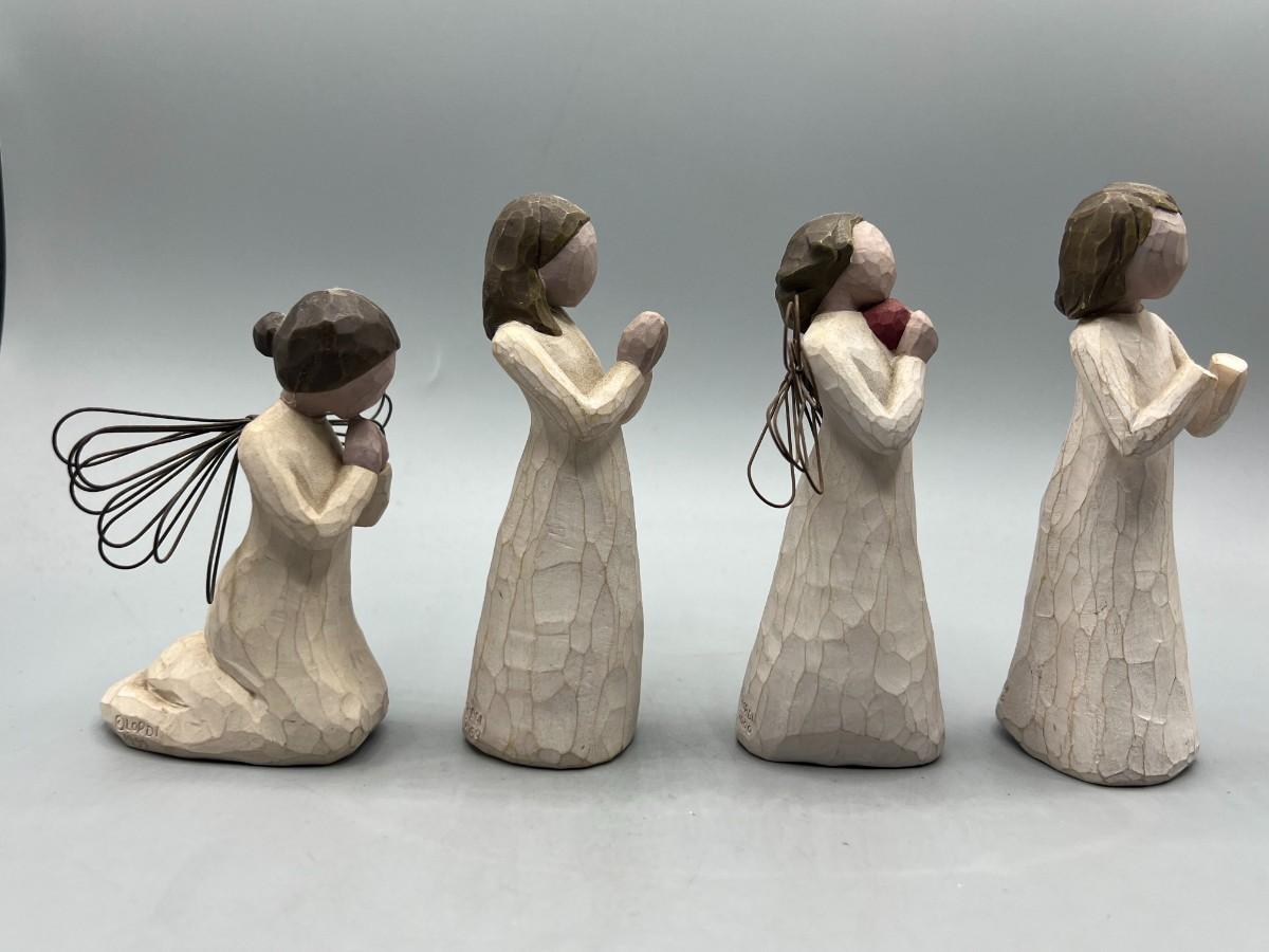 Set of 4 Willow Tree Angel Figurines. Angel of prayer, Sisters by Heart (2), and Angel of the Heart. One of the Sisters by Heart figurines is damaged.