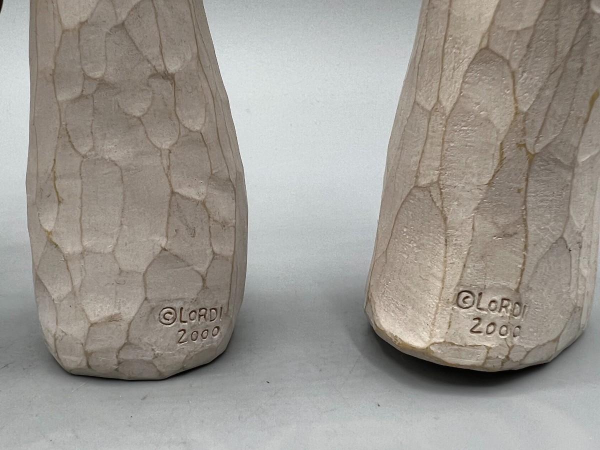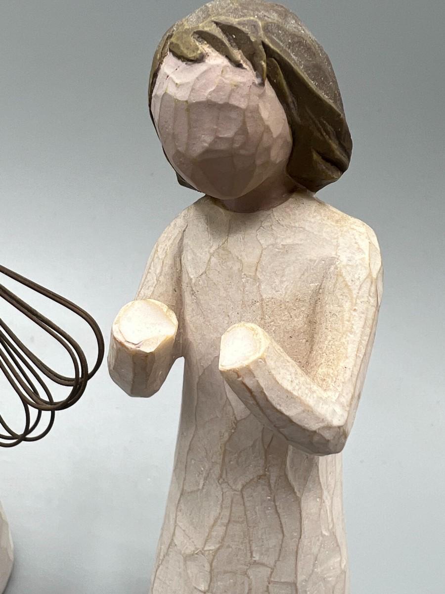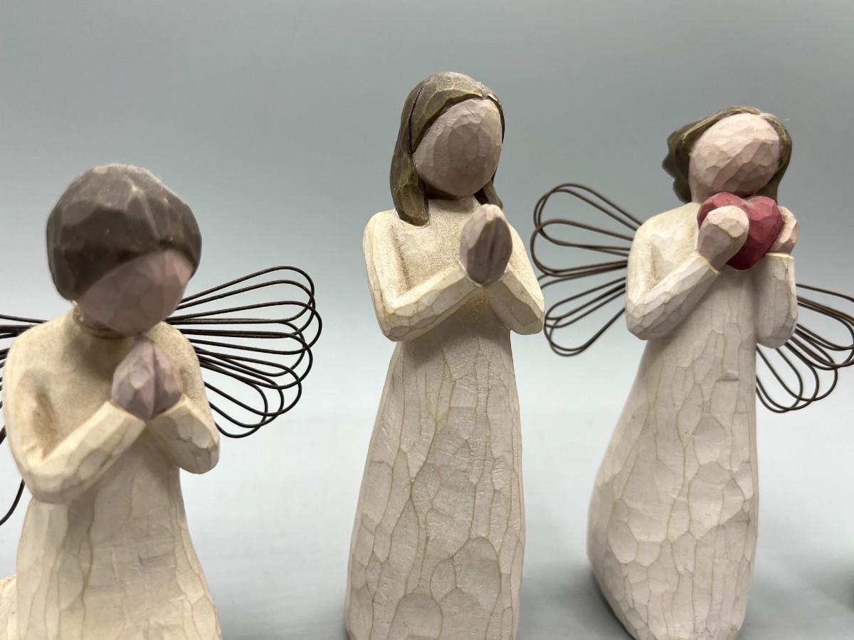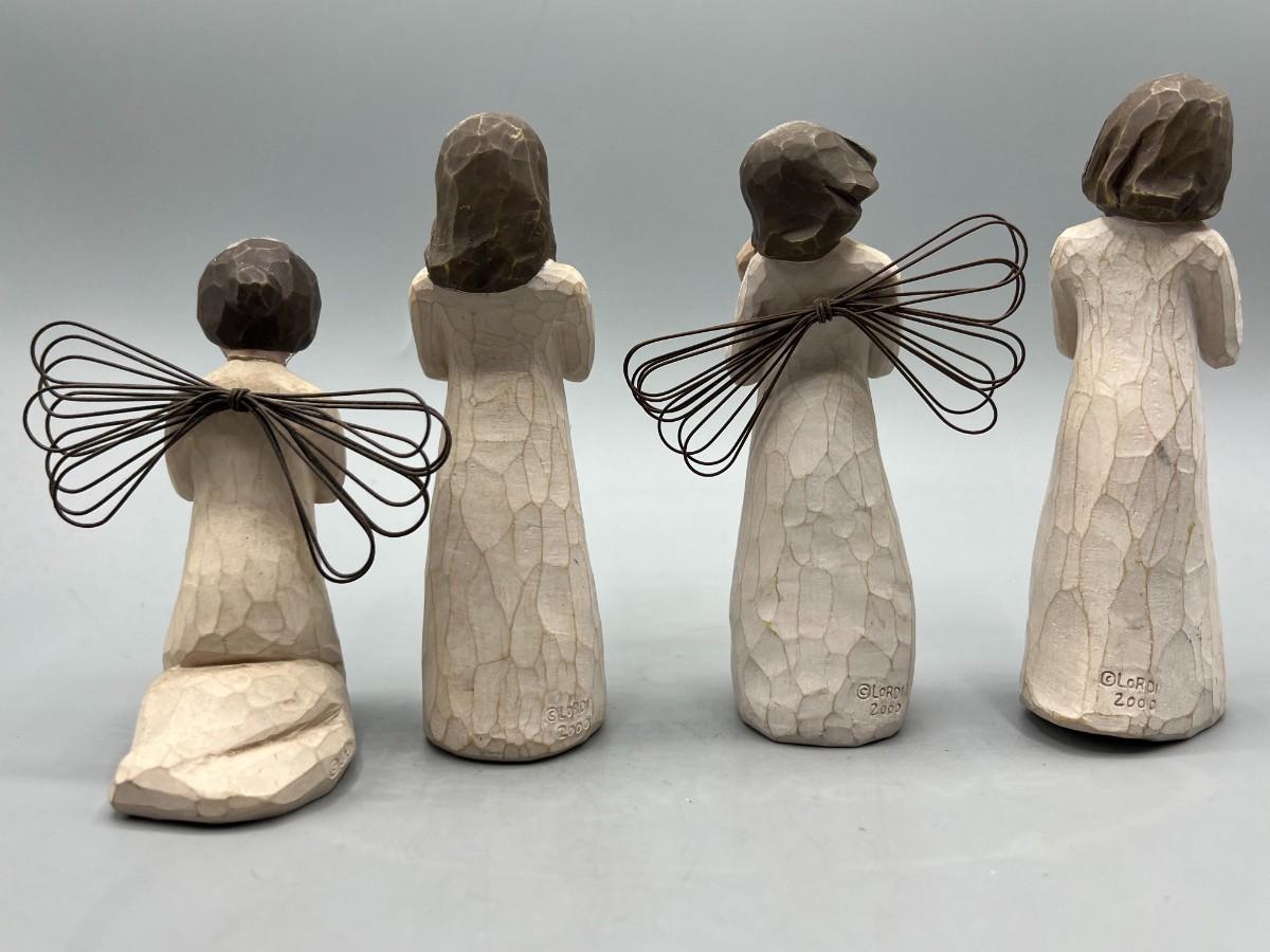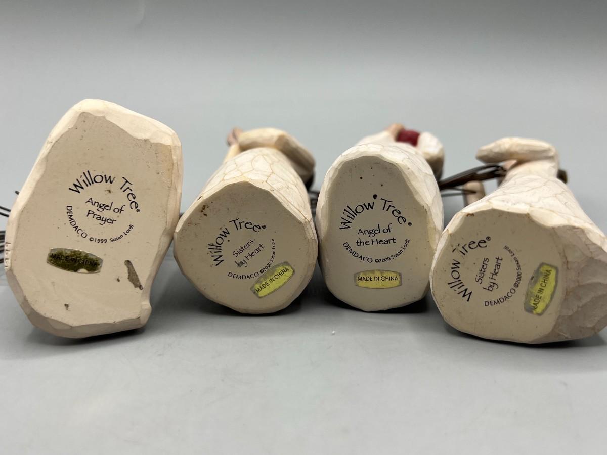 Set of 4 Willow Tree Angel Figurines. Angel of prayer, Sisters by Heart (2), and Angel of the Heart. One of the Sisters by Heart figurines is damaged.