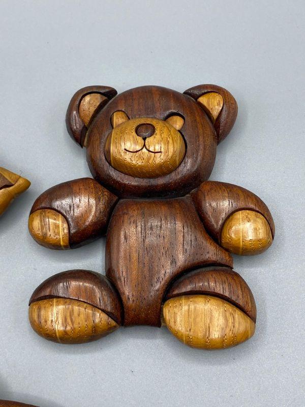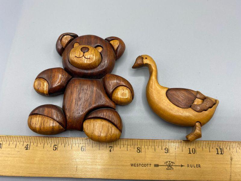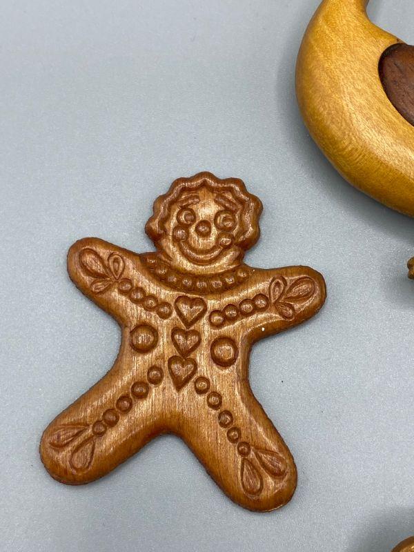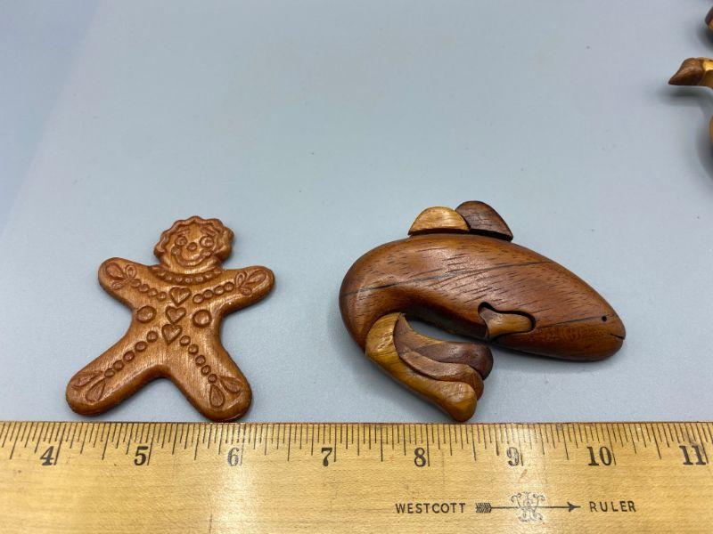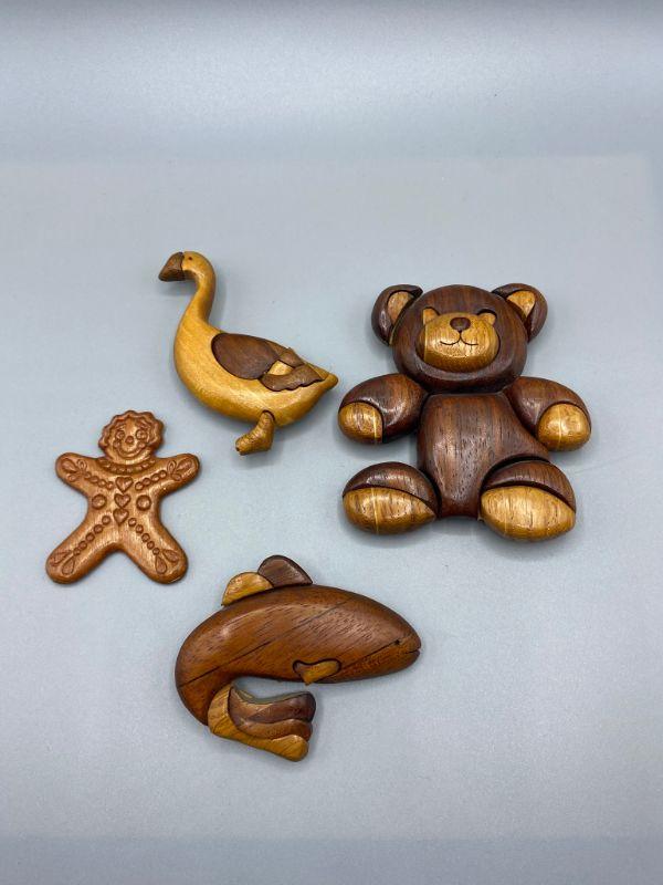 Set of 4 wood fridge magnets. Multitone wood on three magnets. Larger size. Magnets include a gingerbread man, a goose, a bear, and a fish.