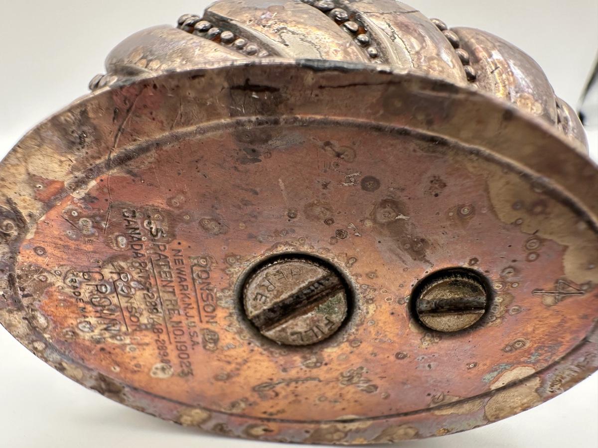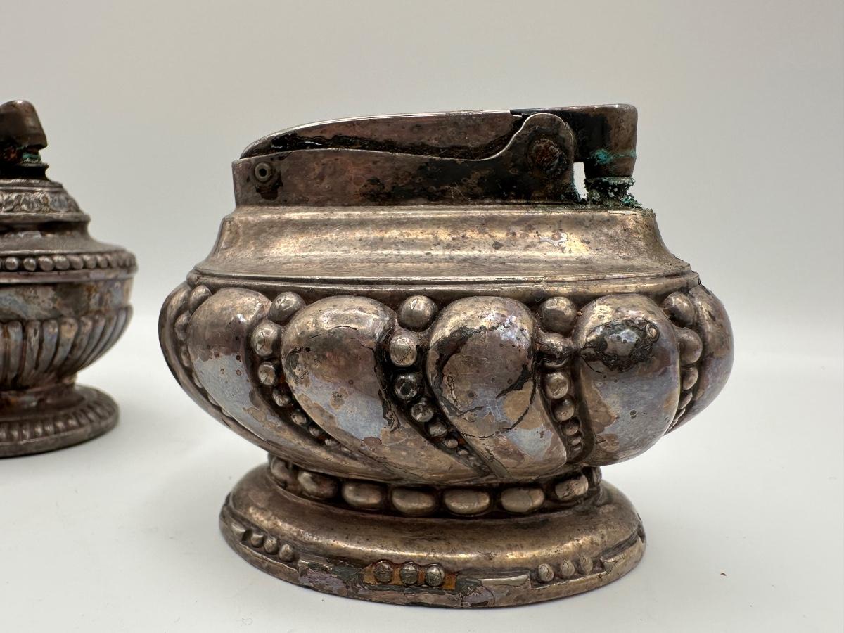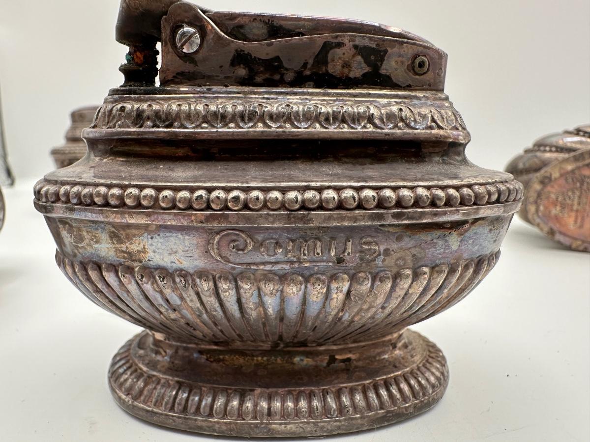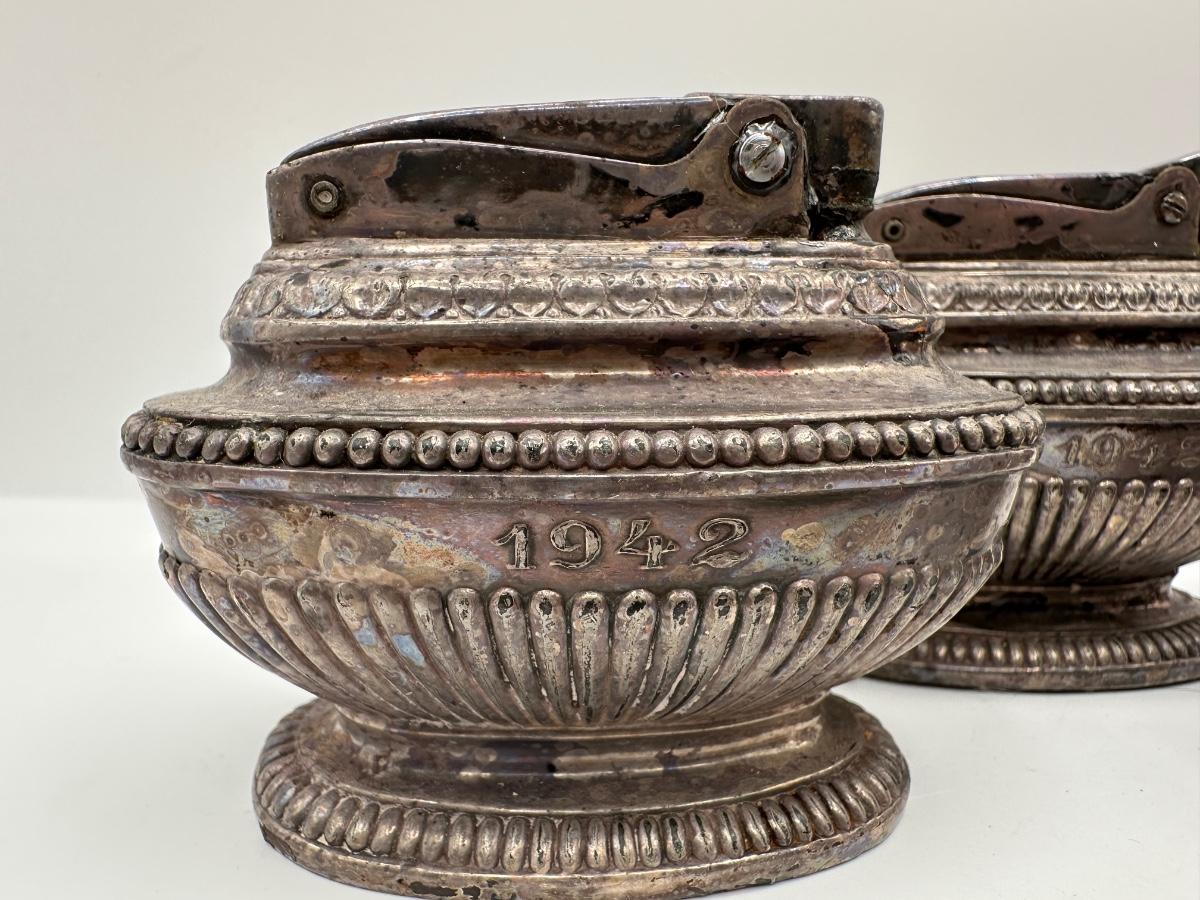 Set of three matching silver-plate table lighters, each stamped 1942 and “Comus” on the opposite side. One is not marked with 1942. Decorative beaded and fluted design with lift-arm lighter tops (all currently seized from age, sold as-is). measuring approx. 3” tall.