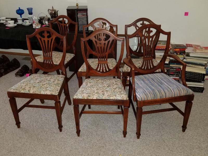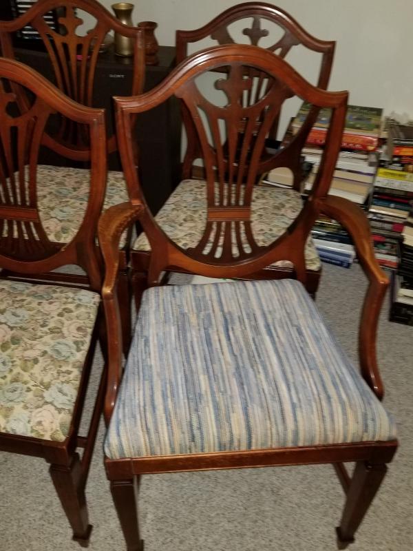 Set includes 1 captains chair and 5 regular chairs. As you can see in pictures the fabric is different on the captains chair. Overall very good shape some light scratches, otherwise ready to use.
