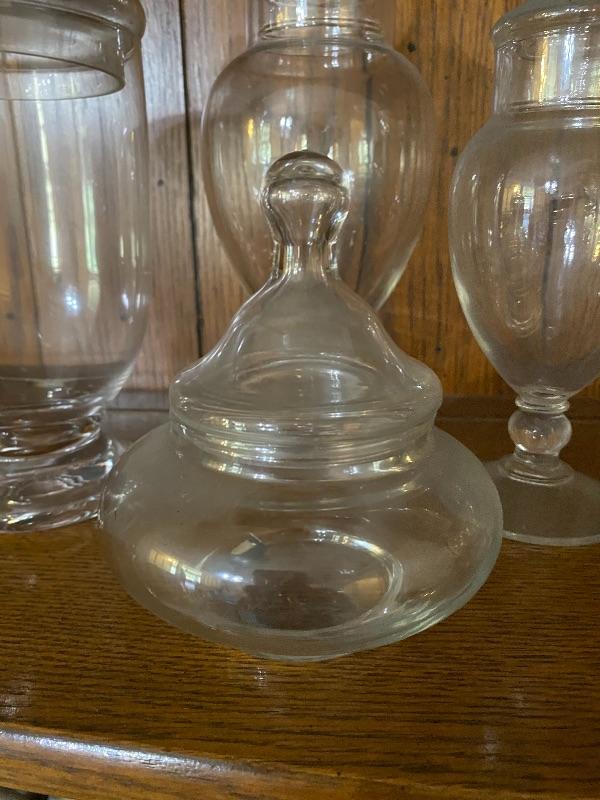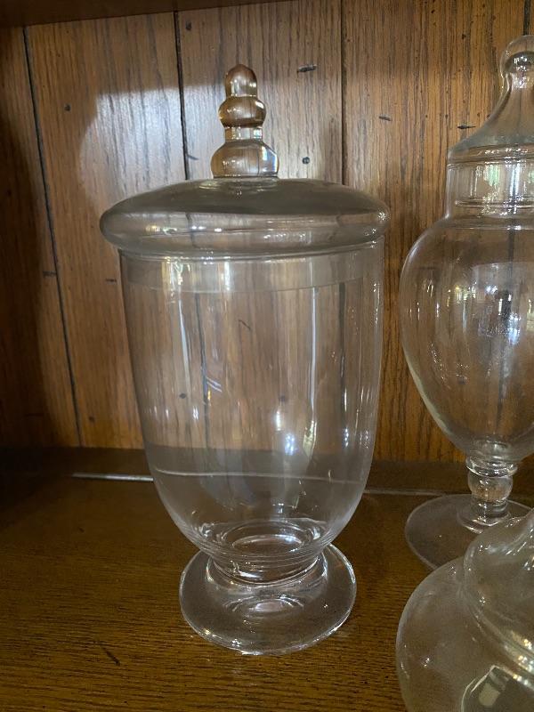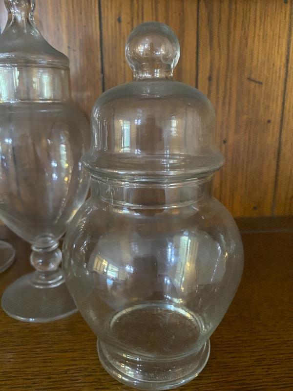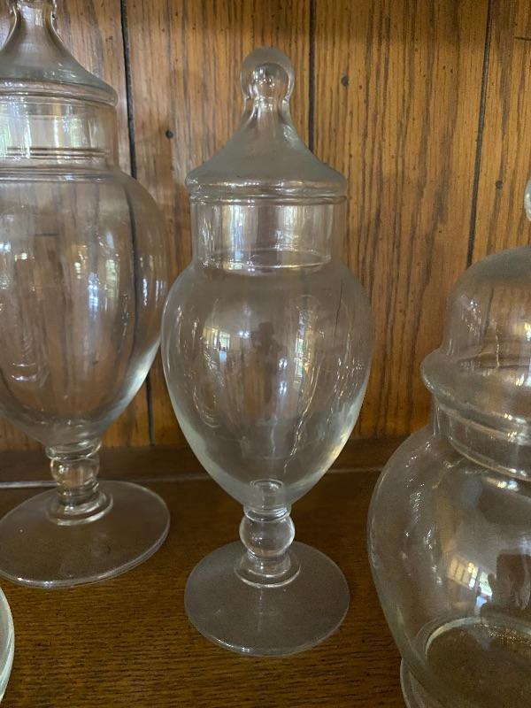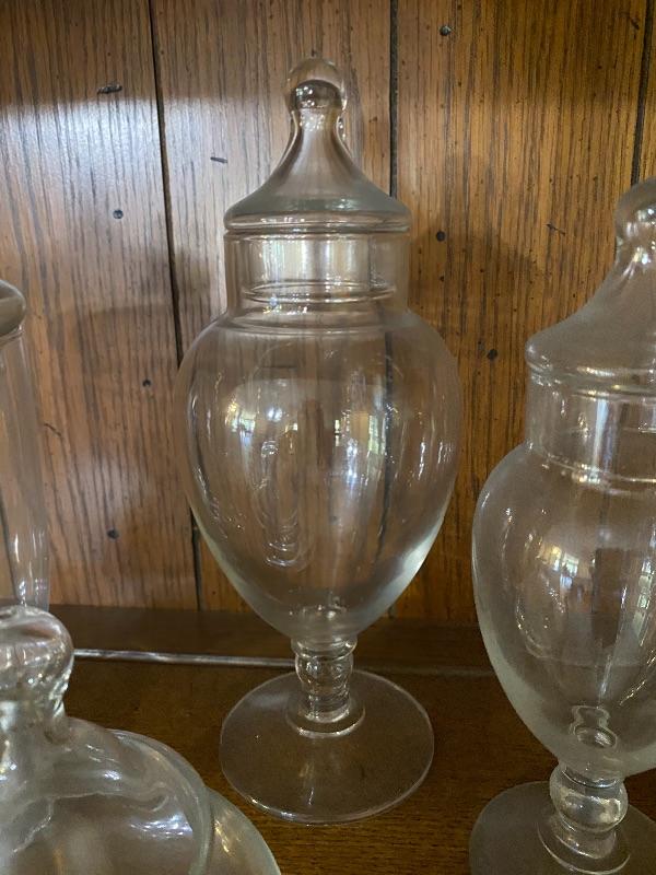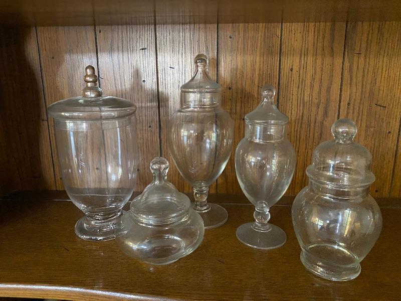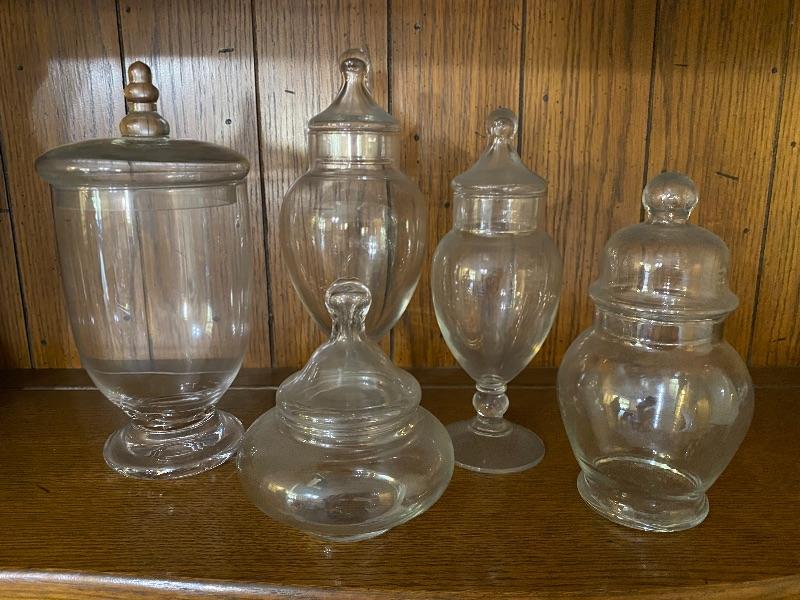 5 apothecary candy jars. Different sizes. Clear glass. About 12” or less in size. Good condition.