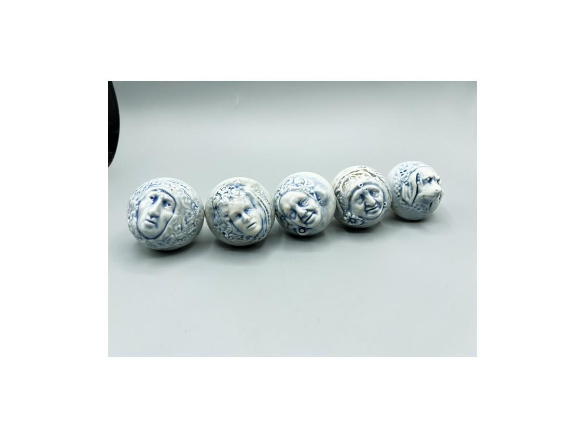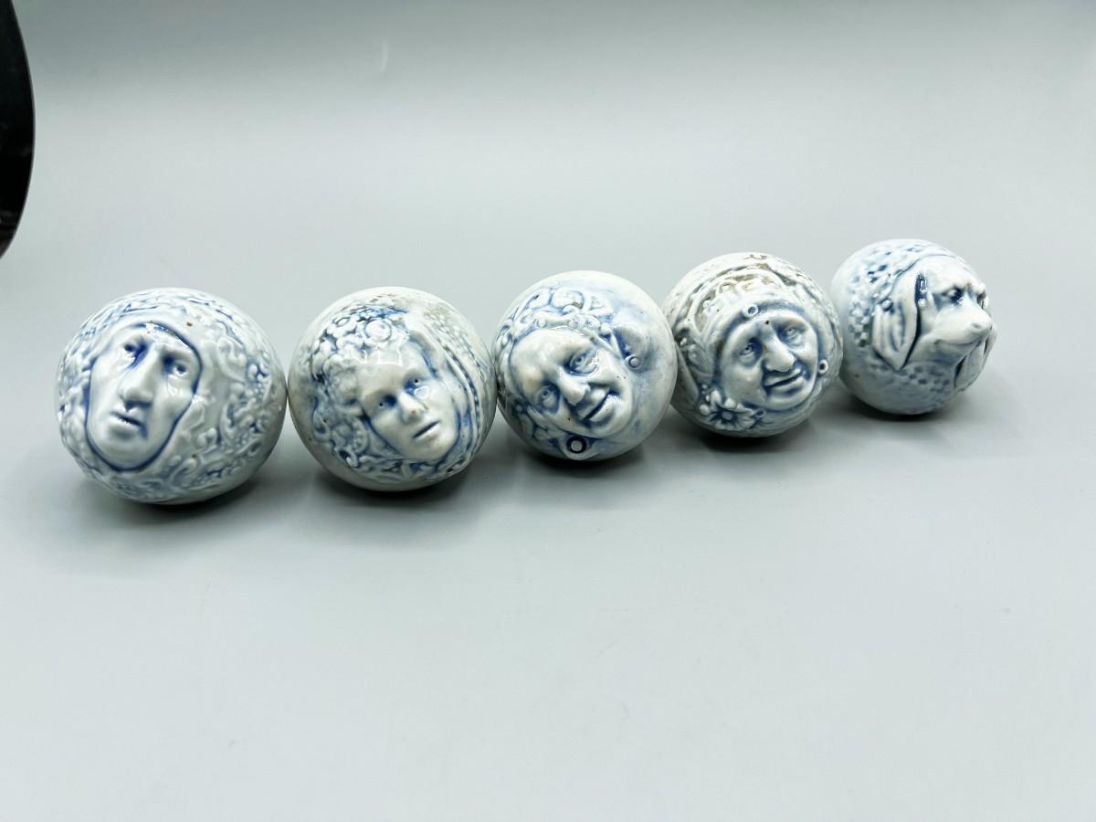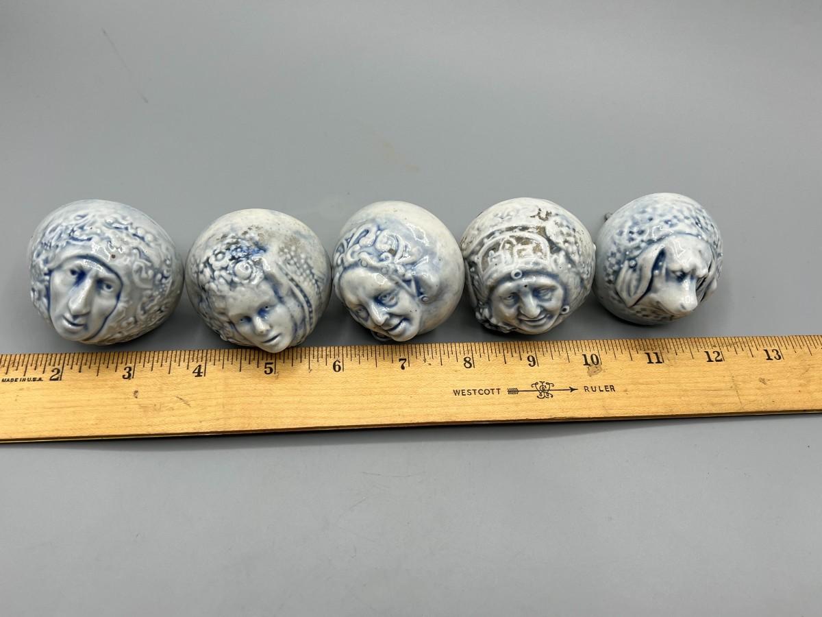 Set of 5 Ceramic Blue Tint Figura; Faces Drawer Pulls Knobs