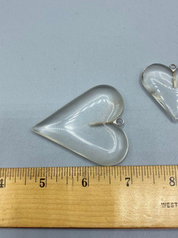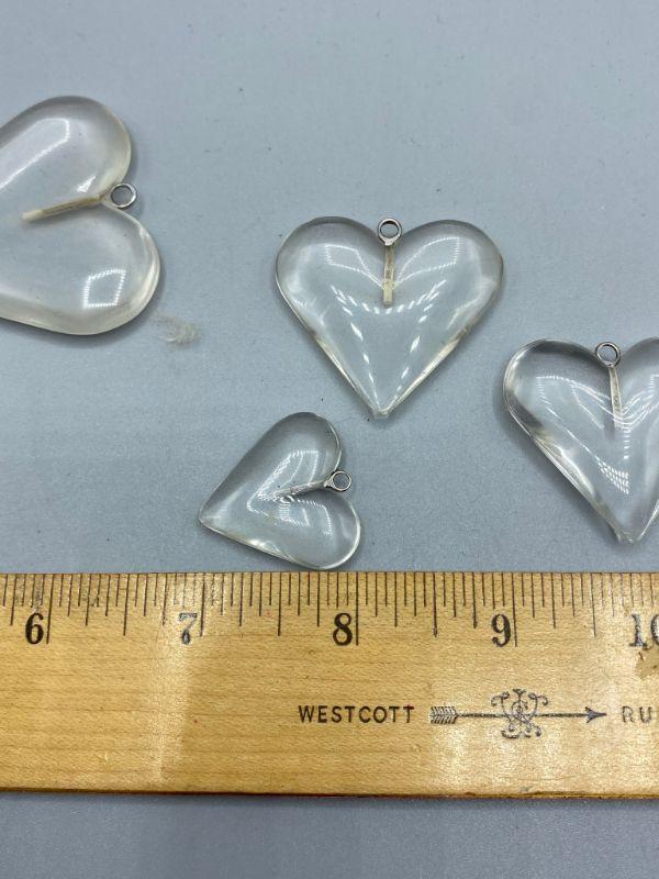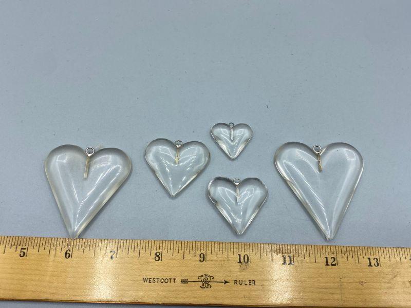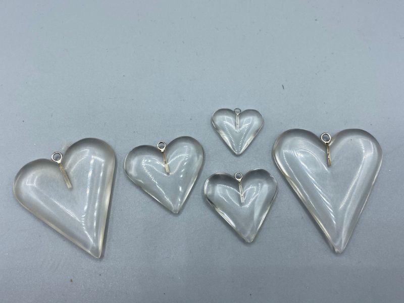 Set of 5 clear lucite pendants. Good conditions, well kept. Largest ones are about 2.5" and the smallest 1".